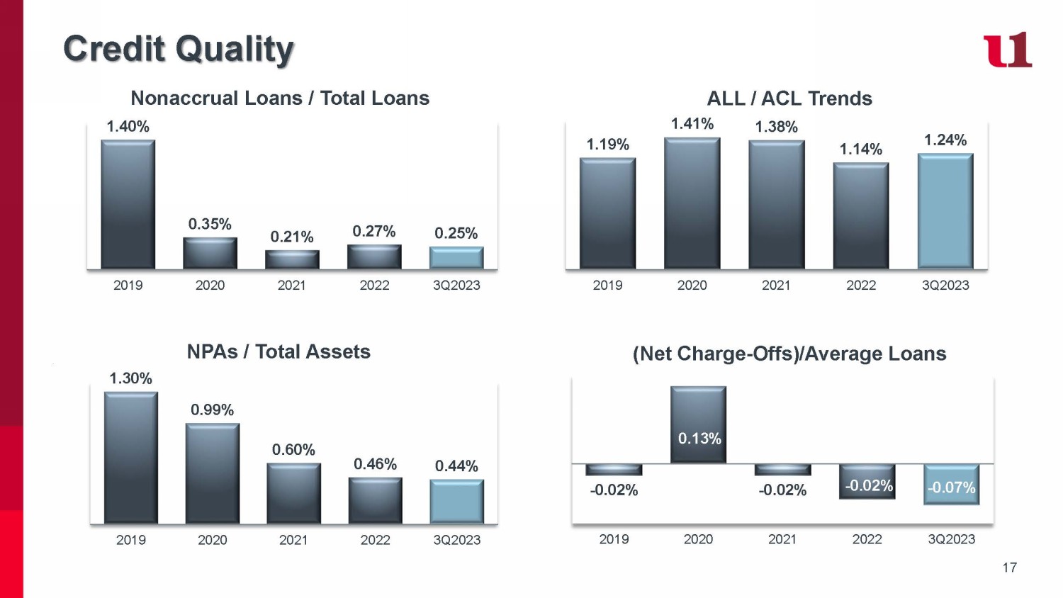 | · | The ratio of the allowance for credit losses (“ACL”) to loans outstanding was 1.24% at September 30, 2023 as compared to 1.25% at June 30, 2023 and to an allowance for loan loss (“ALL”) of 1.14% at December 31, 2022. |