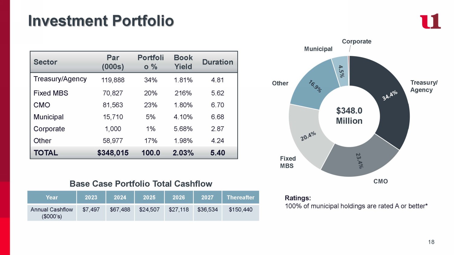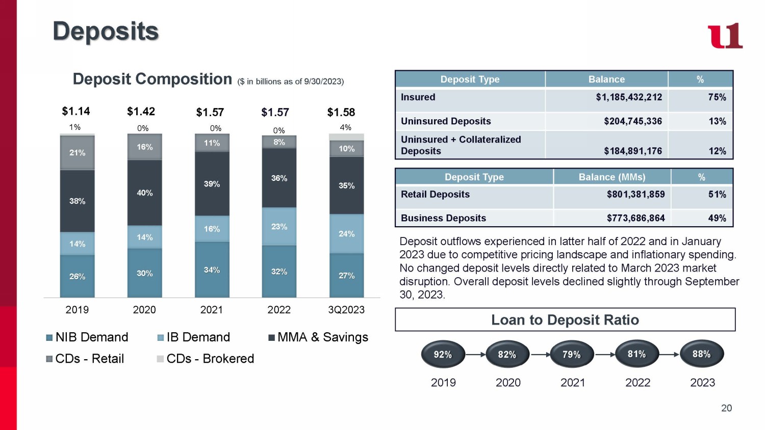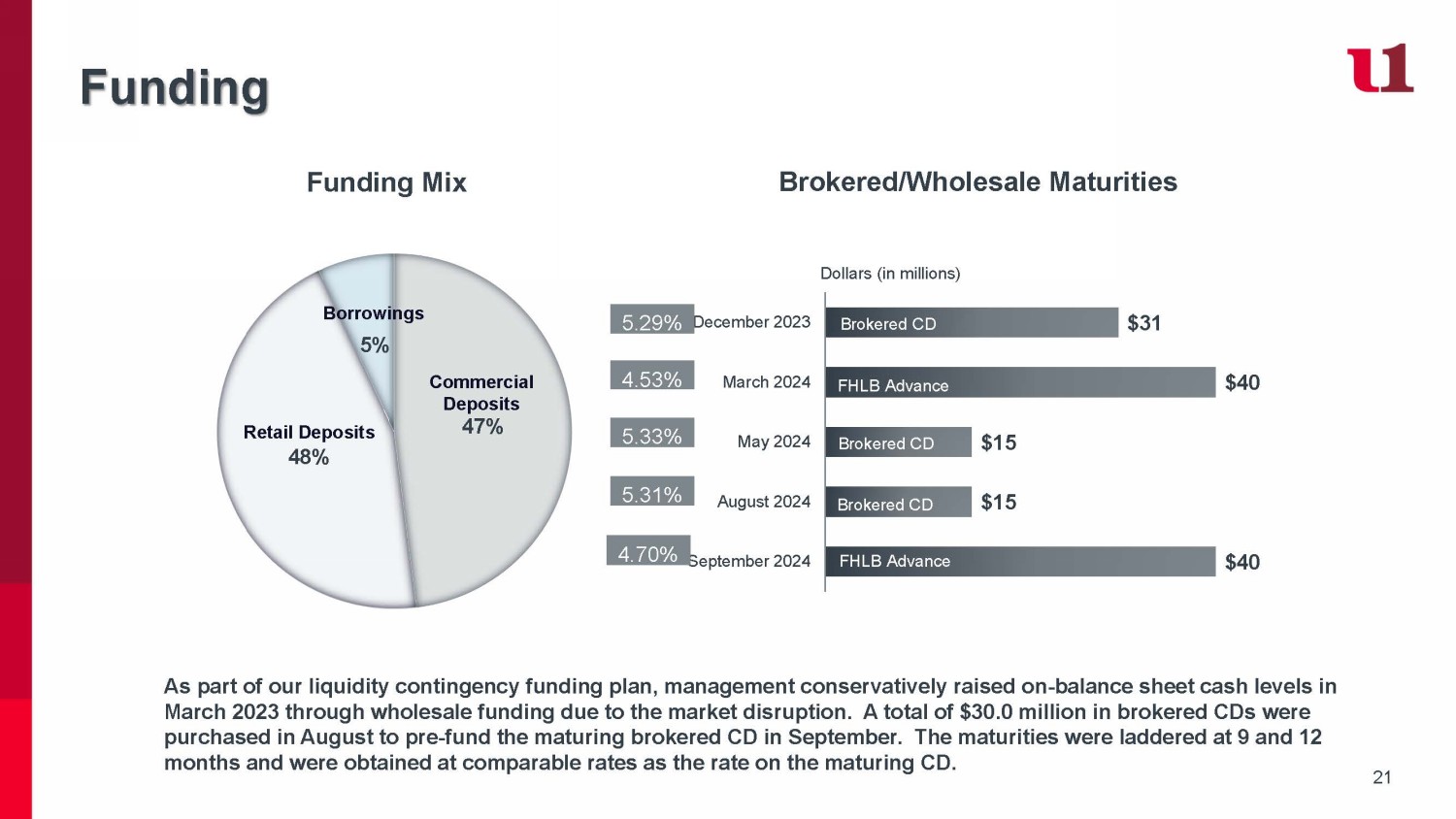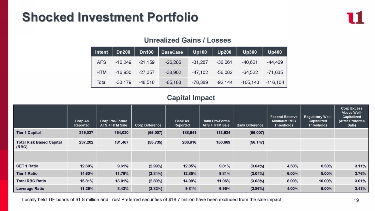 17 Credit Quality ALL / ACL Trends (Net Charge - Offs)/Average Loans - 0.02% 0.13% - 0.02% - 0.02% - 0.07% 2019 2020 2021 2022 3Q2023 Nonaccrual Loans / Total Loans 1.40% 0.35% 0.21% 0.27% 0.25% 2019 2020 2021 2022 3Q2023 NPAs / Total Assets 1.30% 0.99% 0.60% 0.46% 0.44% 2019 2020 2021 2022 3Q2023 1.19% 1.41% 1.38% 1.14% 1.24% 2019 2020 2021 2022 3Q2023 18 Investment Portfolio Sector Par (000s) Portfoli o % Book Yield Duration Treasury/Agency 119,888 34% 1.81% 4.81 Fixed MBS 70,827 20% 216% 5.62 CMO 81,563 23% 1.80% 6.70 Municipal 15,710 5% 4.10% 6.68 Corporate 1,000 1% 5.68% 2.87 Other 58,977 17% 1.98% 4.24 TOTAL $348,015 100.0 2.03% 5.40 Ratings: 100% of municipal holdings are rated A or better* $348.0 Million Year 2023 2024 2025 2026 2027 Thereafter Annual Cashflow ($000’s) $7,497 $67,488 $24,507 $27,118 $36,534 $150,440 Base Case Portfolio Total Cashflow Treasury/ Agency CMO Fixed MBS Other Municipal Corporate 19 Shocked Investment Portfolio Unrealized Gains / Losses Capital Impact Intent Dn200 Dn100 BaseCase Up100 Up200 Up300 Up400 AFS - 16,249 - 21,159 - 26,286 - 31,287 - 36,061 - 40,621 - 44,469 HTM - 16,930 - 27,357 - 38,902 - 47,102 - 56,082 - 64,522 - 71,635 Total - 33,179 - 48,516 - 65,188 - 78,389 - 92,144 - 105,143 - 116,104 Corp As Reported Corp Pro - Forma AFS + HTM Sale Corp Difference Bank As Reported Bank Pro - Forma AFS + HTM Sale Bank Difference Federal Reserve Minimum RBC Thresholds Regulatory Well - Capitalized Thresholds Corp Excess Above Well - Capitalized (After Proforma Sale) Tier 1 Capital 219,027 164,020 (55,007) 188,641 133,634 (55,007) Total Risk Based Capital (RBC) 237,202 181,467 (55,735) 206,816 150,669 (56,147) CET 1 Ratio 12.60% 9.61% (2.99%) 12.85% 9.81% (3.04%) 4.50% 6.50% 3.11% Tier 1 Ratio 14.60% 11.76% (2.84%) 12.85% 9.81% (3.04%) 6.00% 8.00% 3.76% Total RBC Ratio 15.81% 13.01% (2.80%) 14.09% 11.06% (3.03%) 8.00% 10.00% 3.01% Leverage Ratio 11.25% 8.43% (2.82%) 9.81% 6.95% (2.86%) 4.00% 5.00% 3.43% Locally held TIF bonds of $1.8 million and Trust Preferred securities of $18.7 million have been excluded from the sale impac t 20 Deposits 26% 30% 34% 32% 27% 14% 14% 16% 23% 24% 38% 40% 39% 36% 35% 21% 16% 11% 8% 10% 1% 0% 0% 0% 4% 2019 2020 2021 2022 3Q2023 NIB Demand IB Demand MMA & Savings CDs - Retail CDs - Brokered $1.57 $1.14 $1.58 $1.42 $1.57 Deposit Composition ($ in billions as of 9/30/2023) 92% 82% 79% 81% 88% Loan to Deposit Ratio 2019 2020 2021 2022 2023 Deposit outflows experienced in latter half of 2022 and in January 2023 due to competitive pricing landscape and inflationary spending.