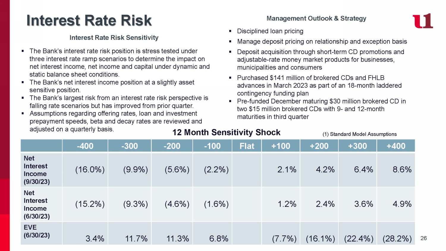 25 Liquidity Position Liquidity Sources (9/30/2023) Amount Available ($ in thousands) Amount Used ($ in thousands) Net Availability ($ in thousands) Internal Sources Excess Cash $59,301 $59,301 Unpledged Securities (BV) $59,933 $59,933 External Sources Federal Reserve (Discount Window) $11,773 $11,773 Correspondent Unsecured Lines of Credit FHLB Bank Term Funding Program* $105,000 $230,277 $86,226 $82,500 $105,000 $147,777 $86,226 Total Funding Sources $552,510 $82,500 $470,010 26 Interest Rate Risk (1) Standard Model Assumptions Interest Rate Risk Sensitivity ▪ The Bank’s interest rate risk position is stress tested under three interest rate ramp scenarios to determine the impact on net interest income, net income and capital under dynamic and static balance sheet conditions.