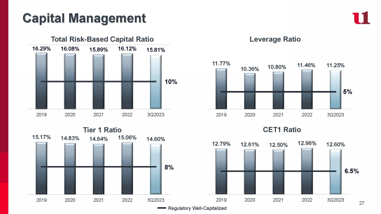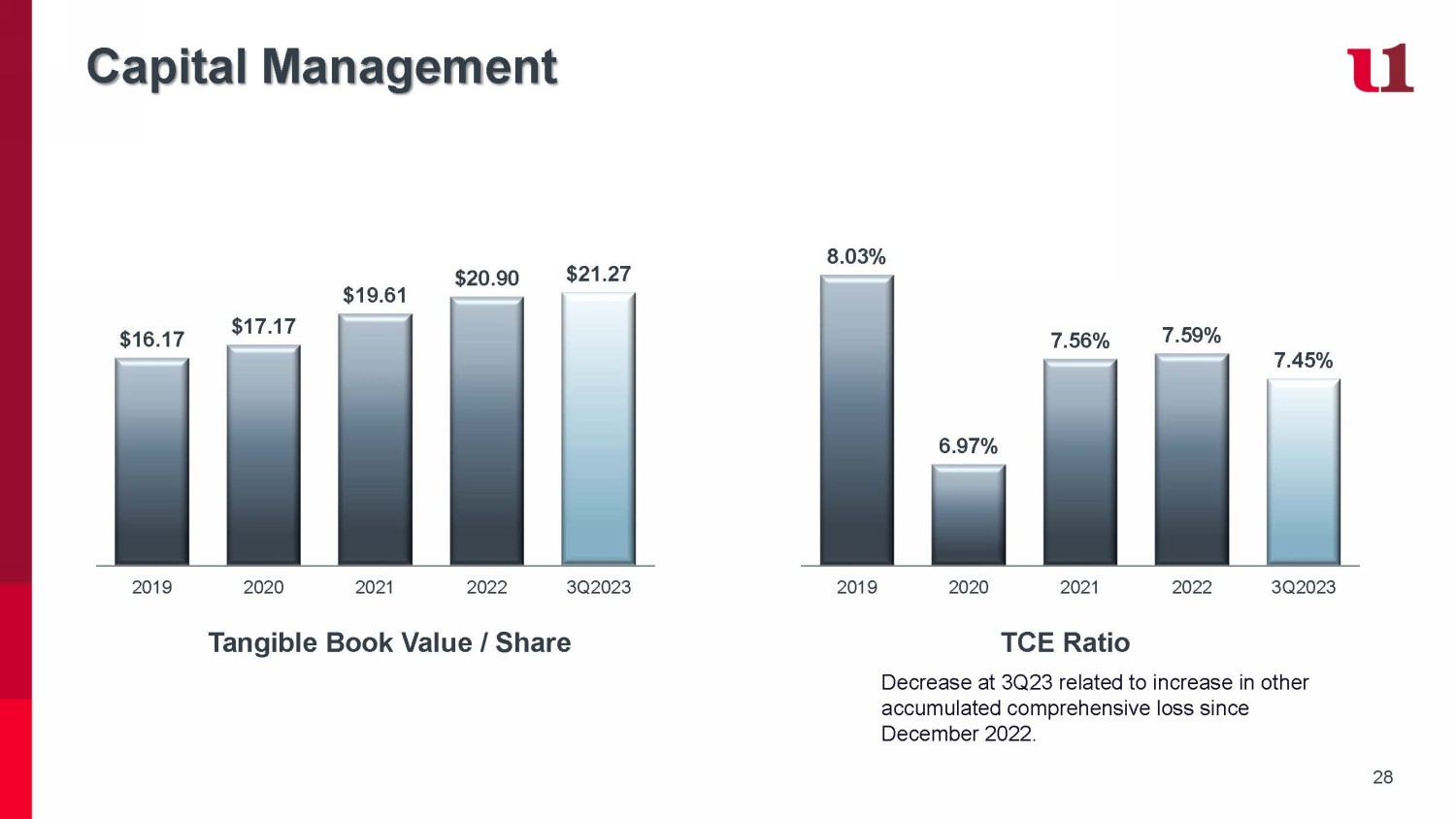▪ The Bank’s net interest income position at a slightly asset sensitive position. ▪ The Bank’s largest risk from an interest rate risk perspective is falling rate scenarios but has improved from prior quarter. ▪ Assumptions regarding offering rates, loan and investment prepayment speeds, beta and decay rates are reviewed and adjusted on a quarterly basis. Management Outlook & Strategy ▪ Disciplined loan pricing ▪ Manage deposit pricing on relationship and exception basis ▪ Deposit acquisition through short - term CD promotions and adjustable - rate money market products for businesses, municipalities and consumers ▪ Purchased $141 million of brokered CDs and FHLB advances in March 2023 as part of an 18 - month laddered contingency funding plan ▪ Pre - funded December maturing $30 million brokered CD in two $15 million brokered CDs with 9 - and 12 - month maturities in third quarter - 400 - 300 - 200 - 100 Flat +100 +200 +300 +400 Net Interest Income (9/30/23) (16.0%) (9.9%) (5.6%) (2.2%) 2.1% 4.2% 6.4% 8.6% Net Interest Income (6/30/23) (15.2%) (9.3%) (4.6%) (1.6%) 1.2% 2.4% 3.6% 4.9% EVE (6/30/23) 3.4% 11.7% 11.3% 6.8% (7.7%) (16.1%) (22.4%) (28.2%) 12 Month Sensitivity Shock (1) Standard Model Assumptions 27 Capital Management 16.29% 16.08% 15.89% 16.12% 15.81% 2019 2020 2021 2022 3Q2023 11.77% 10.36% 10.80% 11.46% 11.25% 2019 2020 2021 2022 3Q2023 12.79% 12.61% 12.50% 12.96% 12.60% 2019 2020 2021 2022 3Q2023 15.17% 14.83% 14.64% 15.06% 14.60% 2019 2020 2021 2022 3Q2023 CET1 Ratio Leverage Ratio Tier 1 Ratio Total Risk - Based Capital Ratio Regulatory Well - Capitalized 10% 5% 8% 6.5%