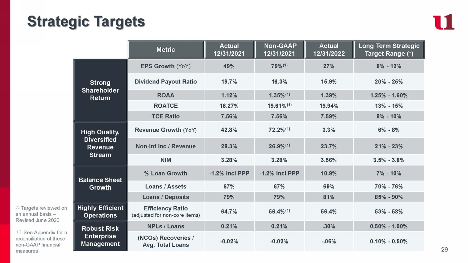 29 Strategic Targets Metric Actual 12/31/2021 Non - GAAP 12/31/2021 Actual 12/31/2022 Long Term Strategic Target Range (*) Strong Shareholder Return EPS Growth (YoY) 49% 79% (1) 27% 8% - 12% Dividend Payout Ratio 19.7% 16.3% 15.9% 20% - 25% ROAA 1.12% 1.35% (1) 1.39% 1.25% - 1.60% ROATCE 16.27% 19.61% (1) 19.94% 13% - 15% TCE Ratio 7.56% 7.56% 7.59% 8% - 10% High Quality, Diversified Revenue Stream Revenue Growth (YoY) 42.8% 72.2% (1) 3.3% 6% - 8% Non - Int Inc / Revenue 28.3% 26.9% (1) 23.7% 21% - 23% N IM 3.28% 3.28% 3.56% 3.5% - 3.8% Balance Sheet Growth % Loan Growth - 1.2% incl PPP - 1.2% incl PPP 10.9% 7% - 10% Loans / Assets 67% 67% 69% 70% - 76% Loans / Deposits 79% 79% 81% 85% - 90% Highly Efficient Operations Efficiency Ratio (adjusted for non - core items) 64.7% 56.4% (1) 56.4% 53% - 58% Robust Risk Enterprise Management NPLs / Loans 0.21% 0.21% .30% 0.50% - 1.00% (NCOs) Recoveries / Avg. Total Loans - 0.02% - 0.02% - .06% 0.10% - 0.50% (*) Targets reviewed on an annual basis – Revised June 2023 (1) See Appendix for a reconciliation of these non - GAAP financial measures Strong Investor Relations & Shareholder Engagement Members of the Board and senior management routinely engage with shareholders and other stakeholders, and management regularly updates the Board in the context of ongoing investor discussions.