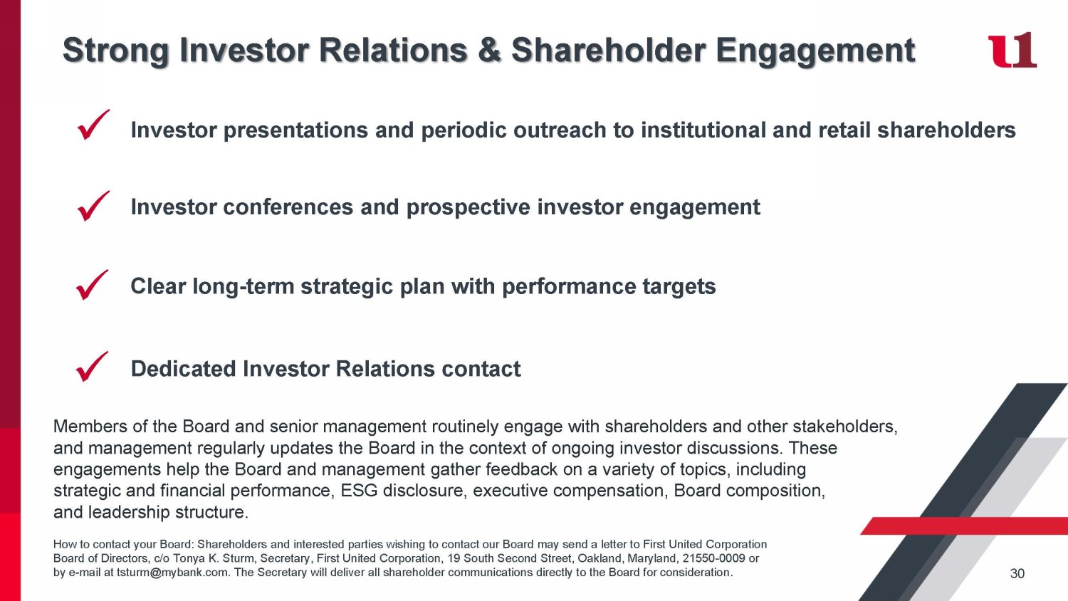 These engagements help the Board and management gather feedback on a variety of topics, including strategic and financial performance, ESG disclosure, executive compensation, Board composition, and leadership structure. Clear long - term strategic plan with performance targets x Dedicated Investor Relations contact x Investor conferences and prospective investor engagement x Investor presentations and periodic outreach to institutional and retail shareholders x 30 How to contact your Board: Shareholders and interested parties wishing to contact our Board may send a letter to First United Co rporation Board of Directors, c/o Tonya K. Sturm, Secretary, First United Corporation, 19 South Second Street, Oakland, Maryland, 21550 - 00 09 or by e - mail at tsturm@mybank.com. The Secretary will deliver all shareholder communications directly to the Board for consideratio n.