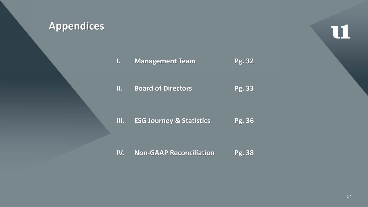 31 I. II. III. IV. Management Team Board of Directors ESG Journey & Statistics Non - GAAP Reconciliation Pg. 32 Pg. 33 Pg. 36 Pg.