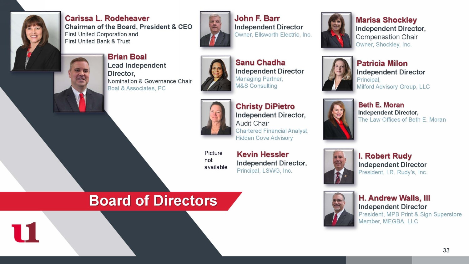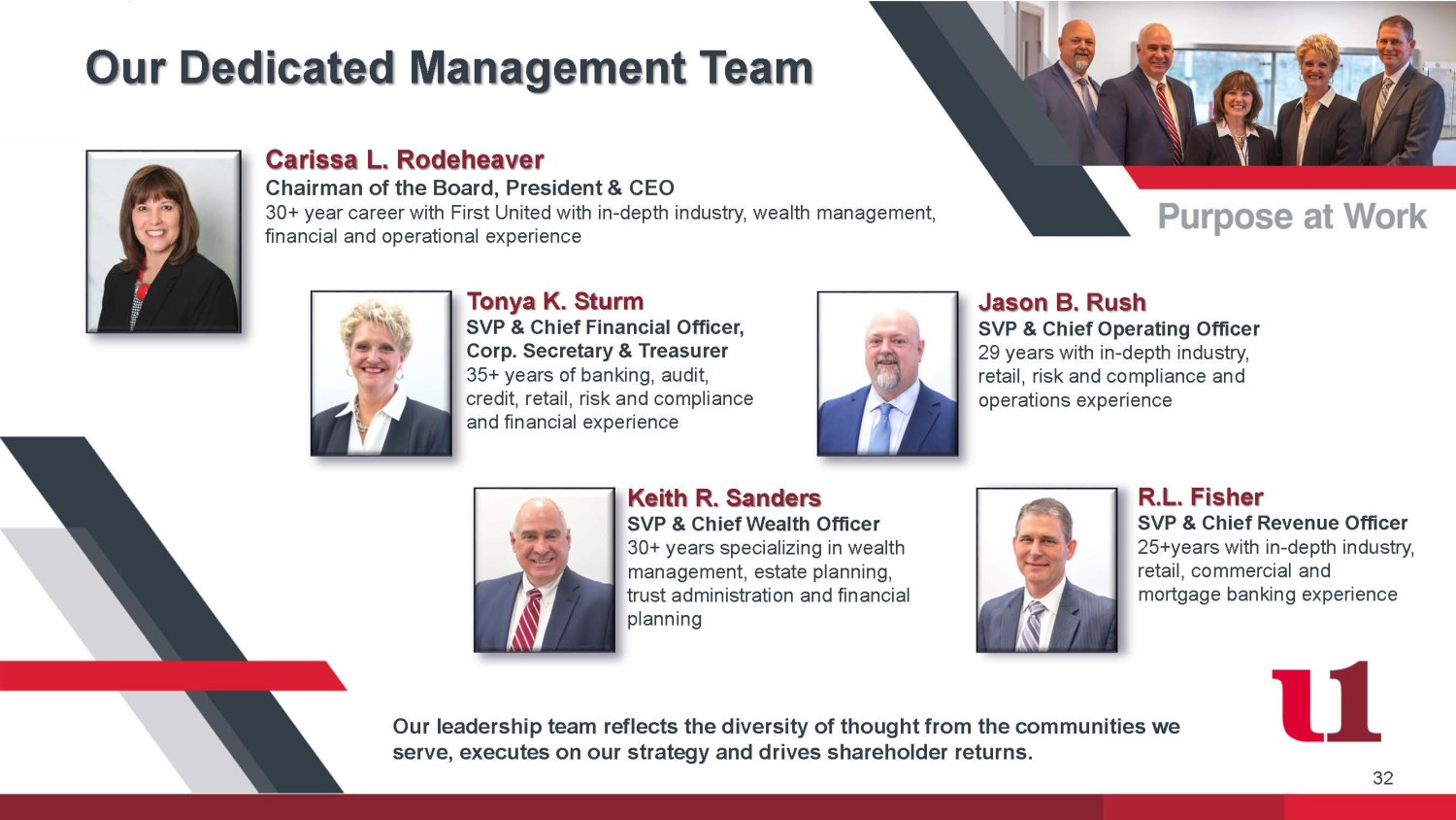 38 Appendices 32 Our Dedicated Management Team Carissa L. Rodeheaver Chairman of the Board, President & CEO 30+ year career with First United with in - depth industry, wealth management, financial and operational experience Jason B. Rush SVP & Chief Operating Officer 29 years with in - depth industry, retail, risk and compliance and operations experience Tonya K. Sturm SVP & Chief Financial Officer, Corp. Secretary & Treasurer 35+ years of banking, audit, credit, retail, risk and compliance and financial experience R.L. Fisher SVP & Chief Revenue Officer 25+years with in - depth industry, retail, commercial and mortgage banking experience Keith R. Sanders SVP & Chief Wealth Officer 30+ years specializing in wealth management, estate planning, trust administration and financial planning Our leadership team reflects the diversity of thought from the communities we serve, executes on our strategy and drives shareholder returns.