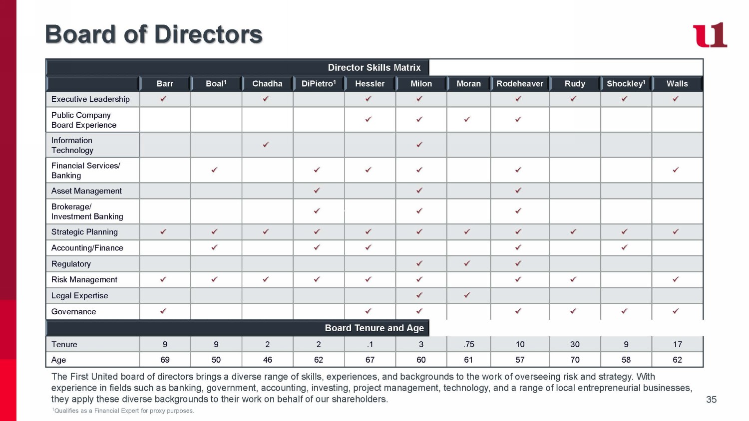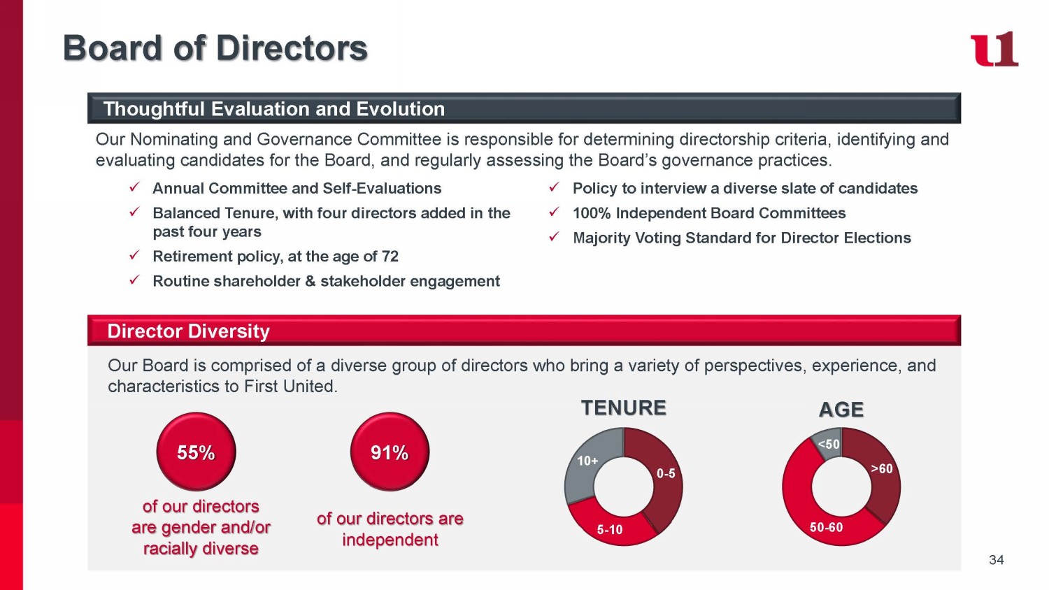 33 33 John F. Barr Independent Director Owner, Ellsworth Electric, Inc. Sanu Chadha Independent Director Managing Partner, M&S Consulting Christy DiPietro Independent Director, Audit Chair Chartered Financial Analyst, Hidden Cove Advisory Patricia Milon Independent Director Principal, Milford Advisory Group, LLC I. Robert Rudy Independent Director President, I.R. Rudy’s, Inc. Marisa Shockley Independent Director , Compensation Chair Owner, Shockley, Inc. H. Andrew Walls, III Independent Director President, MPB Print & Sign Superstore Member, MEGBA, LLC Beth E. Moran Independent Director, The Law Offices of Beth E. Moran Brian Boal Lead Independent Director, Nomination & Governance Chair Boal & Associates, PC Carissa L. Rodeheaver Chairman of the Board, President & CEO First United Corporation and First United Bank & Trust Board of Directors Kevin Hessler Independent Director , Principal, LSWG, Inc. Picture not available 34 Board of Directors Thoughtful Evaluation and Evolution Our Board is comprised of a diverse group of directors who bring a variety of perspectives, experience, and characteristics to First United.