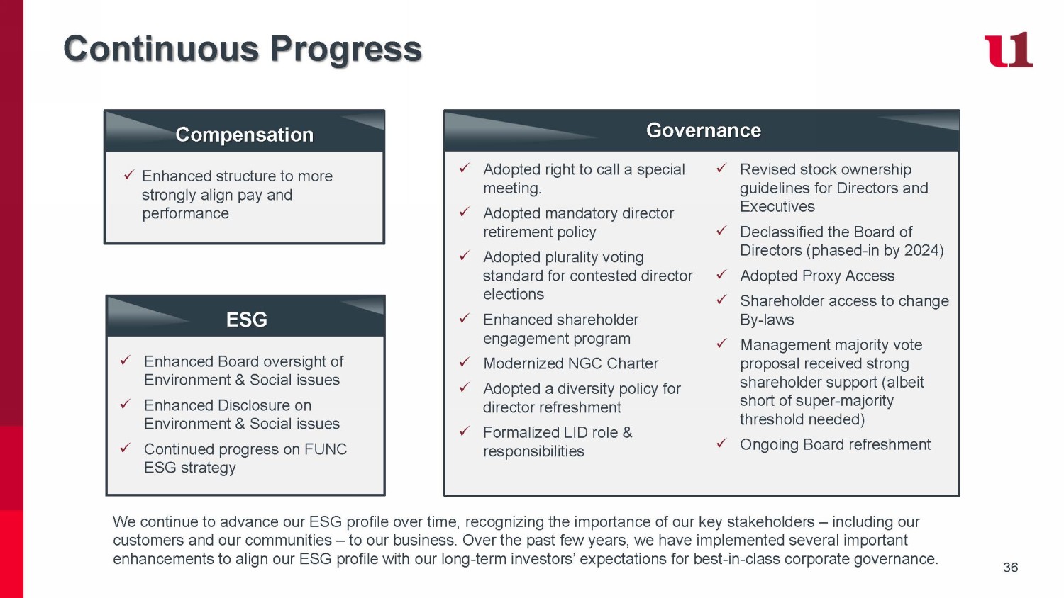 Over the past few years, we have implemented several important enhancements to align our ESG profile with our long - term investors’ expectations for best - in - class corporate governance. x Enhanced structure to more strongly align pay and performance Compensation x Enhanced Board oversight of Environment & Social issues x Enhanced Disclosure on Environment & Social issues x Continued progress on FUNC ESG strategy ESG Governance x Revised stock ownership guidelines for Directors and Executives x Declassified the Board of Directors (phased - in by 2024) x Adopted Proxy Access x Shareholder access to change By - laws x Management majority vote proposal received strong shareholder support (albeit short of super - majority threshold needed) x Ongoing Board refreshment x Adopted right to call a special meeting.