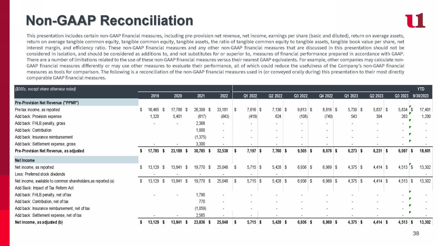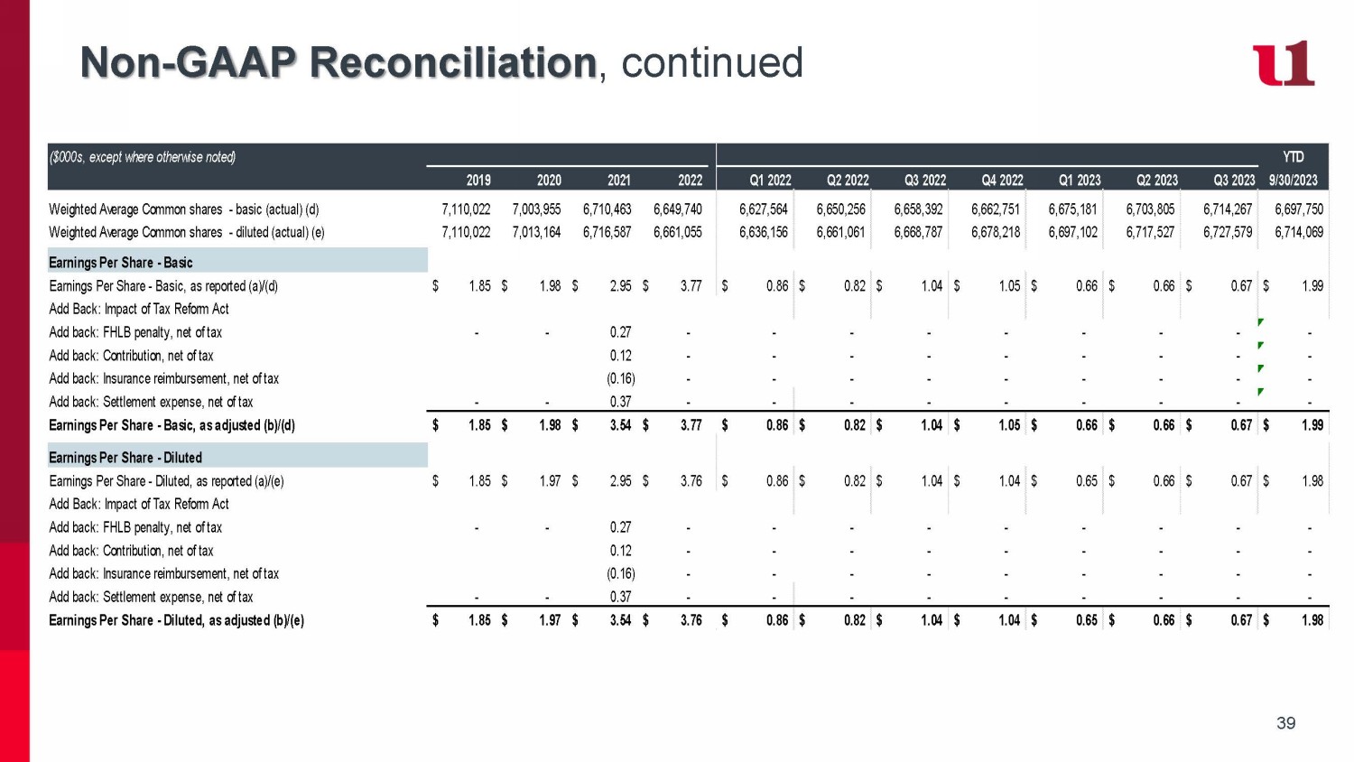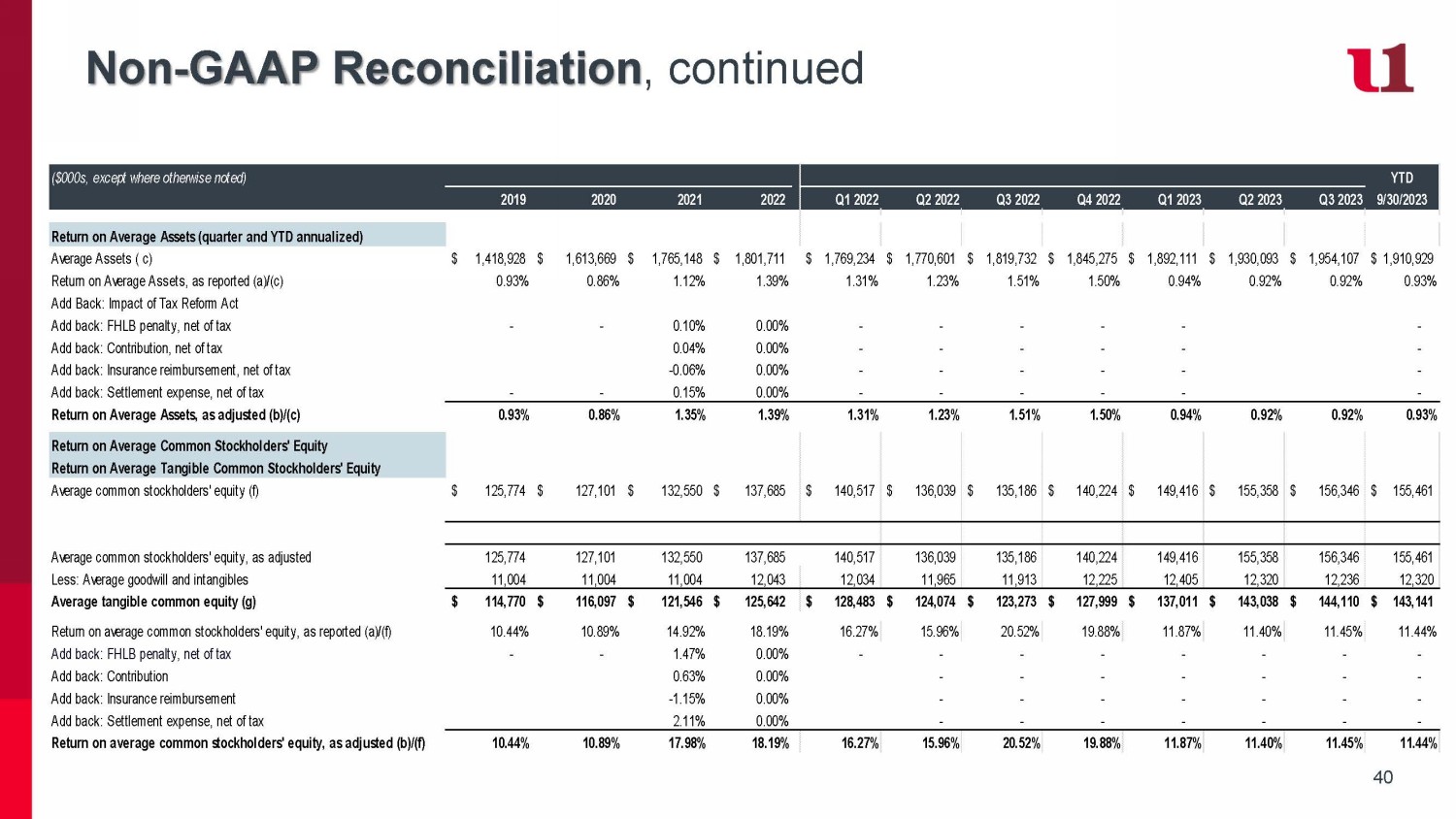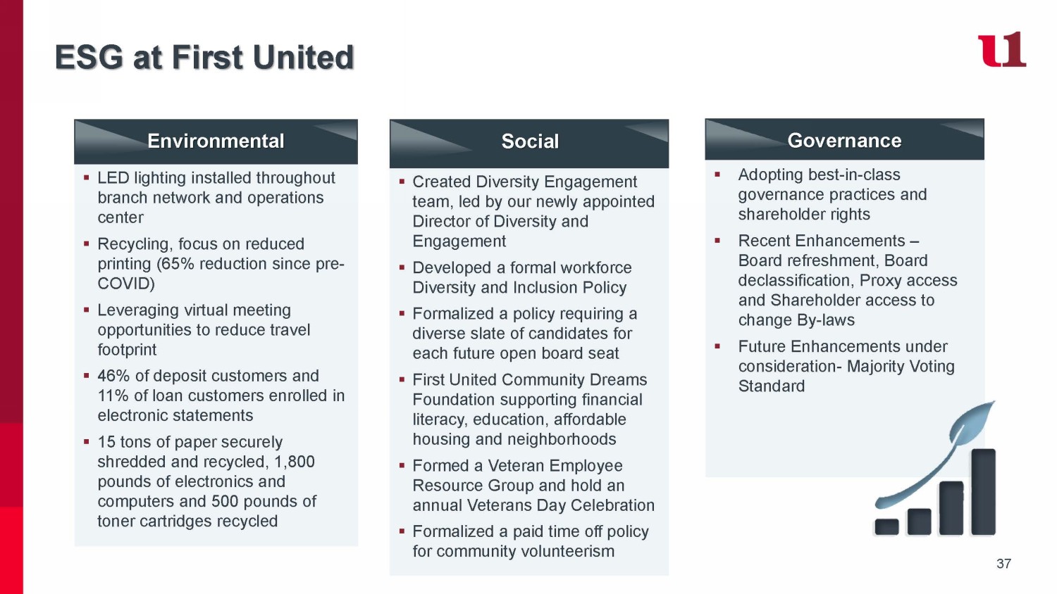 x Adopted mandatory director retirement policy x Adopted plurality voting standard for contested director elections x Enhanced shareholder engagement program x Modernized NGC Charter x Adopted a diversity policy for director refreshment x Formalized LID role & responsibilities 37 ESG at First United ▪ LED lighting installed throughout branch network and operations center ▪ Recycling, focus on reduced printing (65% reduction since pre - COVID) ▪ Leveraging virtual meeting opportunities to reduce travel footprint ▪ 46% of deposit customers and 11% of loan customers enrolled in electronic statements ▪ 15 tons of paper securely shredded and recycled, 1,800 pounds of electronics and computers and 500 pounds of toner cartridges recycled Environmental ▪ Created Diversity Engagement team, led by our newly appointed Director of Diversity and Engagement ▪ Developed a formal workforce Diversity and Inclusion Policy ▪ Formalized a policy requiring a diverse slate of candidates for each future open board seat ▪ First United Community Dreams Foundation supporting financial literacy, education, affordable housing and neighborhoods ▪ Formed a Veteran Employee Resource Group and hold an annual Veterans Day Celebration ▪ Formalized a paid time off policy for community volunteerism Social ▪ Adopting best - in - class governance practices and shareholder rights ▪ Recent Enhancements – Board refreshment, Board declassification, Proxy access and Shareholder access to change By - laws ▪ Future Enhancements under consideration - Majority Voting Standard Governance 38 This presentation includes certain non - GAAP financial measures, including pre - provision net revenue, net income, earnings per share (basic and diluted), return on average assets, return on average tangible common equity, tangible common equity, tangible assets, the ratio of tangible common equity to tangible assets, tangible book value per share, net interest margin, and efficiency ratio . These non - GAAP financial measures and any other non - GAAP financial measures that are discussed in this presentation should not be considered in isolation, and should be considered as additions to, and not substitutes for or superior to, measures of financial performance prepared in accordance with GAAP . There are a number of limitations related to the use of these non - GAAP financial measures versus their nearest GAAP equivalents . For example, other companies may calculate non - GAAP financial measures differently or may use other measures to evaluate their performance, all of which could reduce the usefulness of the Company’s non - GAAP financial measures as tools for comparison . The following is a reconciliation of the non - GAAP financial measures used in (or conveyed orally during) this presentation to their most directly comparable GAAP financial measures . Non - GAAP Reconciliation ($000s, except where otherwise noted) YTD 2019 2020 2021 2022 Q1 2022 Q2 2022 Q3 2022 Q4 2022 Q1 2023 Q2 2023 Q3 2023 9/30/2023 Pre-Provision Net Revenue ("PPNR") Pre-tax income, as reported 16,465$ 17,788$ 26,309$ 33,181$ 7,616$ 7,136$ 9,613$ 8,816$ 5,730$ 5,837$ 5,834$ 17,401$ Add back: Provision expense 1,320 5,401 (817) (643) (419) 624 (108) (740) 543 394 263 1,200 Add back: FHLB penalty, gross - - 2,368 - - - - - - - - - Add back: Contribution 1,000 - - - - - - - - - Add back: Insurance reimbursement (1,375) - - - - - - - - - Add back: Settlement expense, gross - - 3,300 - - - - - - - - - Pre-Provision Net Revenue, as adjusted 17,785$ 23,189$ 30,785$ 32,538$ 7,197$ 7,760$ 9,505$ 8,076$ 6,273$ 6,231$ 6,097$ 18,601$ Net Income Net income, as reported 13,129$ 13,841$ 19,770$ 25,048$ 5,715$ 5,428$ 6,936$ 6,969$ 4,375$ 4,414$ 4,513$ 13,302$ Less: Preferred stock dividends - - - - - - - Net income, available to common shareholders,as reported (a) 13,129$ 13,841$ 19,770$ 25,048$ 5,715$ 5,428$ 6,936$ 6,969$ 4,375$ 4,414$ 4,513$ 13,302$ Add Back: Impact of Tax Reform Act Add back: FHLB penalty, net of tax - - 1,790 - - - - - - - - - Add back: Contribution, net of tax 770 - - - - - - - - - Add back: Insurance reimbursement, net of tax (1,059) - - - - - - - - - Add back: Settlement expense, net of tax - - 2,565 - - - - - - - - - Net income, as adjusted (b) 13,129$ 13,841$ 23,836$ 25,048$ 5,715$ 5,428$ 6,936$ 6,969$ 4,375$ 4,414$ 4,513$ 13,302$ 39 Non - GAAP Reconciliation , continued ($000s, except where otherwise noted) YTD 2019 2020 2021 2022 Q1 2022 Q2 2022 Q3 2022 Q4 2022 Q1 2023 Q2 2023 Q3 2023 9/30/2023 Weighted Average Common shares - basic (actual) (d) 7,110,022 7,003,955 6,710,463 6,649,740 6,627,564 6,650,256 6,658,392 6,662,751 6,675,181 6,703,805 6,714,267 6,697,750 Weighted Average Common shares - diluted (actual) (e) 7,110,022 7,013,164 6,716,587 6,661,055 6,636,156 6,661,061 6,668,787 6,678,218 6,697,102 6,717,527 6,727,579 6,714,069 Earnings Per Share - Basic Earnings Per Share - Basic, as reported (a)/(d) 1.85$ 1.98$ 2.95$ 3.77$ 0.86$ 0.82$ 1.04$ 1.05$ 0.66$ 0.66$ 0.67$ 1.99$ Add Back: Impact of Tax Reform Act Add back: FHLB penalty, net of tax - - 0.27 - - - - - - - - - Add back: Contribution, net of tax 0.12 - - - - - - - - - Add back: Insurance reimbursement, net of tax (0.16) - - - - - - - - - Add back: Settlement expense, net of tax - - 0.37 - - - - - - - - - Earnings Per Share - Basic, as adjusted (b)/(d) 1.85$ 1.98$ 3.54$ 3.77$ 0.86$ 0.82$ 1.04$ 1.05$ 0.66$ 0.66$ 0.67$ 1.99$ Earnings Per Share - Diluted Earnings Per Share - Diluted, as reported (a)/(e) 1.85$ 1.97$ 2.95$ 3.76$ 0.86$ 0.82$ 1.04$ 1.04$ 0.65$ 0.66$ 0.67$ 1.98$ Add Back: Impact of Tax Reform Act Add back: FHLB penalty, net of tax - - 0.27 - - - - - - - - - Add back: Contribution, net of tax 0.12 - - - - - - - - - Add back: Insurance reimbursement, net of tax (0.16) - - - - - - - - - Add back: Settlement expense, net of tax - - 0.37 - - - - - - - - - Earnings Per Share - Diluted, as adjusted (b)/(e) 1.85$ 1.97$ 3.54$ 3.76$ 0.86$ 0.82$ 1.04$ 1.04$ 0.65$ 0.66$