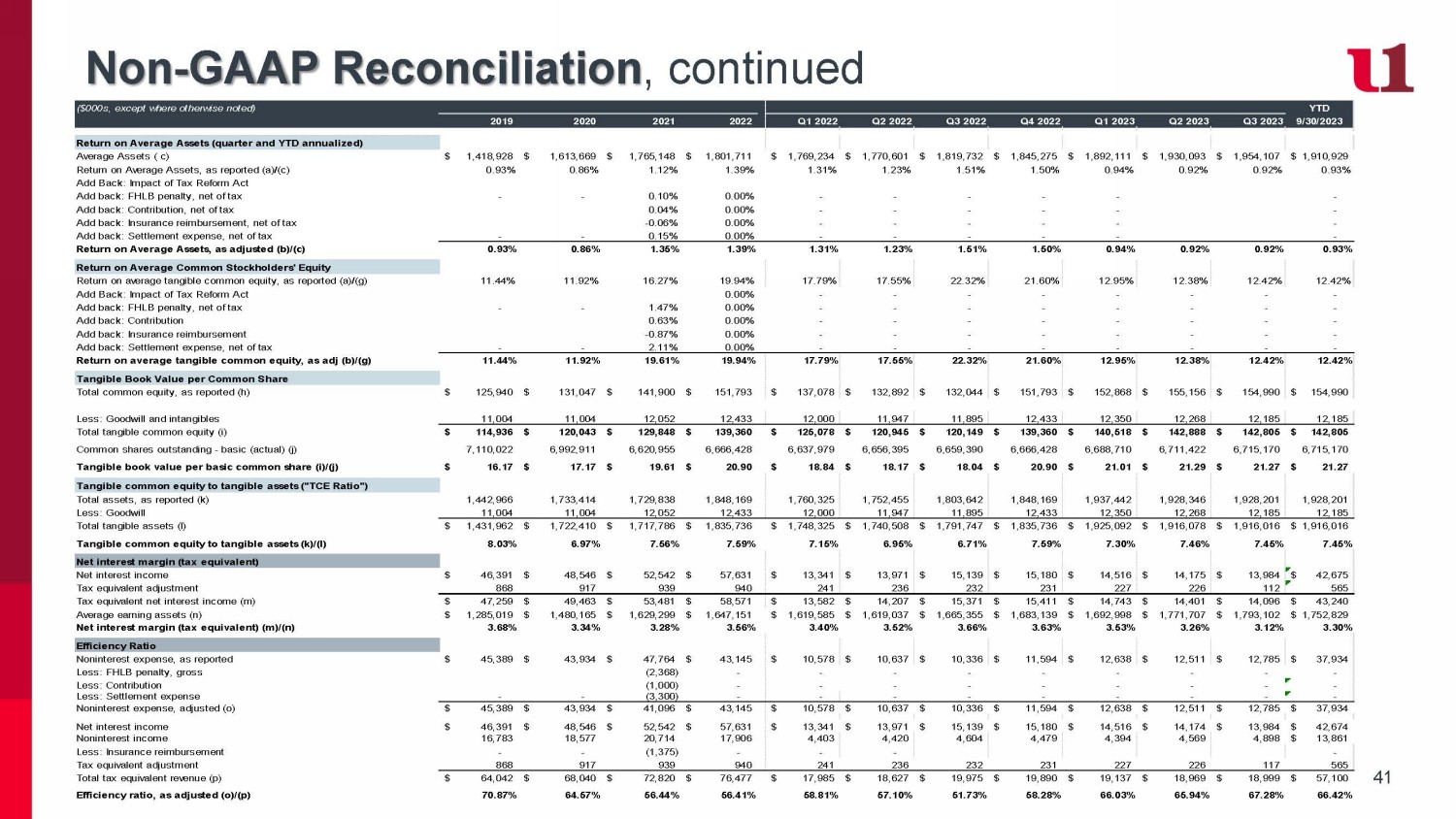 40 Non - GAAP Reconciliation , continued ($000s, except where otherwise noted) YTD 2019 2020 2021 2022 Q1 2022 Q2 2022 Q3 2022 Q4 2022 Q1 2023 Q2 2023 Q3 2023 9/30/2023 Return on Average Assets (quarter and YTD annualized) Average Assets ( c) 1,418,928$ 1,613,669$ 1,765,148$ 1,801,711$ 1,769,234$ 1,770,601$ 1,819,732$ 1,845,275$ 1,892,111$ 1,930,093$ 1,954,107$ 1,910,929$ Return on Average Assets, as reported (a)/(c) 0.93% 0.86% 1.12% 1.39% 1.31% 1.23% 1.51% 1.50% 0.94% 0.92% 0.92% 0.93% Add Back: Impact of Tax Reform Act Add back: FHLB penalty, net of tax - - 0.10% 0.00% - - - - - - Add back: Contribution, net of tax 0.04% 0.00% - - - - - - Add back: Insurance reimbursement, net of tax -0.06% 0.00% - - - - - - Add back: Settlement expense, net of tax - - 0.15% 0.00% - - - - - - Return on Average Assets, as adjusted (b)/(c) 0.93% 0.86% 1.35% 1.39% 1.31% 1.23% 1.51% 1.50% 0.94% 0.92% 0.92% 0.93% Return on Average Common Stockholders' Equity Return on Average Tangible Common Stockholders' Equity Average common stockholders' equity (f) 125,774$ 127,101$ 132,550$ 137,685$ 140,517$ 136,039$ 135,186$ 140,224$ 149,416$ 155,358$ 156,346$ 155,461$ Average common stockholders' equity, as adjusted 125,774 127,101 132,550 137,685 140,517 136,039 135,186 140,224 149,416 155,358 156,346 155,461 Less: Average goodwill and intangibles 11,004 11,004 11,004 12,043 12,034 11,965 11,913 12,225 12,405 12,320 12,236 12,320 Average tangible common equity (g) 114,770$ 116,097$ 121,546$ 125,642$ 128,483$ 124,074$ 123,273$ 127,999$ 137,011$ 143,038$ 144,110$ 143,141$ Return on average common stockholders' equity, as reported (a)/(f) 10.44% 10.89% 14.92% 18.19% 16.27% 15.96% 20.52% 19.88% 11.87% 11.40% 11.45% 11.44% Add back: FHLB penalty, net of tax - - 1.47% 0.00% - - - - - - - - Add back: Contribution 0.63% 0.00% - - - - - - - Add back: Insurance reimbursement -1.15% 0.00% - - - - - - - Add back: Settlement expense, net of tax 2.11% 0.00% - - - - - - - Return on average common stockholders' equity, as adjusted (b)/(f) 10.44% 10.89% 17.98% 18.19% 16.27% 15.96% 20.52% 19.88% 11.87% 11.40% 11.45% 11.44% 41 Non - GAAP Reconciliation , continued ($000s, except where otherwise noted) YTD 2019 2020 2021 2022 Q1 2022 Q2 2022 Q3 2022 Q4 2022 Q1 2023 Q2 2023 Q3 2023 9/30/2023 Return on Average Assets (quarter and YTD annualized) Average Assets ( c) 1,418,928$ 1,613,669$ 1,765,148$ 1,801,711$ 1,769,234$ 1,770,601$ 1,819,732$ 1,845,275$ 1,892,111$ 1,930,093$ 1,954,107$ 1,910,929$ Return on Average Assets, as reported (a)/(c) 0.93% 0.86% 1.12% 1.39% 1.31% 1.23% 1.51% 1.50% 0.94% 0.92% 0.92% 0.93% Add Back: Impact of Tax Reform Act Add back: FHLB penalty, net of tax - - 0.10% 0.00% - - - - - - Add back: Contribution, net of tax 0.04% 0.00% - - - - - - Add back: Insurance reimbursement, net of tax -0.06% 0.00% - - - - - - Add back: Settlement expense, net of tax - - 0.15% 0.00% - - - - - - Return on Average Assets, as adjusted (b)/(c) 0.93% 0.86% 1.35% 1.39% 1.31% 1.23% 1.51% 1.50% 0.94% 0.92% 0.92% 0.93% Return on Average Common Stockholders' Equity Return on average tangible common equity, as reported (a)/(g) 11.44% 11.92% 16.27% 19.94% 17.79% 17.55% 22.32% 21.60% 12.95% 12.38% 12.42% 12.42% Add Back: Impact of Tax Reform Act 0.00% - - - - - - - - Add back: FHLB penalty, net of tax - - 1.47% 0.00% - - - - - - - - Add back: Contribution 0.63% 0.00% - - - - - - - - Add back: Insurance reimbursement -0.87% 0.00% - - - - - - - - Add back: Settlement expense, net of tax - - 2.11% 0.00% - - - - - - - - Return on average tangible common equity, as adj (b)/(g) 11.44% 11.92% 19.61% 19.94% 17.79% 17.55% 22.32% 21.60% 12.95% 12.38% 12.42% 12.42% Tangible Book Value per Common Share Total common equity, as reported (h) 125,940$ 131,047$ 141,900$ 151,793$ 137,078$ 132,892$ 132,044$ 151,793$ 152,868$ 155,156$ 154,990$ 154,990$ Less: Goodwill and intangibles 11,004 11,004 12,052 12,433 12,000 11,947 11,895 12,433 12,350 12,268 12,185 12,185 Total tangible common equity (i) 114,936$ 120,043$ 129,848$ 139,360$ 125,078$ 120,945$ 120,149$ 139,360$ 140,518$ 142,888$ 142,805$ 142,805$ Common shares outstanding - basic (actual) (j) 7,110,022 6,992,911 6,620,955 6,666,428 6,637,979 6,656,395 6,659,390 6,666,428 6,688,710 6,711,422 6,715,170 6,715,170 Tangible book value per basic common share (i)/(j) 16.17$ 17.17$ 19.61$ 20.90$ 18.84$ 18.17$ 18.04$ 20.90$ 21.01$ 21.29$ 21.27$ 21.27$ Tangible common equity to tangible assets ("TCE Ratio") Total assets, as reported (k) 1,442,966 1,733,414 1,729,838 1,848,169 1,760,325 1,752,455 1,803,642 1,848,169 1,937,442 1,928,346 1,928,201 1,928,201 Less: Goodwill 11,004 11,004 12,052 12,433 12,000 11,947 11,895 12,433 12,350 12,268 12,185 12,185 Total tangible assets (l) 1,431,962$ 1,722,410$ 1,717,786$ 1,835,736$ 1,748,325$ 1,740,508$ 1,791,747$ 1,835,736$ 1,925,092$ 1,916,078$ 1,916,016$ 1,916,016$ Tangible common equity to tangible assets (k)/(l) 8.03% 6.97% 7.56% 7.59% 7.15% 6.95% 6.71% 7.59% 7.30% 7.46% 7.45% 7.45% Net interest margin (tax equivalent) Net interest income 46,391$ 48,546$ 52,542$ 57,631$ 13,341$ 13,971$ 15,139$ 15,180$ 14,516$ 14,175$ 13,984$ 42,675$ Tax equivalent adjustment 868 917 939 940 241 236 232 231 227 226 112 565 Tax equivalent net interest income (m) 47,259$ 49,463$ 53,481$ 58,571$ 13,582$ 14,207$ 15,371$ 15,411$ 14,743$ 14,401$ 14,096$ 43,240$ Average earning assets (n) 1,285,019$ 1,480,165$ 1,629,299$ 1,647,151$ 1,619,585$ 1,619,037$ 1,665,355$ 1,683,139$ 1,692,998$ 1,771,707$ 1,793,102$ 1,752,829$ Net interest margin (tax equivalent) (m)/(n) 3.68% 3.34% 3.28% 3.56% 3.40% 3.52% 3.66% 3.63% 3.53% 3.26% 3.12% 3.30% Efficiency Ratio Noninterest expense, as reported 45,389$ 43,934$ 47,764$ 43,145$ 10,578$ 10,637$ 10,336$ 11,594$ 12,638$ 12,511$ 12,785$ 37,934$ Less: FHLB penalty, gross (2,368) - - - - - - - - - Less: Contribution (1,000) - - - - - - - - - Less: Settlement expense - - (3,300) - - - - - - - - - Noninterest expense, adjusted (o) 45,389$ 43,934$ 41,096$ 43,145$ 10,578$