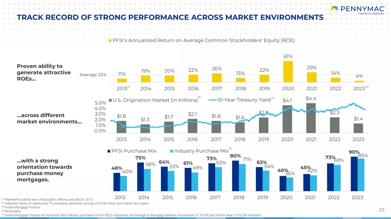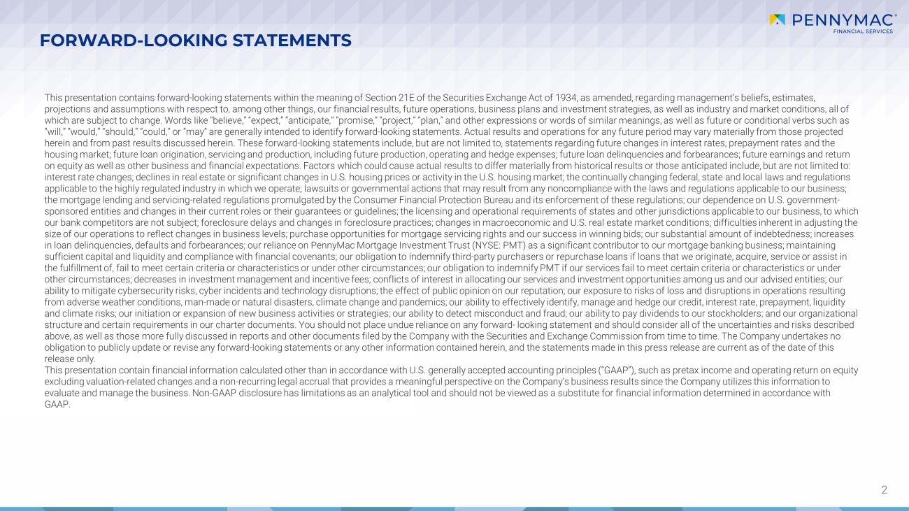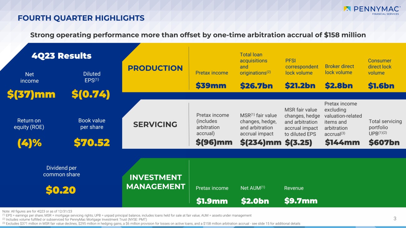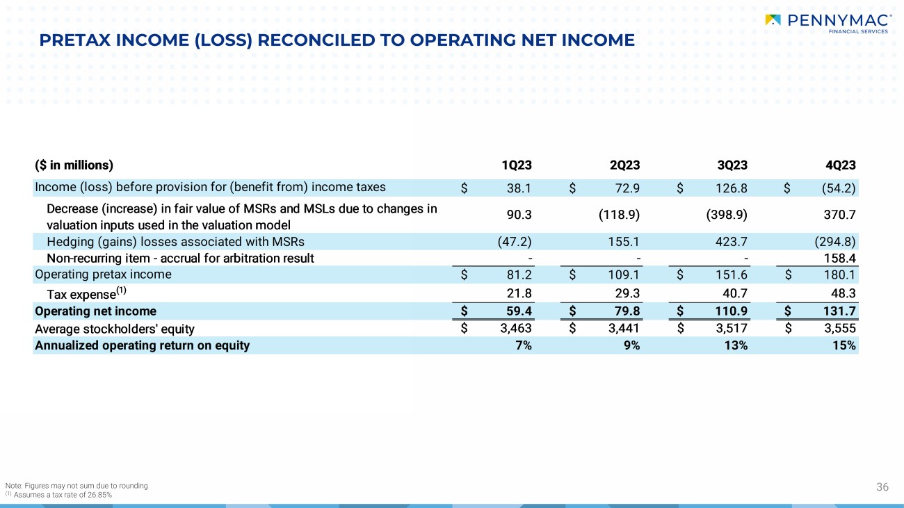 「ペニーマック・ファイナンシャルの第 4 四半期の自己資本営業利益率は年率 15%1 となり、当 社にとって素晴らしい 1 年の集大成となりました。「第4四半期の純損失は、主にブラックナイト社との長期にわたる仲裁の裁定に関連した一時的な発生によるものです。最終的な判決には同意できませんが、業界をリードするサービシング・システムの所有権を保持し、顧客と利害関係者の利益のために適切と思われるように活用できることを非常に喜ばしく思っています。