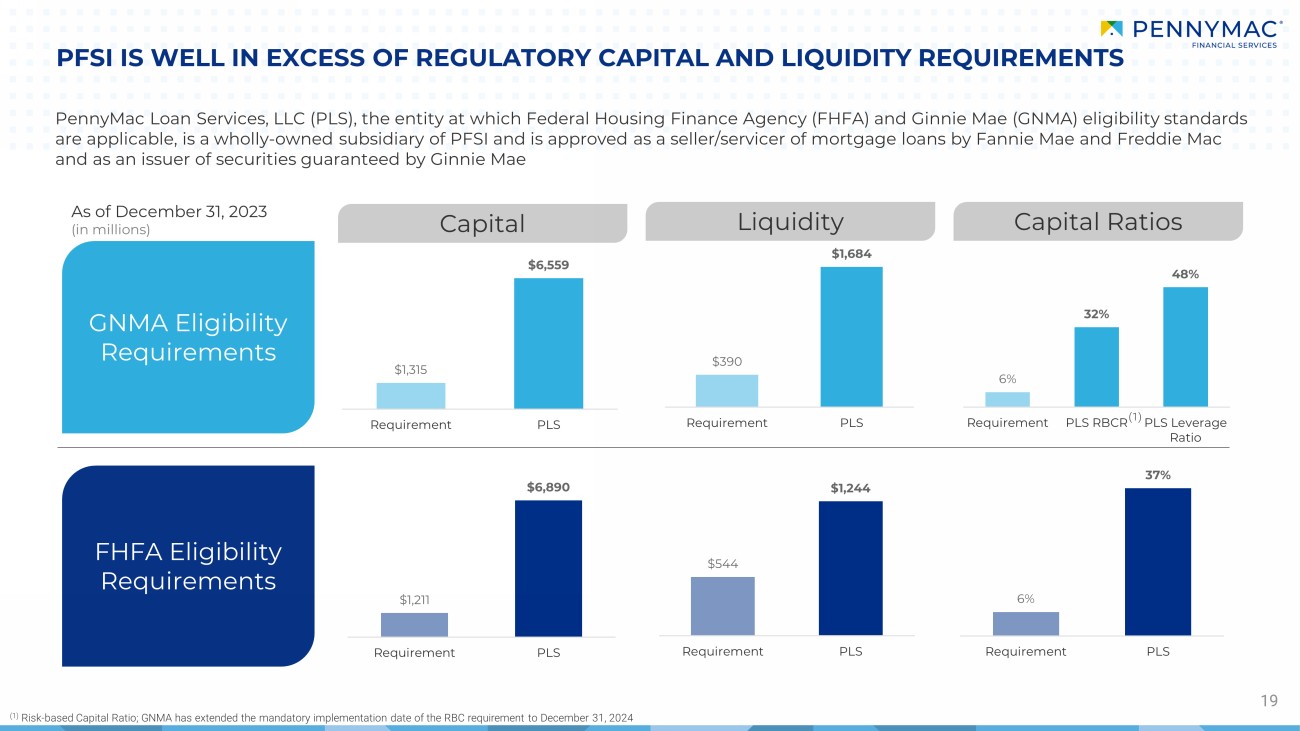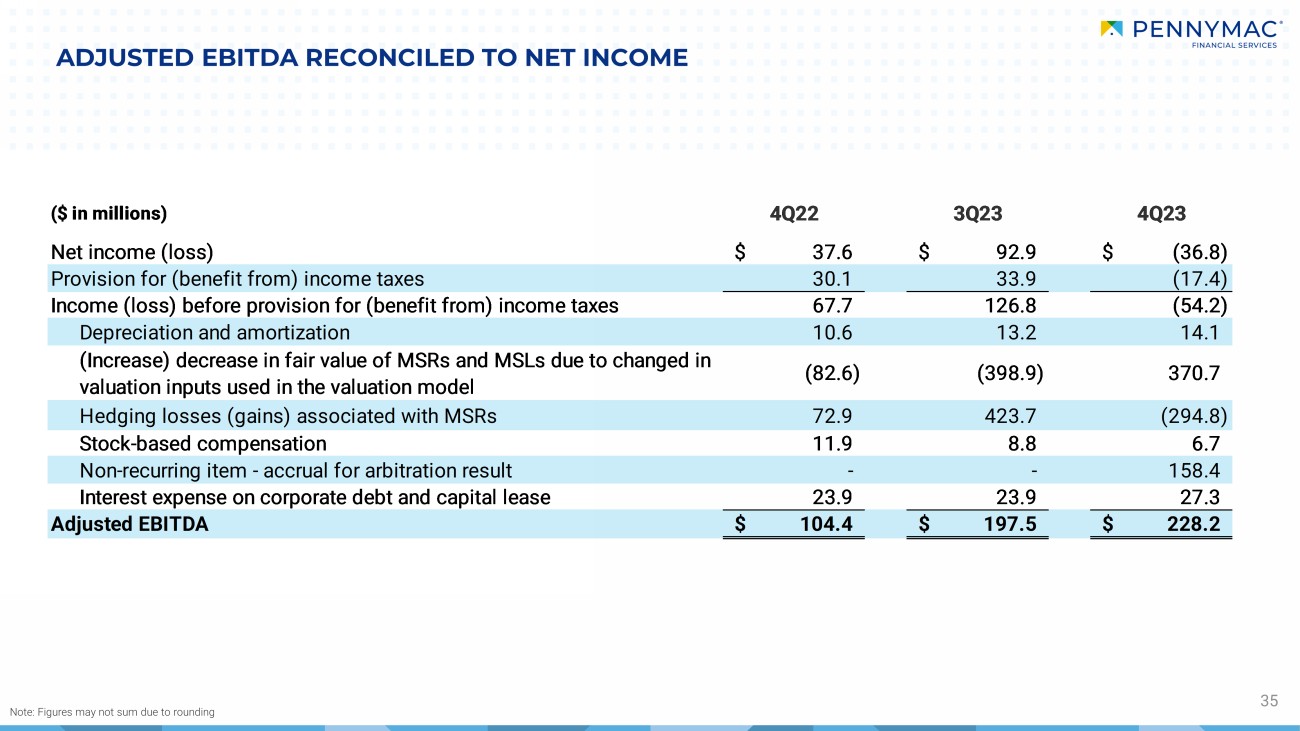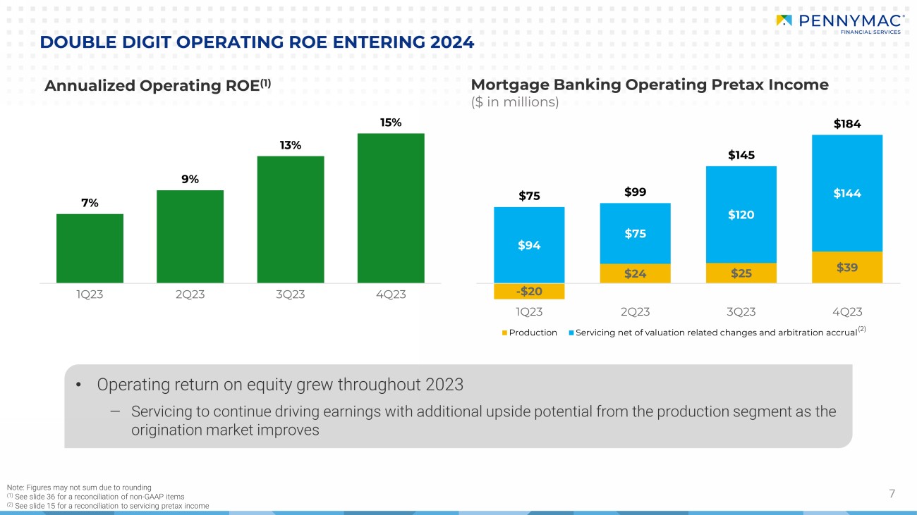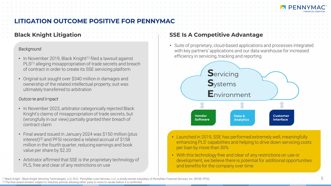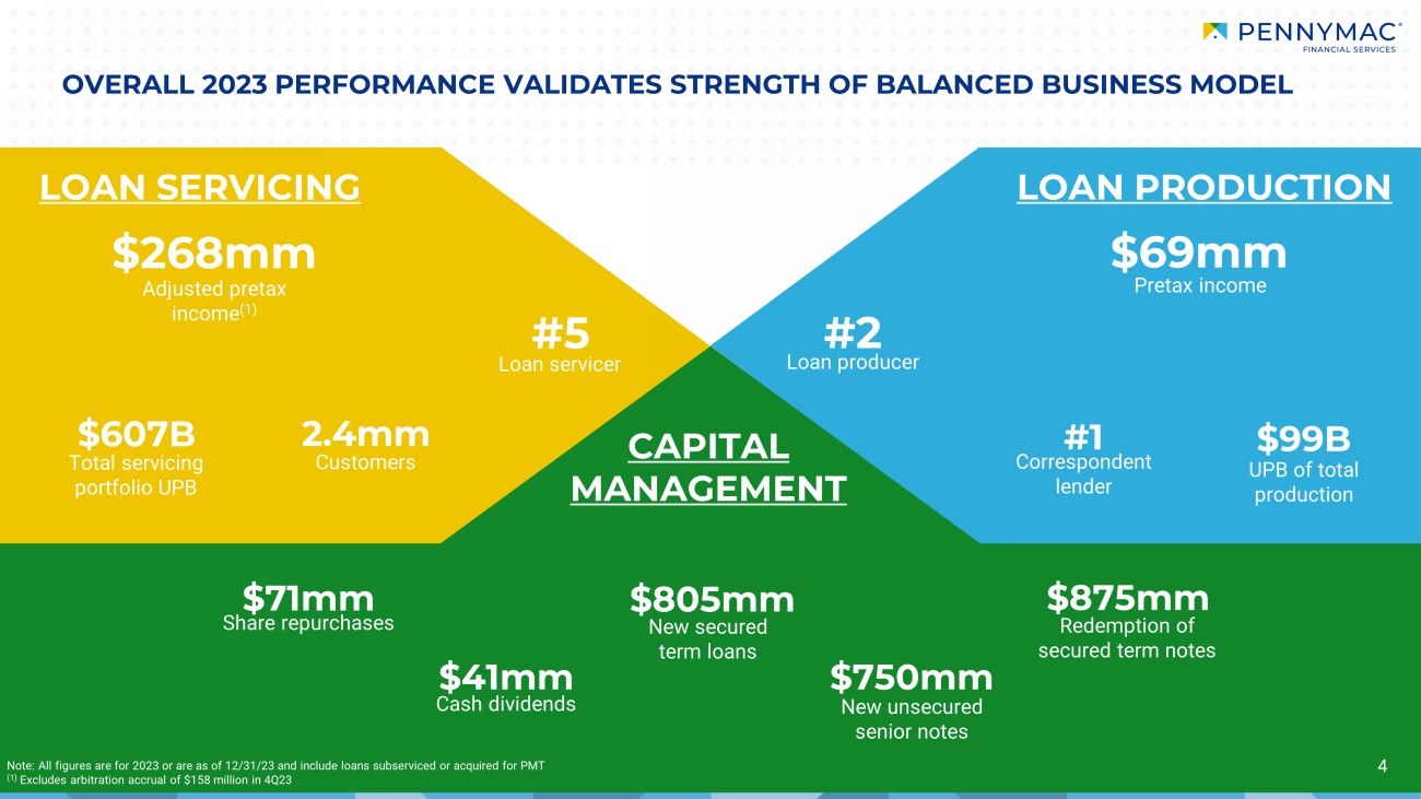 「ペニーマック・ファイナンシャルの第 4 四半期の自己資本営業利益率は年率 15%1 となり、当 社にとって素晴らしい 1 年の集大成となりました。「第4四半期の純損失は、主にブラックナイト社との長期にわたる仲裁の裁定に関連した一時的な発生によるものです。最終的な判決には同意できませんが、業界をリードするサービシング・システムの所有権を保持し、顧客と利害関係者の利益のために適切と思われるように活用できることを非常に喜ばしく思っています。