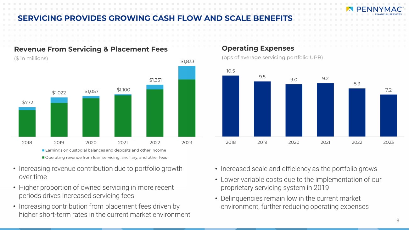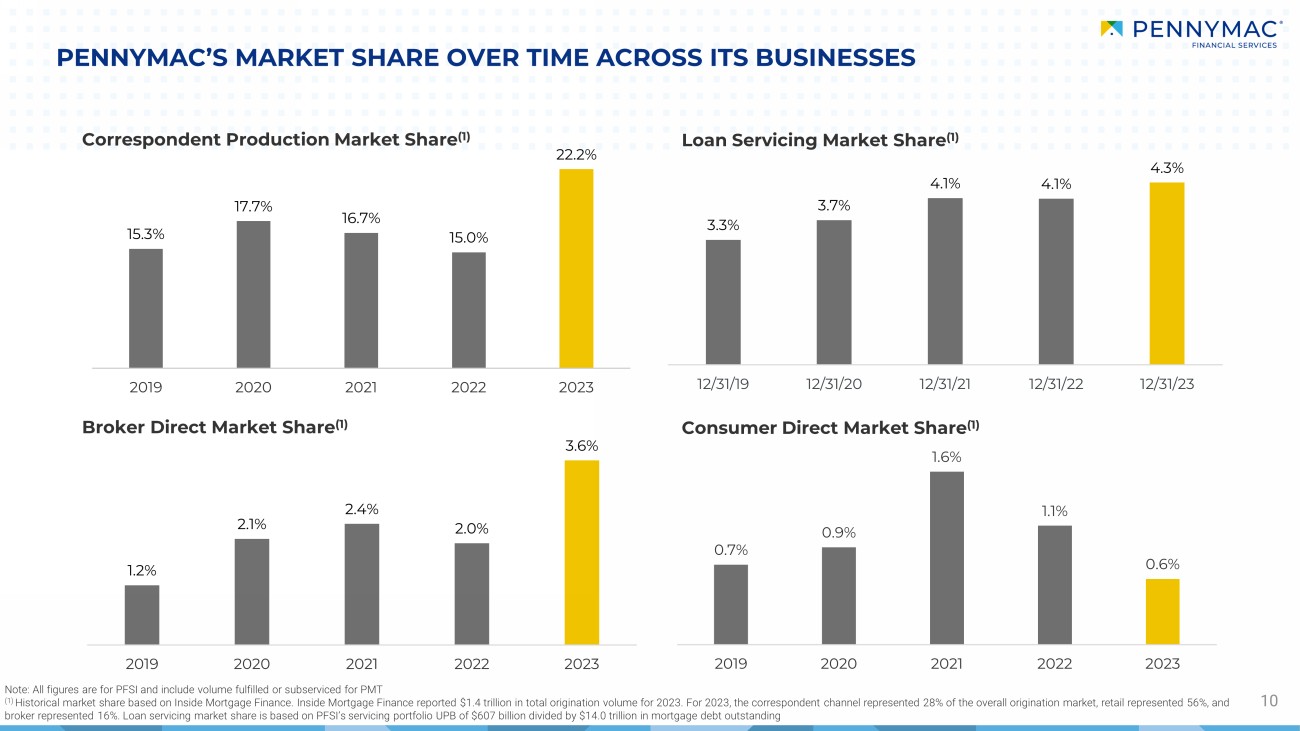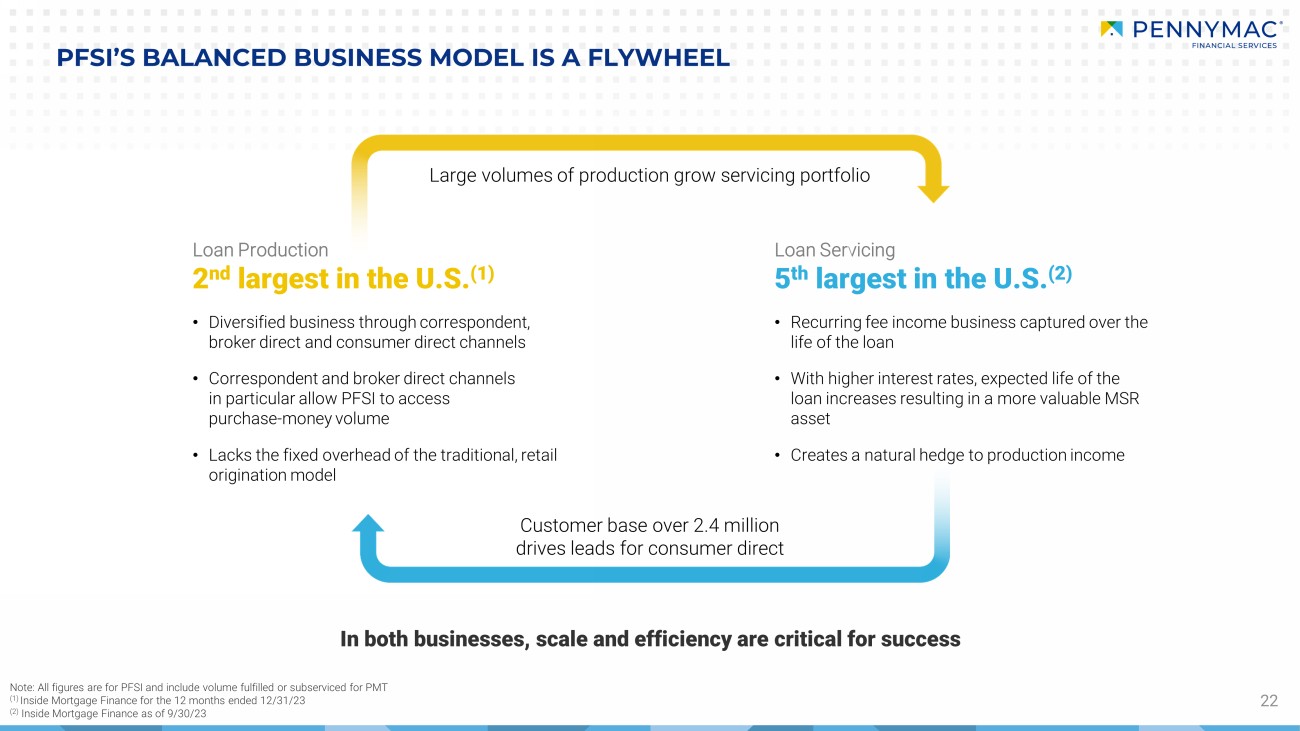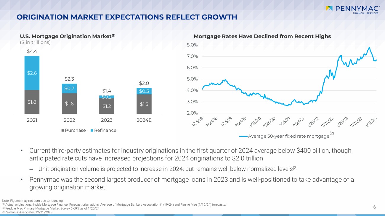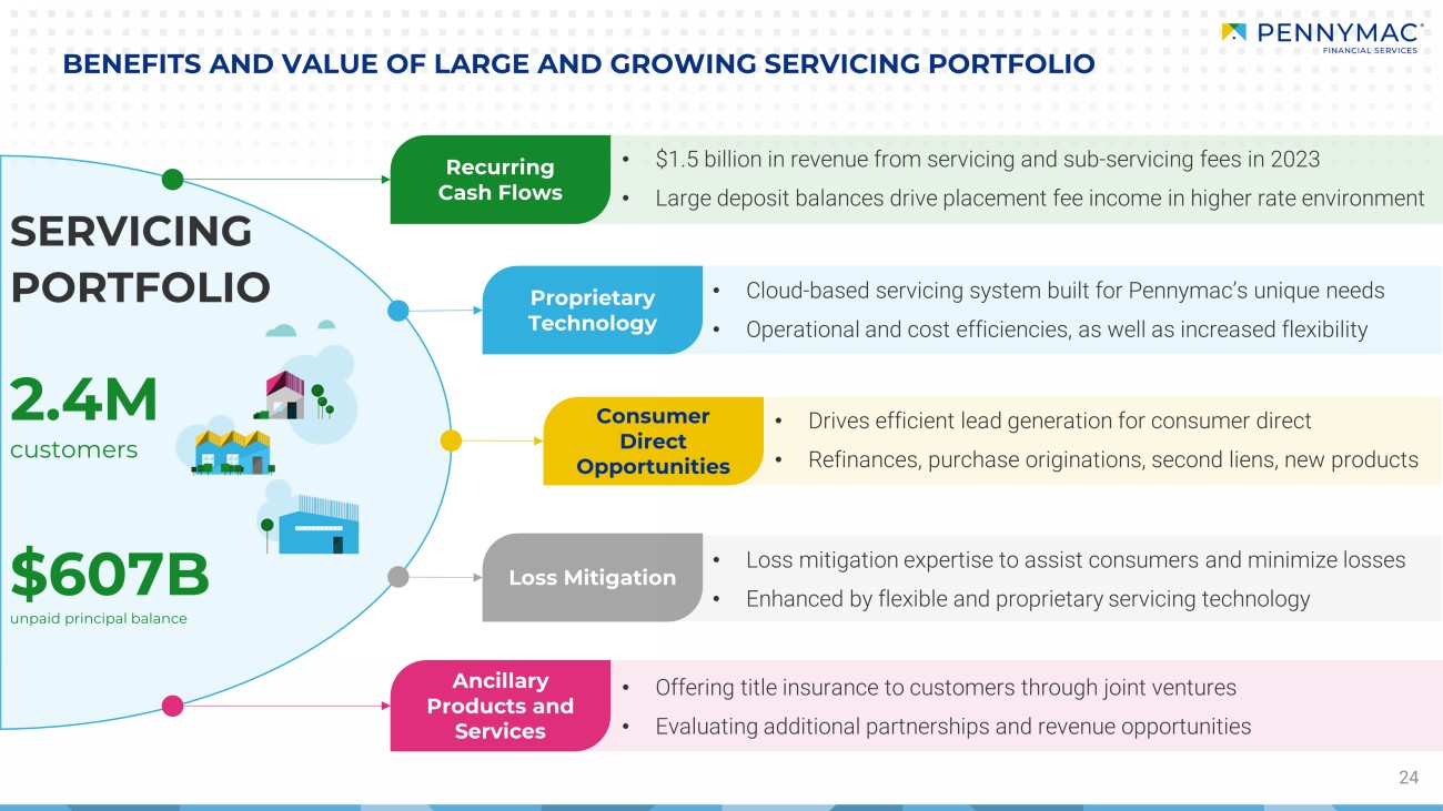 2023年の住宅ローン組成市場は、2022年比で約40%減少し、オリジネーション件数は1990年以降で最低水準となるなど、近年で最も厳しい市場でした。しかし、ペニーマックは、マルチ・チャネル・プロダクション・プラットフォームを通じて、2022年比わずか9%減の1000億ドル近い元本ベースの住宅ローンを組成し、購入市場への強力なアクセスと、顧客やビジネス・パートナーを収益面でサポートする能力の両方を実証しました。サービシング・ポートフォリオの有機的成長は、こうした生産量に牽引され続け、当期末のサービシング・ポートフォリオの残元本は6,000億ドルを超え、昨年末から10%増加した。規模を拡大し、成長を続けるサービシング業務は、当社が達成した成功の鍵であり、高金利環境下での収益の原動力となり、顧客基盤が拡大し続ける将来的な機会でもあります。"