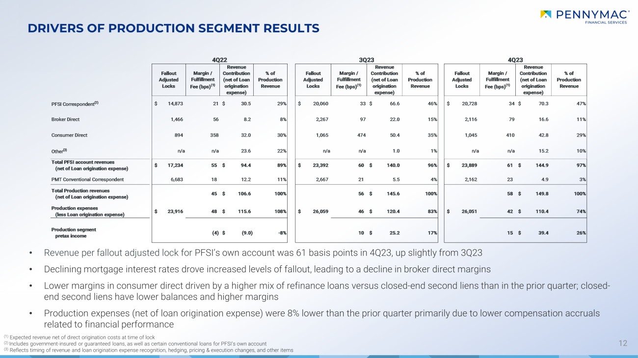 プロダクション・セグメントには、ペニーマック・ファイナンシャルの自己勘定で新規に組成された政府系保険付ローンや従来型コンフォーミング・ローンのコルレス取得、PMTに代わって行うフルフィルメント・サービス、消費者向けダイレクト・チャネルやブローカー・ダイレクト・チャネルを通じたダイレクト・レンディング(非委任ベースのコルレス販売業者からのローンの引き受けや取得を含む)が含まれる。