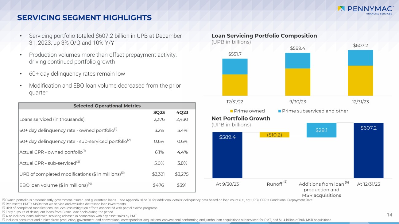 | o | サービシング・ポートフォリオは、期限前償還の動きを相殺する生産量に牽引され、2023 年 9 月 30 日から 3%増の残高 6,072 億ドルに拡大した。 |