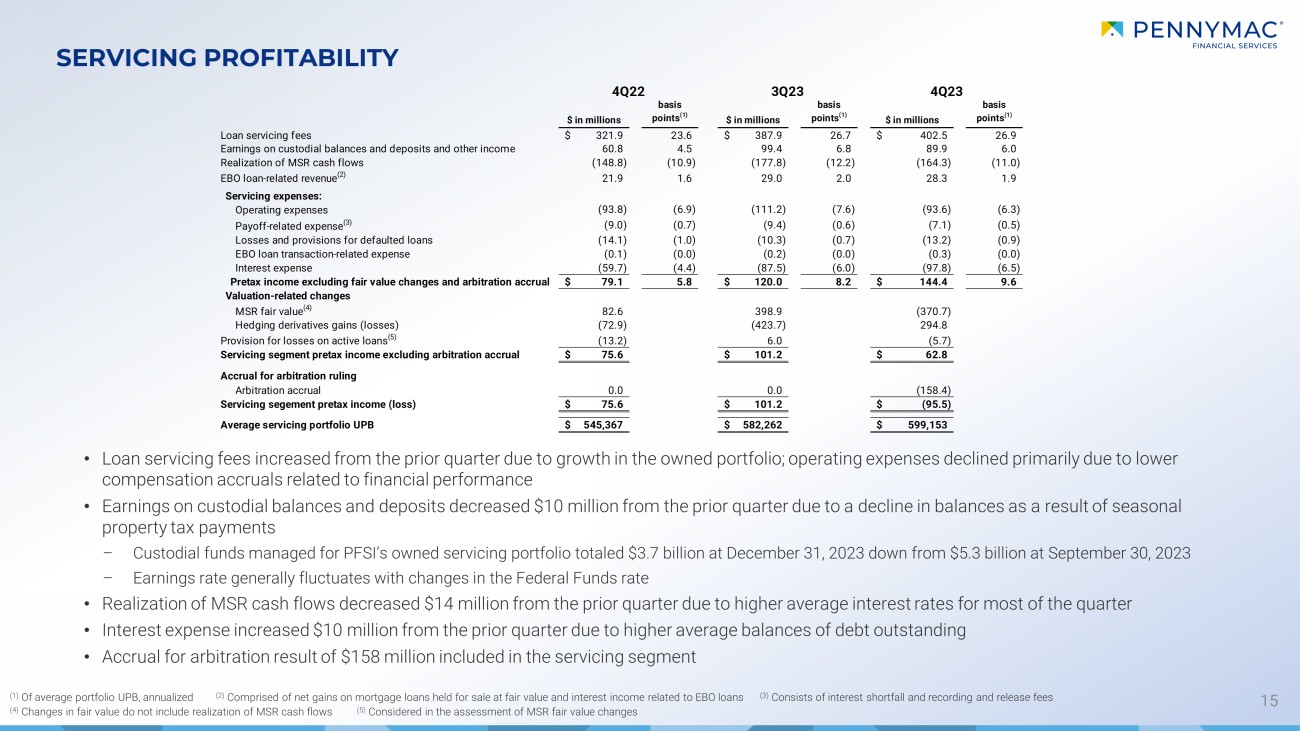 サービシング事業の税引前損失は、前年同期の 1 億 120 万ドルの税引前利益および 2022 年第 4 四半期の 7,560 万ドルの税引前利益に対し、9,550 万ドルとなった。第 4 四半期のサービシング事業の税引前損失には、非経常的な仲裁費用 1.5840 万ドルが含まれています。サービシング事業の純収益は、前期の 2 億 1,710 万ドル、2022 年第 4 四半期の 1 億 9,900 万ドルから減少し、1 億 7,580 万ドルとなりました。前四半期比で減少した主な要因は、第 4 四半期の正味ローン・サービシング手数料および正味支払利息が、前 四半期の正味受取利息に対して減少したことです。