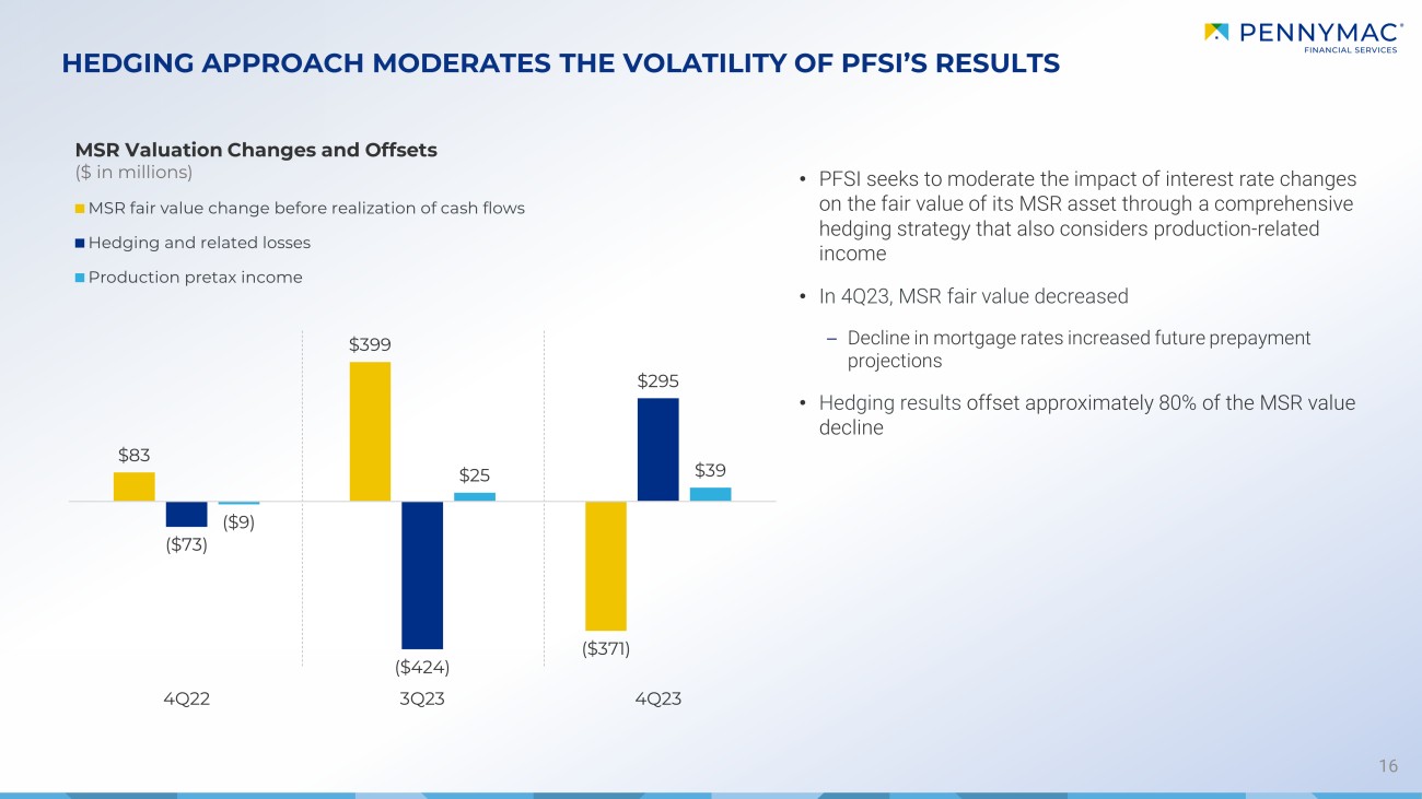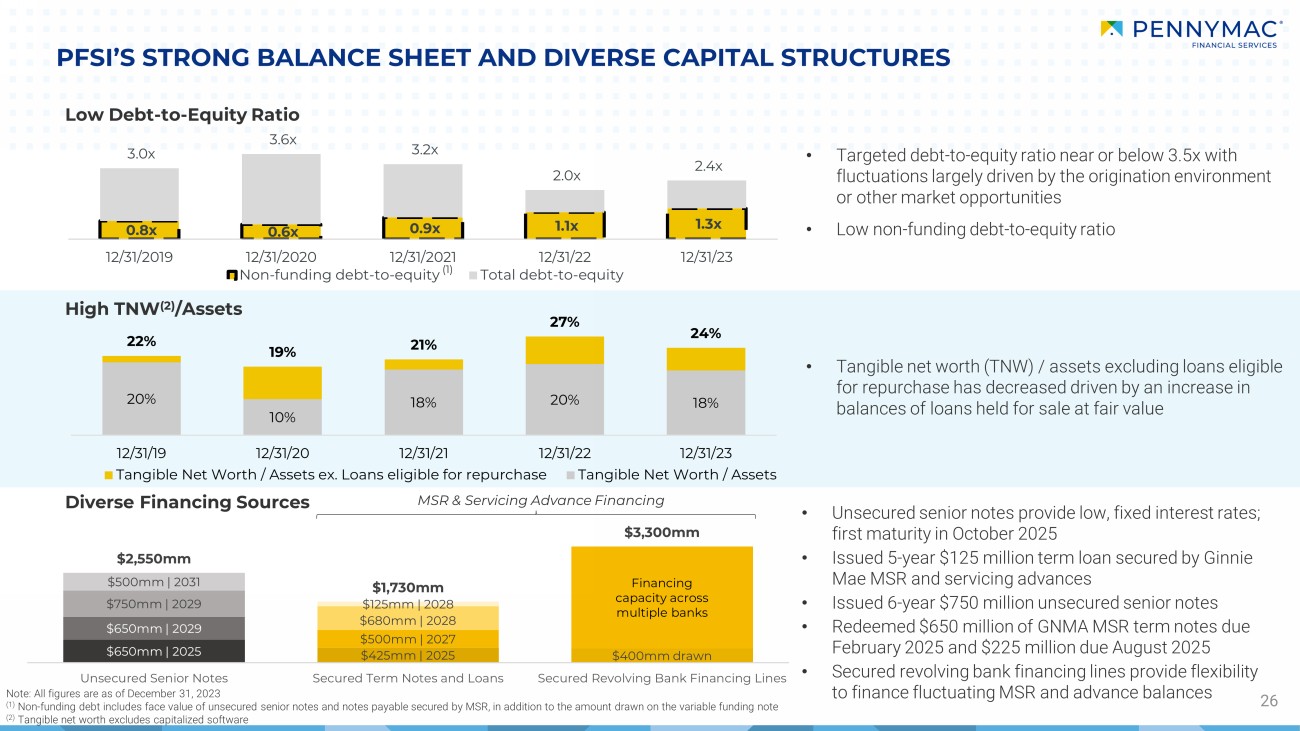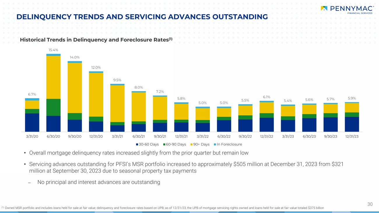 カリフォルニア州ウェストレイク・ビレッジ発-2024年2月1日-ペニーマック・ファイナンシャル・サービシズ(NYSE: PFSI)は本日、2023年第4四半期の売上高3億6,190万ドルに対し、純損失3,680万ドル(希薄化後1株当たり0.74ドル)を計上したと発表した。一株当たり簿価は2023年9月30日時点の71.56ドルから70.52ドルに減少した。
