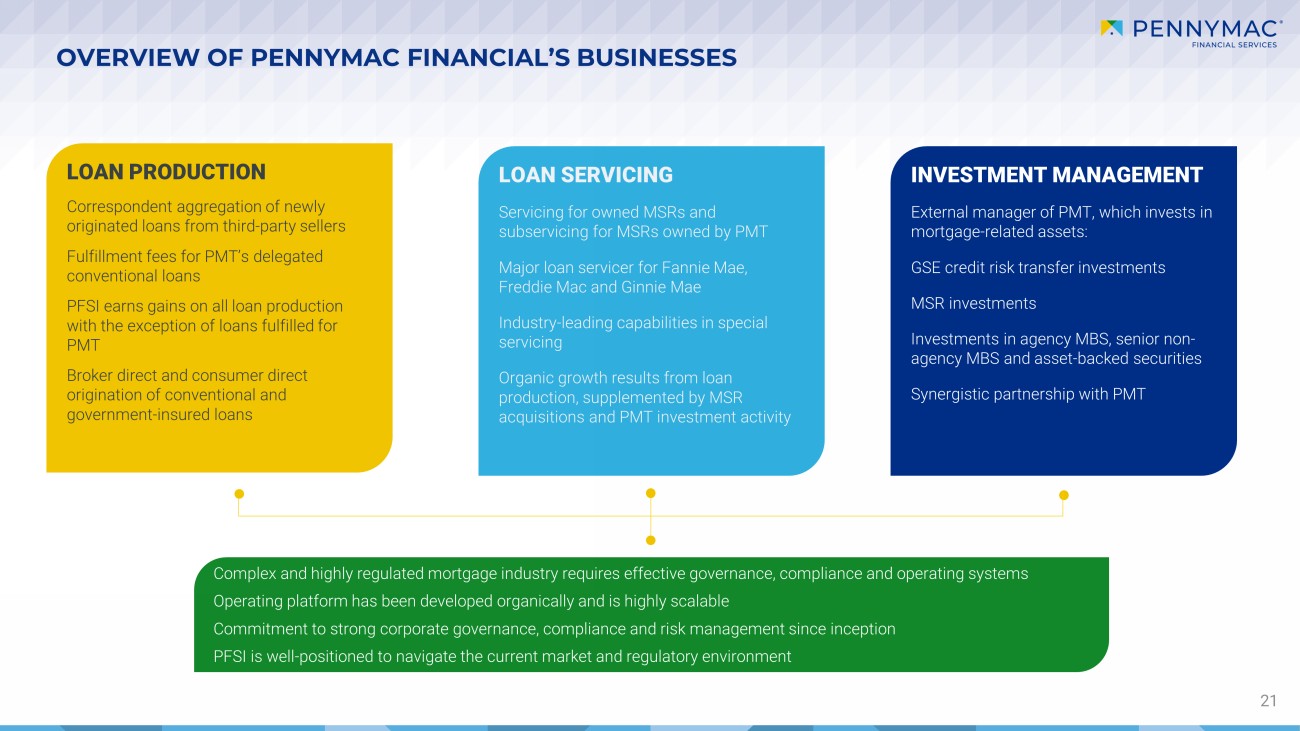 ペニーマック・ファイナンシャルは、コルレス・プロダクション業務において、PMTが関連会社以外から取得した従来型のコンフォーミング・ローンやジャンボ・ローンのフルフィルメント業務を行っている。これらのサービスには、マーケティング、リレーションシップ・マネジメント、コルレス・セラーの承認とモニタリング、ローン・ファイルのレビュー、引受、プライシング、ヘッジ、およびPMTのセカンダリー・モーゲージ市場におけるローンの売却と証券化に関連する業務が含まれるが、これらに限定されるものではない。