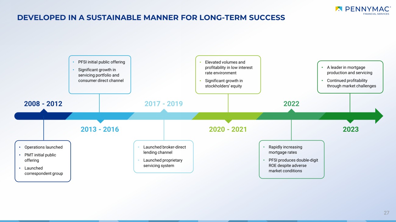 スペクター氏は最後に、「2023年に成し遂げたことを非常に誇りに思うと同時に、ペニーマック・ファイナンシャルの将来がさらに楽しみになりました。当社の長年にわたる強固な経営・財務実績は、住宅ローン業界では他に例を見ないものであり、その原動力となったのは、製造とサービシングの両分野で業界をリードするポジションを確立したバランスの取れたビジネスモデル、そして強固な資本とリスク管理の規律です。当社は、業界をリードする独自の技術、強固なバランスシート、そして、住宅所有のニーズに最適な商品とサービスを提供することで利益を得ることができるサービシング業務の顧客層の拡大により、業界で最も有利な立場にある企業であると確信しています。
