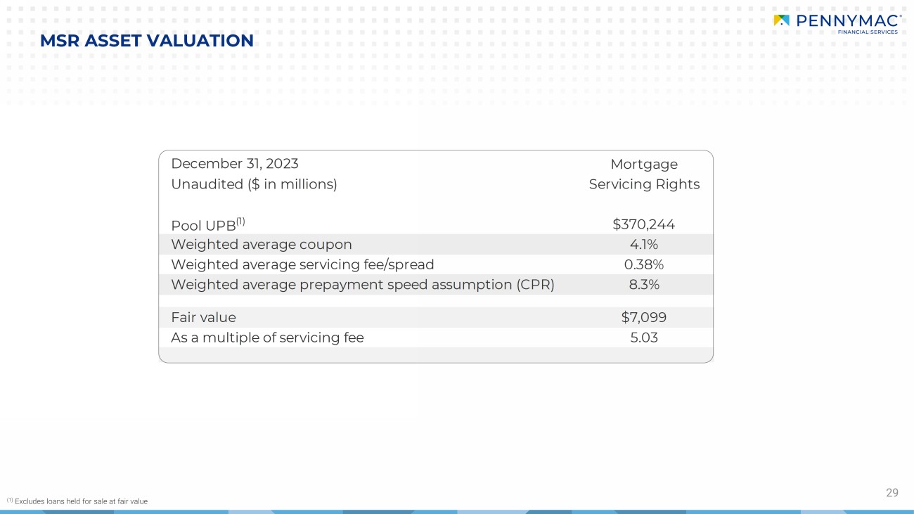 サービシング・セグ メントには、所有する MSR、サブサービシング、スペシャル・サービシング業務からの収益が含まれる。サービシング・ポートフォリオは、2023 年 9 月 30 日から 3%、2022 年 12 月 31 日から 10%増加し、2023 年 12 月 31 日時点の UPB は 6,072 億ドルとなった。ペニーマック・ファイナンシャ ルは、2,327 億ドルの残元本に対してサブサービスを提供し、スペシャル・サービシングを行っている。ペニーマック・ファイナンシャ ルが所有するMSRポートフォリオは、2023年9月30日時点から5%増加し、2022年12月31日時点から 18%増加して、UPBで3,746億ドルとなった。