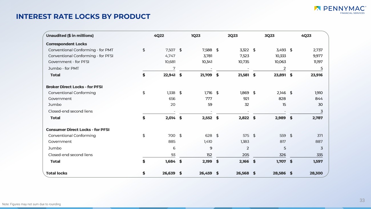 ペニーマック・ファイナンシャルの当四半期の貸出実行高は267億ドルで、うち242億ドルが自己勘定向け、25億ドルがPMT向けの手数料ベースのフルフィルメント業務であった。PFSIおよび直接貸出のIRLC向けコルレスド・ロックの総残高は256億ドルで、前四半期比2%増、2022年第4四半期比34%増となった。