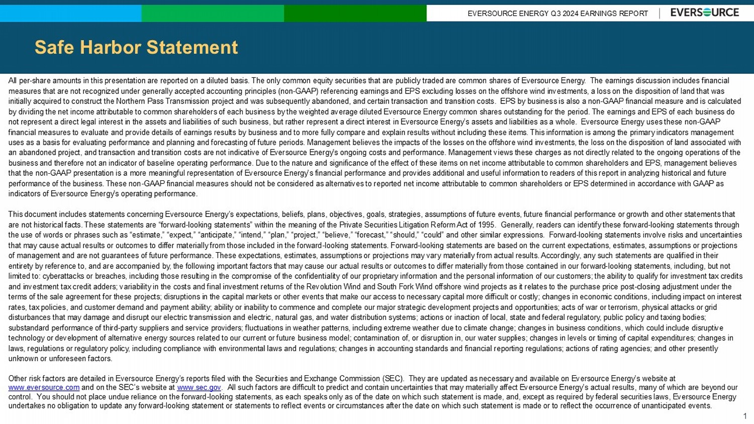 | Note: Eversource Energy will webcast a conference call with senior management on November 5, 2024, beginning at 9 a.m. Eastern Time. The webcast and associated slides can be accessed through Eversource Energy’s website at www.eversource.com. |