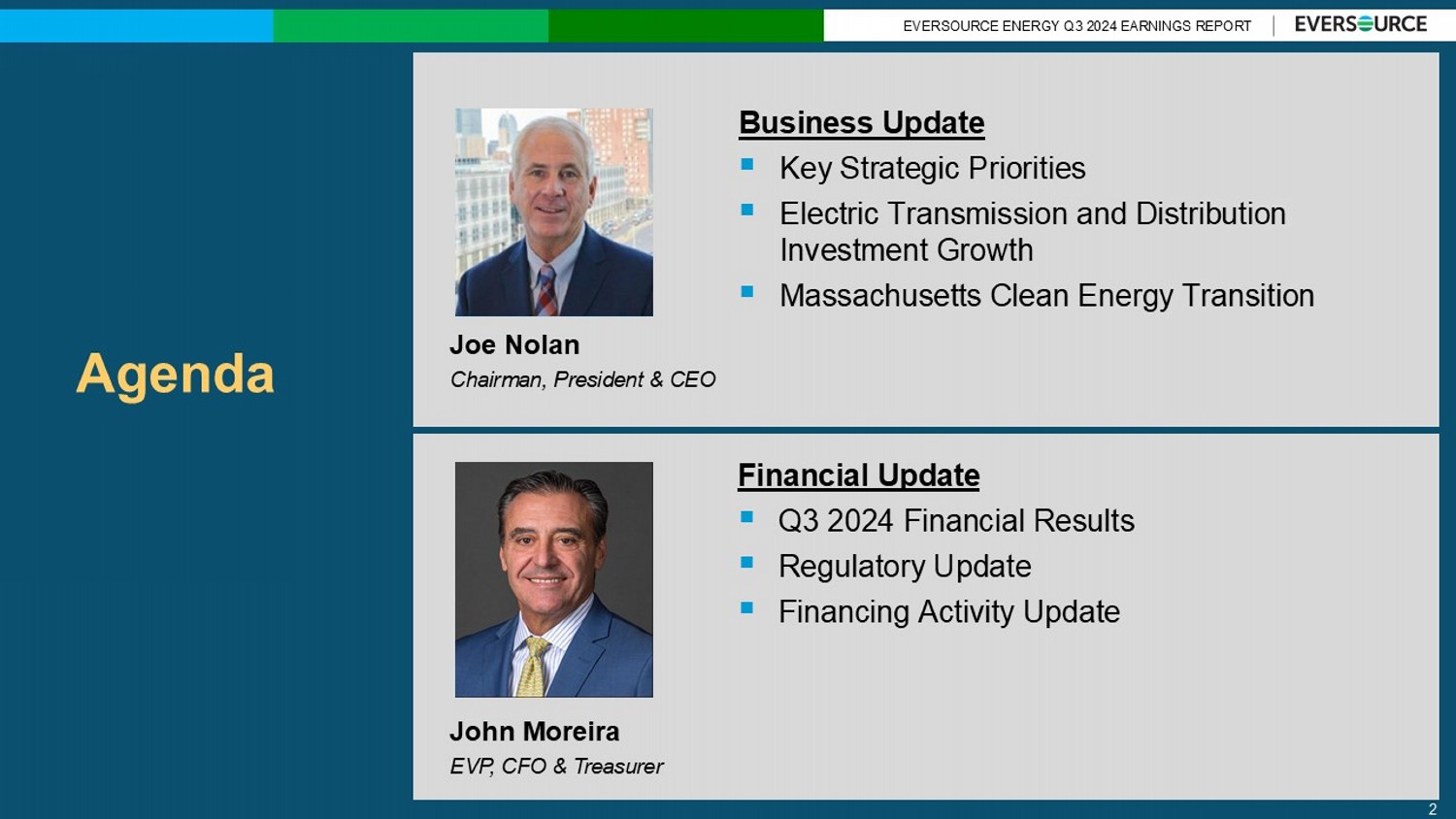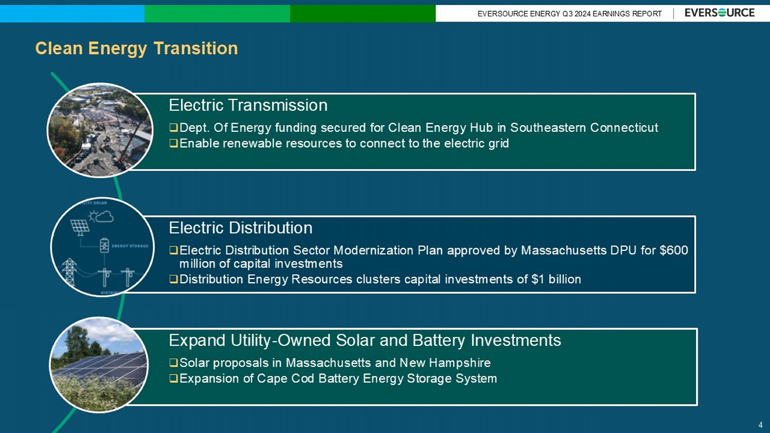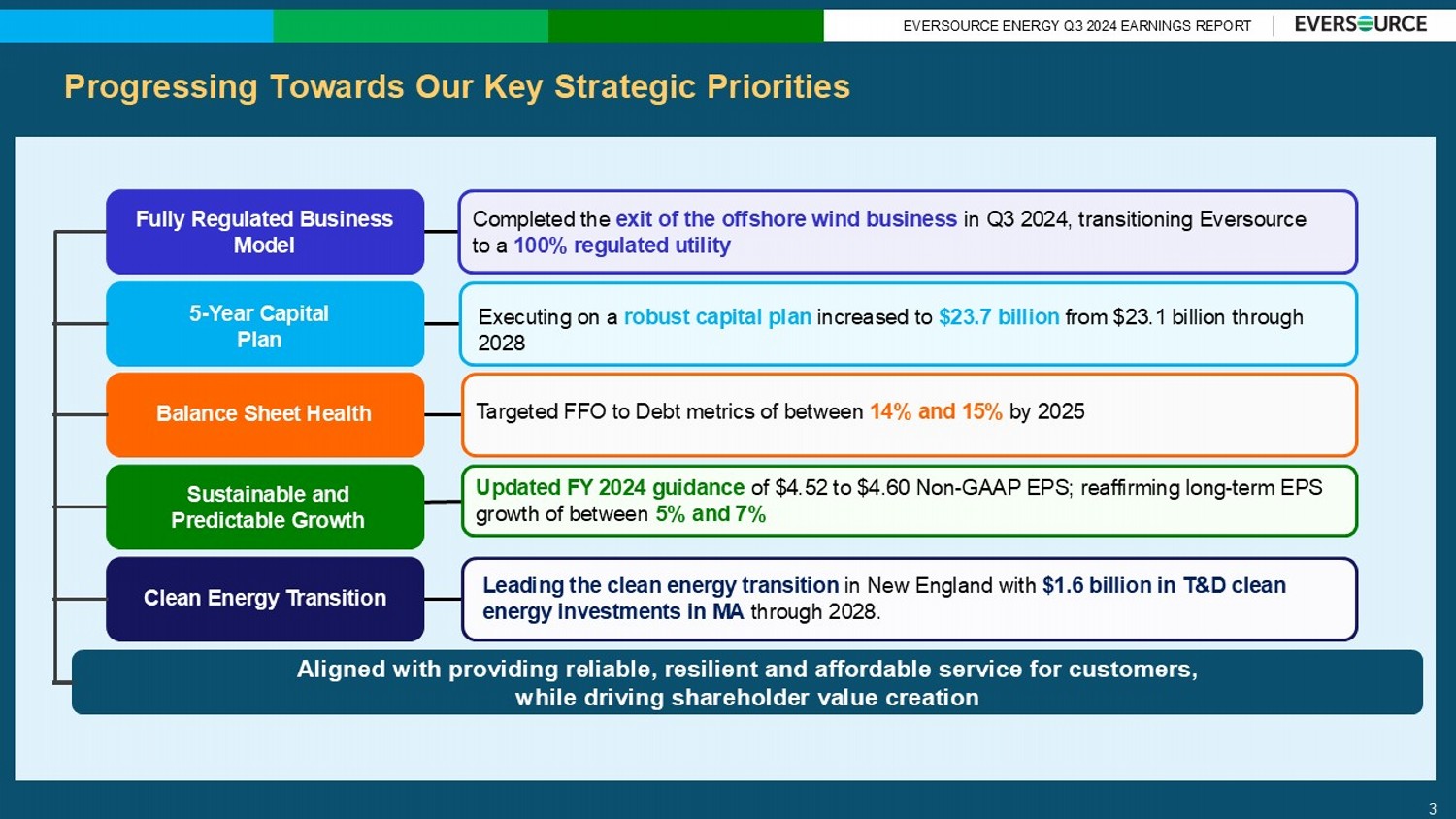 EVERSOURCE ENERGY Q3 2024 EARNINGS REPORT Agenda Business Update ▪ Key Strategic Priorities ▪ Electric Transmission and Distribution Investment Growth ▪ Massachusetts Clean Energy Transition 2 Joe Nolan Chairman, President & CEO John Moreira EVP, CFO & Treasurer Financial Update ▪ Q3 2024 Financial Results ▪ Regulatory Update ▪ Financing Activity Update EVERSOURCE ENERGY Q3 2024 EARNINGS REPORT Aligned with providing reliable, resilient and affordable service for customers, while driving shareholder value creation Progressing Towards Our Key Strategic Priorities Updated FY 2024 guidance of $4.52 to $4.60 Non - GAAP EPS; reaffirming long - term EPS growth of between 5% and 7% Fully Regulated Business Model Balance Sheet Health Clean Energy Transition Completed the exit of the offshore wind business in Q3 2024, transitioning Eversource to a 100% regulated utility Targeted FFO to Debt metrics of between 14% and 15% by 2025 Leading the clean energy transition in New England with $1.6 billion in T&D clean energy investments in MA through 2028.