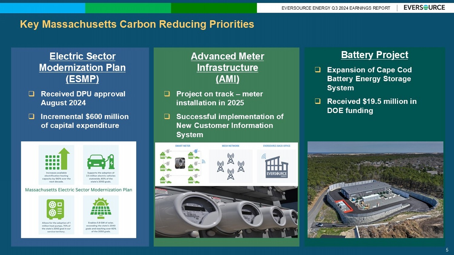5 - Year Capital Plan Executing on a robust capital plan increased to $23.7 billion from $23.1 billion through 2028 Sustainable and Predictable Growth 3 EVERSOURCE ENERGY Q3 2024 EARNINGS REPORT Clean Energy Transition 4 Electric Distribution □ Electric Distribution Sector Modernization Plan approved by Massachusetts DPU for $600 million of capital investments □ Distribution Energy Resources clusters capital investments of $1 billion Expand Utility - Owned Solar and Battery Investments □ Solar proposals in Massachusetts and New Hampshire □ Expansion of Cape Cod Battery Energy Storage System Electric Transmission □ Dept.