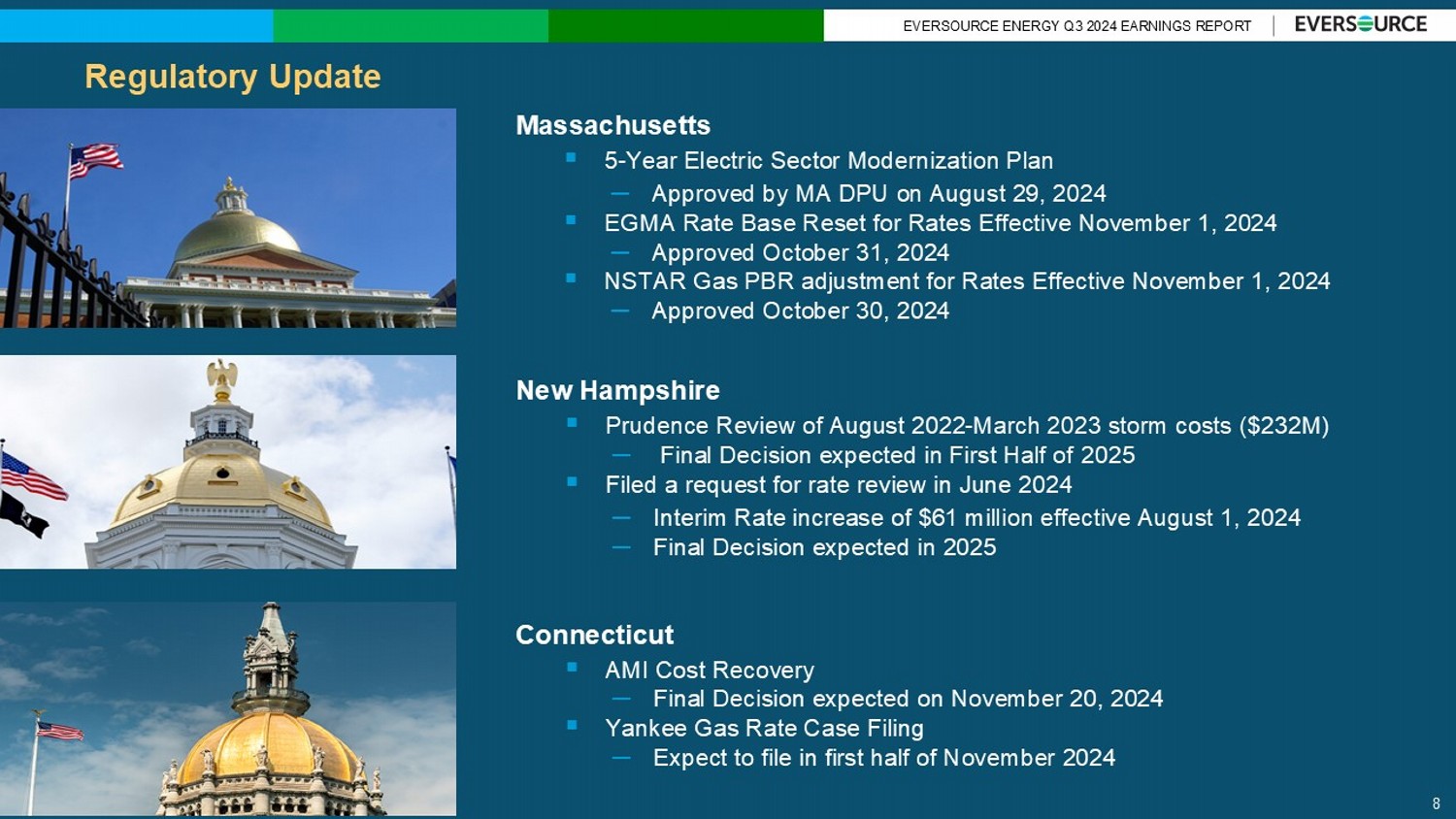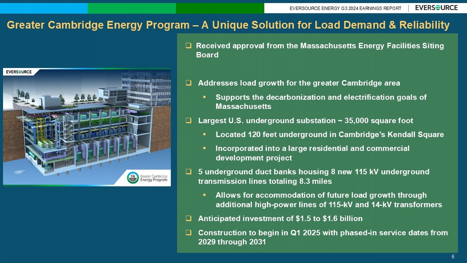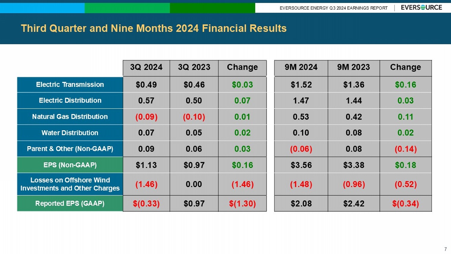 Of Energy funding secured for Clean Energy Hub in Southeastern Connecticut □ Enable renewable resources to connect to the electric grid EVERSOURCE ENERGY Q3 2024 EARNINGS REPORT 5 Advanced Meter Infrastructure (AMI) □ Project on track – meter installation in 2025 □ Successful implementation of New Customer Information System Battery Project □ Expansion of Cape Cod Battery Energy Storage System □ Received $19.5 million in DOE funding Electric Sector Modernization Plan (ESMP) □ Received DPU approval August 2024 □ Incremental $600 million of capital expenditure Key Massachusetts Carbon Reducing Priorities EVERSOURCE ENERGY Q3 2024 EARNINGS REPORT 6 □ Received approval from the Massachusetts Energy Facilities Siting Board □ Addresses load growth for the greater Cambridge area ▪ Supports the decarbonization and electrification goals of Massachusetts □ Largest U.S. underground substation ~ 35,000 square foot ▪ Located 120 feet underground in Cambridge’s Kendall Square ▪ Incorporated into a large residential and commercial development project □ 5 underground duct banks housing 8 new 115 kV underground transmission lines totaling 8.3 miles ▪ Allows for accommodation of future load growth through additional high - power lines of 115 - kV and 14 - kV transformers □ Anticipated investment of $1.5 to $1.6 billion □ Construction to begin in Q1 2025 with phased - in service dates from 2029 through 2031 Greater Cambridge Energy Program – A Unique Solution for Load Demand & Reliability EVERSOURCE ENERGY Q3 2024 EARNINGS REPORT Third Quarter and Nine Months 2024 Financial Results 7 Change 9M 2023 9M 2024 Change 3Q 2023 3Q 2024 $0.16 $1.36 $1.52 $0.03 $0.46 $0.49 Electric Transmission 0.03 1.44 1.47 0.07 0.50 0.57 Electric Distribution 0.11 0.42 0.53 0.01 (0.10) (0.09) Natural Gas Distribution 0.02 0.08 0.10 0.02 0.05 0.07 Water Distribution (0.14) 0.08 (0.06) 0.03 0.06 0.09 Parent & Other (Non - GAAP) $0.18 $3.38 $3.56 $0.16 $0.97 $1.13 EPS (Non - GAAP) (0.52) (0.96) (1.48) (1.46) 0.00 (1.46) Losses on Offshore Wind Investments and Other Charges $(0.34) $2.42 $2.08 $(1.30) $0.97 $(0.33) Reported EPS (GAAP)