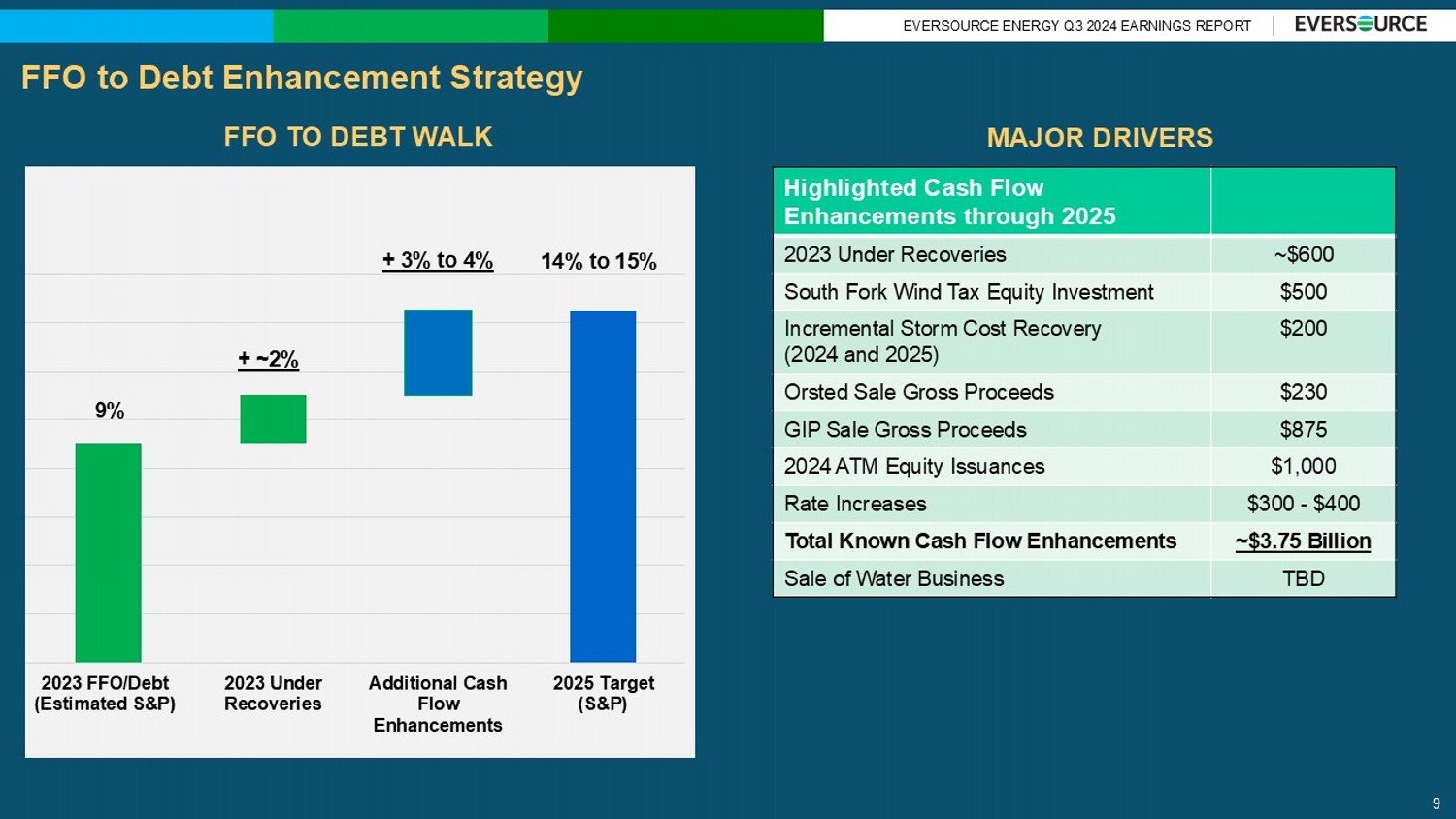 EVERSOURCE ENERGY Q3 2024 EARNINGS REPORT Regulatory Update Massachusetts ▪ 5 - Year Electric Sector Modernization Plan – Approved by MA DPU on August 29, 2024 ▪ EGMA Rate Base Reset for Rates Effective November 1, 2024 – Approved October 31, 2024 ▪ NSTAR Gas PBR adjustment for Rates Effective November 1, 2024 – Approved October 30, 2024 New Hampshire ▪ Prudence Review of August 2022 - March 2023 storm costs ($232M) – Final Decision expected in First Half of 2025 ▪ Filed a request for rate review in June 2024 – Interim Rate increase of $61 million effective August 1, 2024 – Final Decision expected in 2025 Connecticut ▪ AMI Cost Recovery – Final Decision expected on November 20, 2024 ▪ Yankee Gas Rate Case Filing – Expect to file in first half of November 2024 8 EVERSOURCE ENERGY Q3 2024 EARNINGS REPORT FFO to Debt Enhancement Strategy 2024 - 2025 FFO/Debt 14% - 15% at S&P FFO TO DEBT WALK 9% + ~2% + 3% to 4% 14% to 15% 2023 FFO/Debt (Estimated S&P) 2023 Under Recoveries Additional Cash Flow Enhancements 2025 Target (S&P) Highlighted Cash Flow Enhancements through 2025 ~$600 2023 Under Recoveries $500 South Fork Wind Tax Equity Investment $200 Incremental Storm Cost Recovery (2024 and 2025) $230 Orsted Sale Gross Proceeds $875 GIP Sale Gross Proceeds $1,000 2024 ATM Equity Issuances $300 - $400 Rate Increases ~$3.75 Billion Total Known Cash Flow Enhancements TBD Sale of Water Business MAJOR DRIVERS 9
