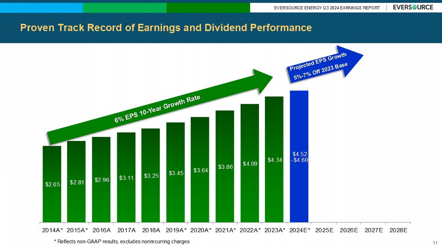 EVERSOURCE ENERGY Q3 2024 EARNINGS REPORT 2024 2025 Parent Debt and Equity Issuances and Maturities Company Size/Coupon Maturity Parent $900M @ 4.20% Jun 27, 2024 Parent $450M @ 2.90% Oct 1, 2024 2024 Debt Issuances 2024 Maturities Company Size/Coupon Maturity Parent $350M @ 5.00% Jan 1, 2027 Parent $650M @ 5.50% Jan 1, 2034 Parent $700M @ 5.85% Apr 15, 2031 Parent $700M @ 5.95% Jul 15, 2034 New Shares . An additional 15.7M shares were issued under the At-The-Market Program year-to-date October 2024 with net proceeds of approximately $990 million Treasury Shares . Dividend reinvestment, employee equity programs continue with approximately 1.1 million shares issued through October 2024 2024 Equity Issuances 10 2025 Maturities Company Size/Coupon Maturity Parent $300M @ 3.15% Jan 15, 2025 Parent $300M @ 0.80% Aug 15, 2025 EVERSOURCE ENERGY Q3 2024 EARNINGS REPORT $2.65 $2.81 $2.96 $3.11 $3.25 $3.45 $3.64 $3.86 $4.09 $4.34 $4.52 - $4.60 2014A* 2015A* 2016A 2017A 2018A 2019A* 2020A* 2021A* 2022A* 2023A* 2024E* 2025E 2026E 2027E 2028E * Reflects non - GAAP results, excludes nonrecurring charges 11 Proven Track Record of Earnings and Dividend Performance