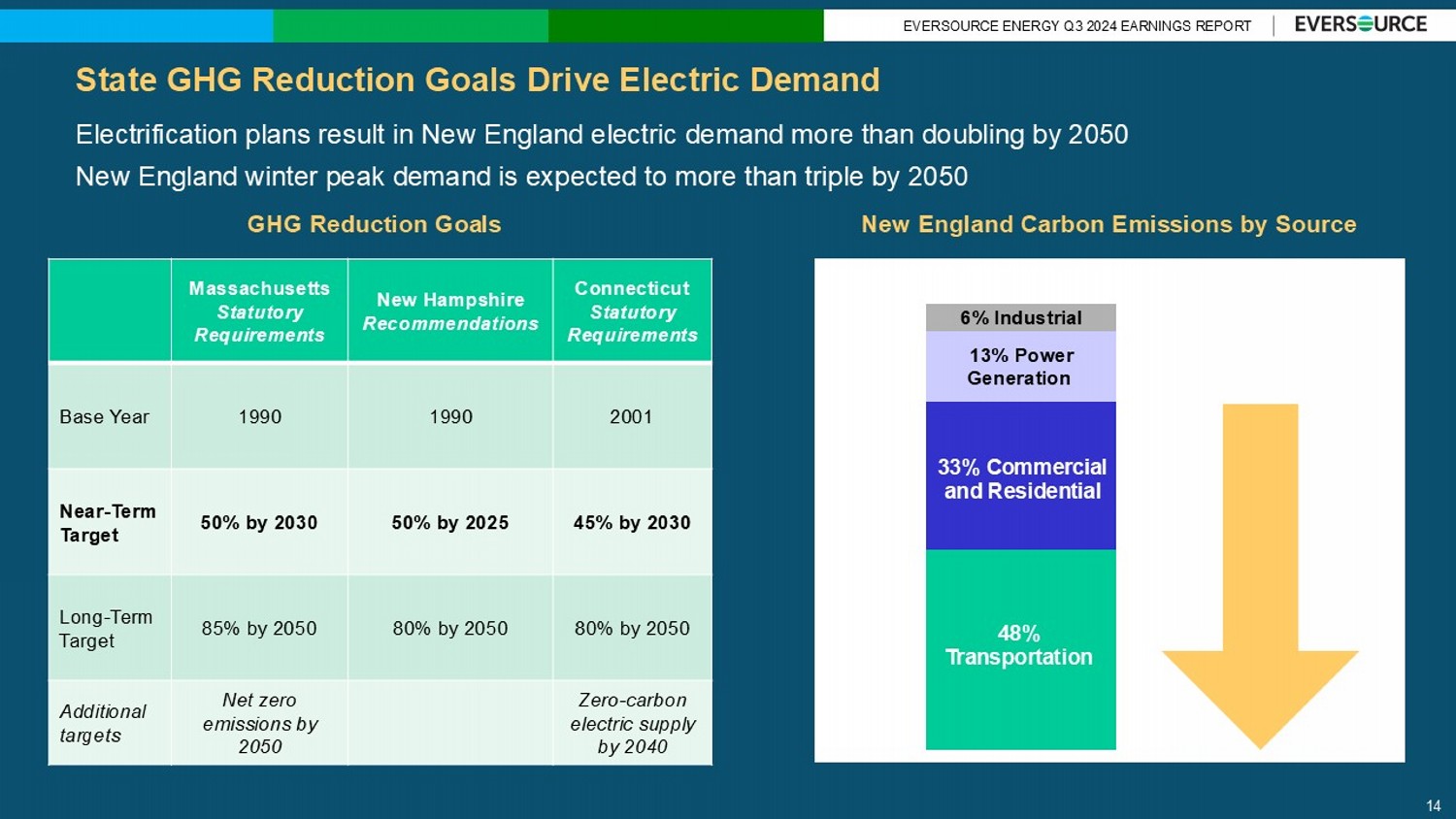 EVERSOURCE ENERGY Q3 2024 EARNINGS REPORT $1,115 $1,207 $1,448 $1,200 $1,207 $1,053 $1,166 $1,146 $1,244 $1,354 $1,772 $2,009 $1,869 $2,051 $2,006 $1,770 $799 $804 $998 $1,044 $1,087 $1,142 $1,089 $1,079 $144 $155 $162 $169 $204 $218 $234 $251 $239 $266 $213 $225 $234 $223 $202 $239 $3,541 $3,786 $4,593 $4,647 $4,601 $4,687 $4,697 $4,485 $0 $500 $1,000 $1,500 $2,000 $2,500 $3,000 $3,500 $4,000 $4,500 $5,000 2021A 2022A 2023A 2024E 2025E 2026E 2027E 2028E Transmission Electric Distribution Natural Gas Distribution Water IT and Facilities $ In Millions $23.1 Billion 2024 - 2028 * Projected Capital Expenditures for Core Businesses 13 * Including ESMP investments of $600 million, the projected capital expenditures are now $23.7 billion EVERSOURCE ENERGY Q3 2024 EARNINGS REPORT State GHG Reduction Goals Drive Electric Demand 14 Connecticut Statutory Requirements New Hampshire Recommendations Massachusetts Statutory Requirements 2001 1990 1990 Base Year 45% by 2030 50% by 2025 50% by 2030 Near - Term Target 80% by 2050 80% by 2050 85% by 2050 Long - Term Target Zero - carbon electric supply by 2040 Net zero emissions by 2050 Additional targets 48% Transportation 33% Commercial and Residential 13% Power Generation 6% Industrial GHG Reduction Goals New England Carbon Emissions by Source Electrification plans result in New England electric demand more than doubling by 2050 New England winter peak demand is expected to more than triple by 2050