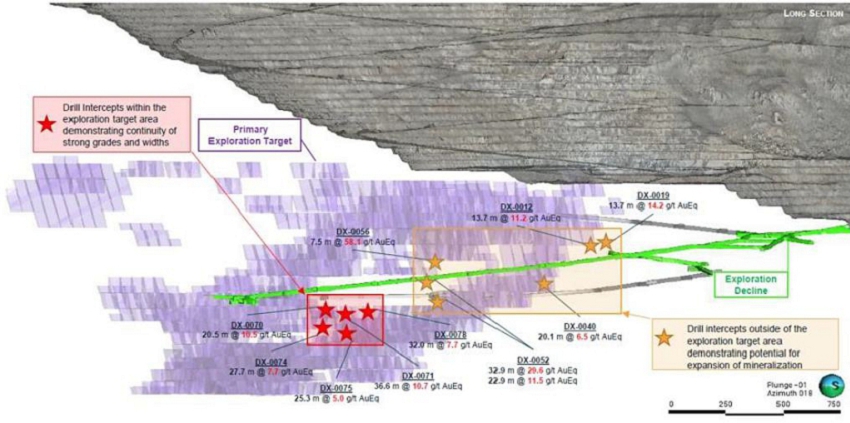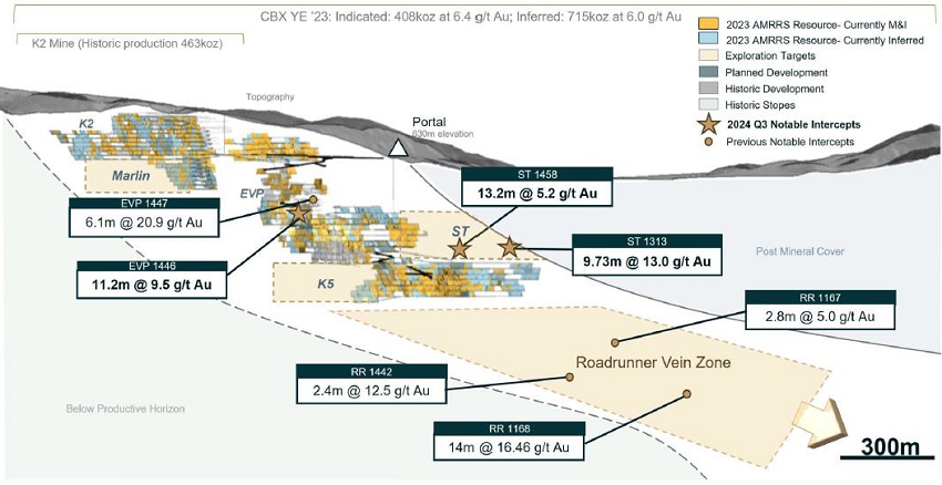 Curlew Basin long section demonstrating positive exploration results outside of the known resource at the Stealth, EVP and Roadrunner zones. These intercepts demonstrate higher gold grades and increased vein widths relative to those in the current mine plan, reinforcing Curlew’s potential for continued resource growth.