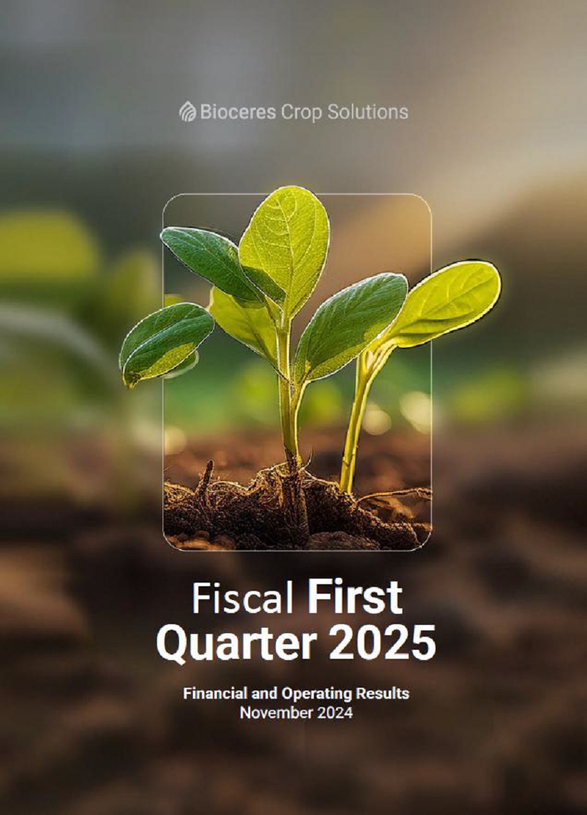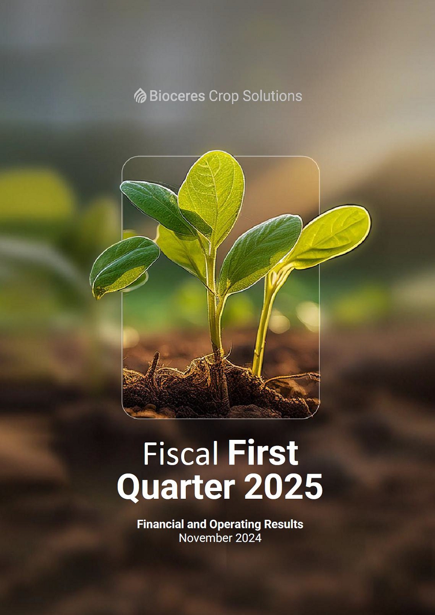 ROSARIO, Argentina – November 11, 2024 – Bioceres Crop Solutions Corp. (“Bioceres” or the “Company”) (NASDAQ: BIOX), a leader in the development and commercialization of productivity solutions designed to regenerate agricultural ecosystems while making crops more resilient to climate change, announced financial results for the fiscal first quarter ended September 30, 2024. Financial results are expressed in U.S. dollars and are presented in accordance with International Financial Reporting Standards. All comparisons in this announcement are year-over-year (YoY), unless otherwise noted.