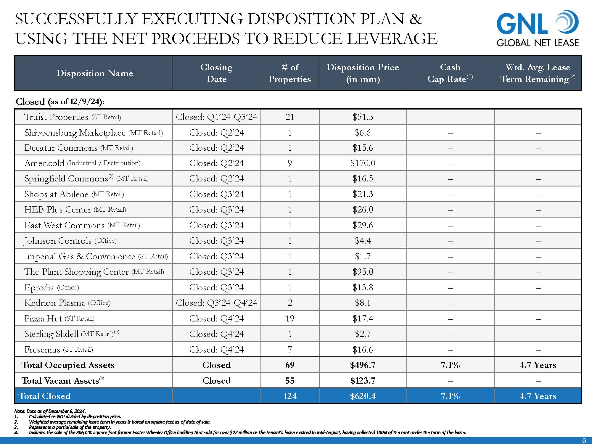 GLOBAL NET LEASE ANNOUNCES $620 MILLION OF CLOSED DISPOSITIONS