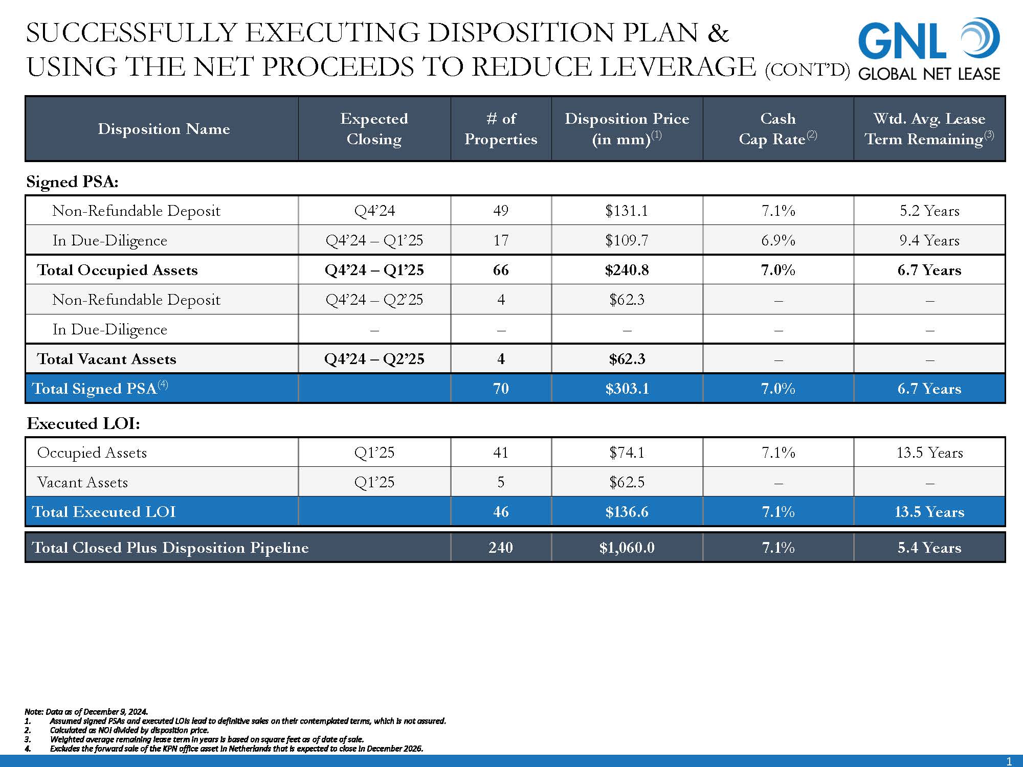 NEW YORK – December 12, 2024 – Global Net Lease, Inc. (NYSE: GNL) (“GNL” or the “Company”) today announced continued progress on its strategic disposition plan. Through December 9, 2024, GNL has closed $620 million of dispositions, and, together with its pipeline of potential asset sales, dispositions currently total $1.1 billion1.