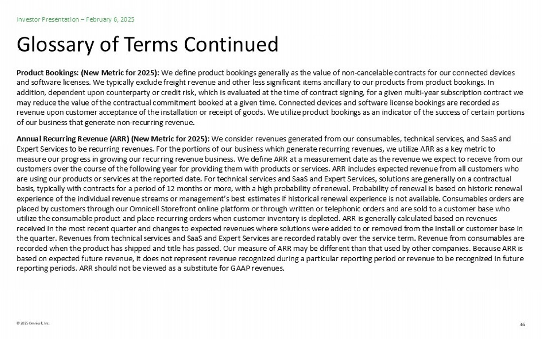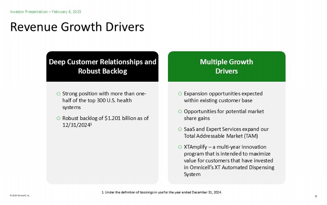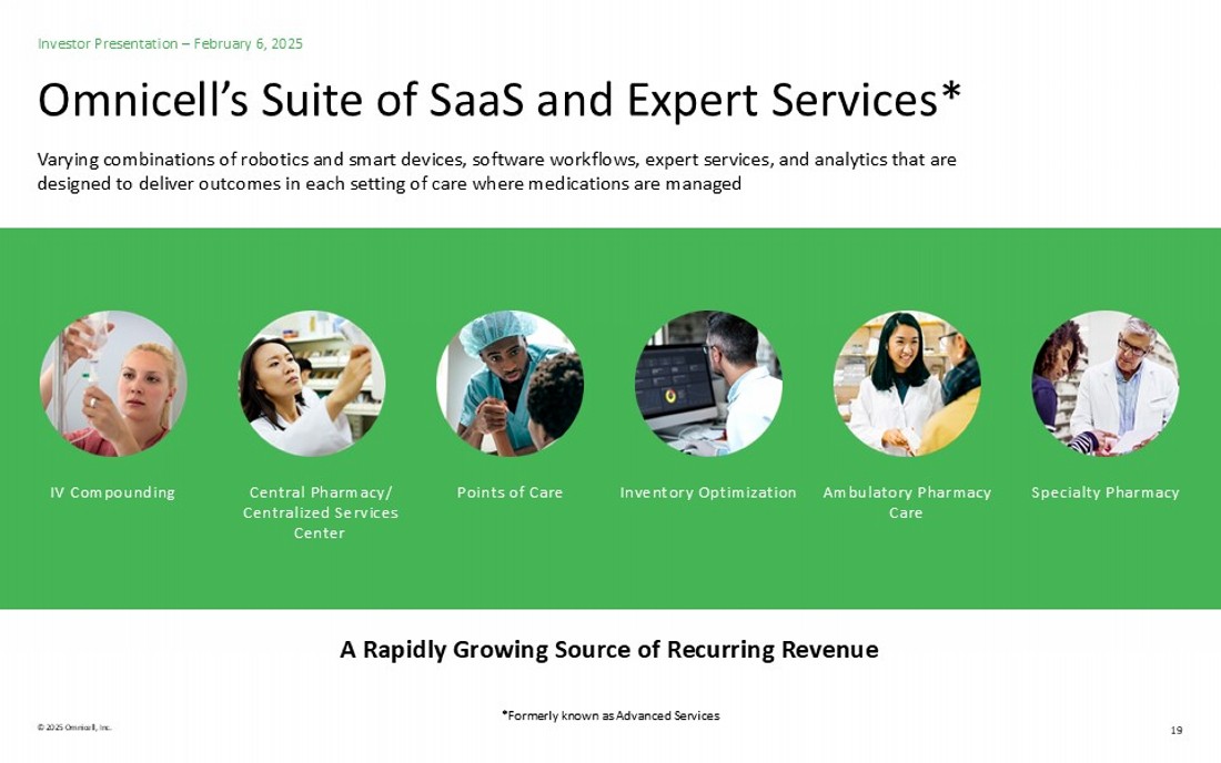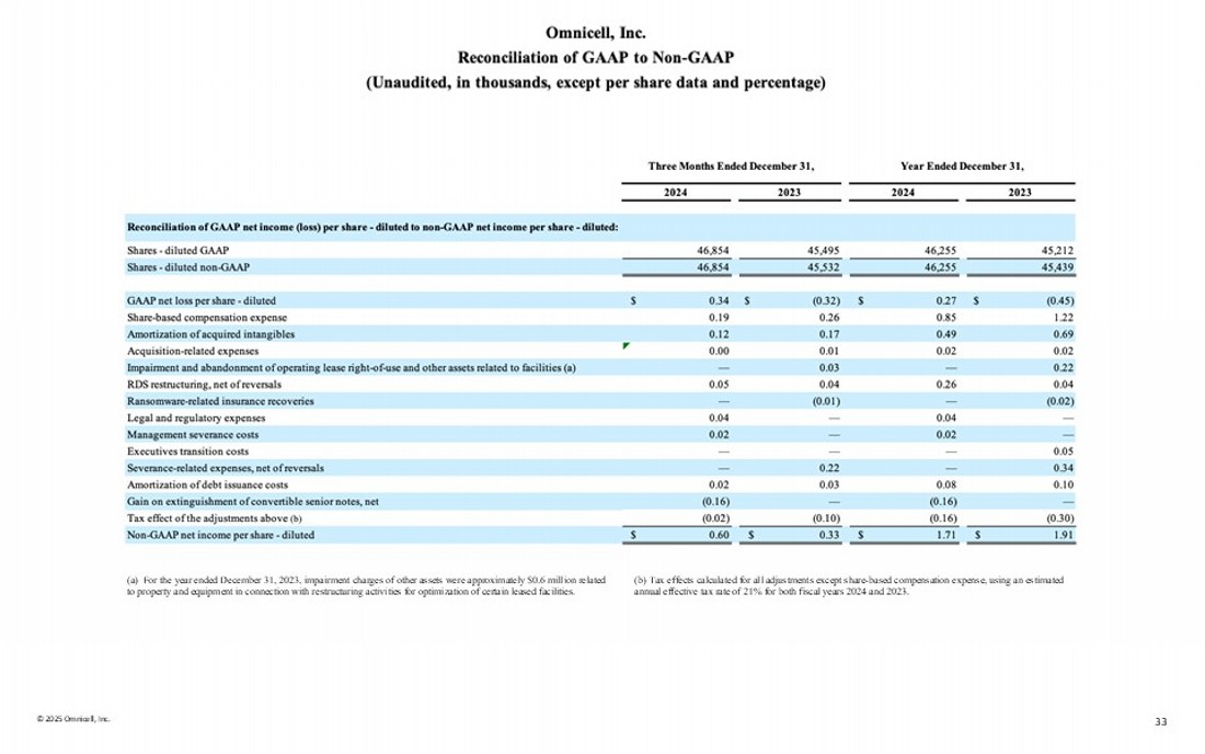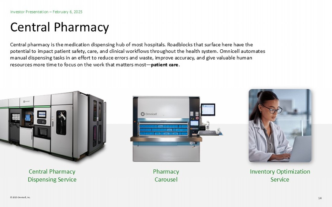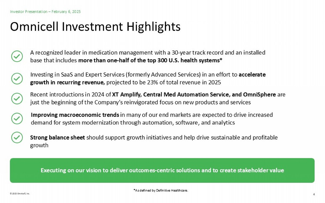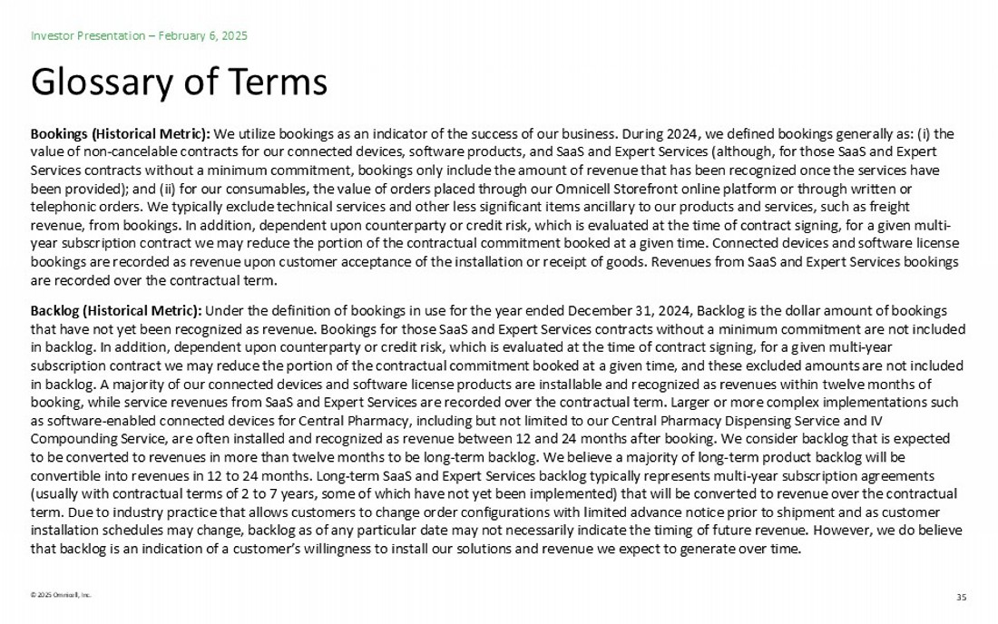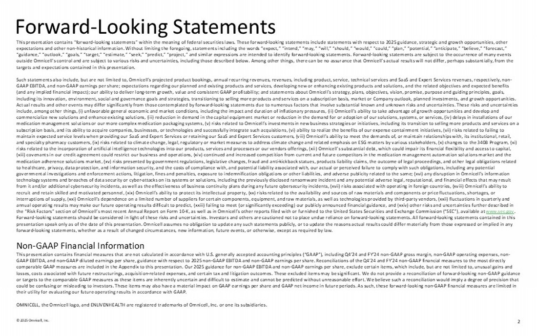To the extent any statements contained in this press release deal with information that is not historical, these statements are “forward-looking statements” within the meaning of the Private Securities Litigation Reform Act of 1995. Without limiting the foregoing, statements including the words “expect,” “intend,” “may,” “will,” “should,” “would,” “could,” “plan,” “potential,” “anticipate,” “believe,” “forecast,” “guidance,” “outlook,” “goals,” “target,” “estimate,” “seek,” “predict,” “project,” and similar expressions are intended to identify forward-looking statements. Forward-looking statements are subject to the occurrence of many events outside Omnicell’s control. Such statements include, but are not limited to, Omnicell’s projected product bookings, revenues, including product, service, technical services and SaaS and Expert Services revenues, annual recurring revenue, non-GAAP EBITDA, and non-GAAP earnings per share; expectations regarding our products and services and developing new or enhancing existing products and solutions and the related objectives and expected benefits (and any implied financial impact); our ability to drive long-term growth and consistent GAAP profitability; and statements about Omnicell’s strategy, plans, objectives, promise and purpose, goals, opportunities, and market or Company outlook. Actual results and other events may differ significantly from those contemplated by forward-looking statements due to numerous factors that involve substantial known and unknown risks and uncertainties. These risks and uncertainties include, among other things, (i) unfavorable general economic and market conditions, including the impact and duration of inflationary pressures, (ii) Omnicell’s ability to take advantage of growth opportunities and develop and commercialize new solutions and enhance existing solutions, (iii) reduction in demand in the capital equipment market or reduction in the demand for or adoption of our solutions, systems, or services, (iv) delays in installations of our medication management solutions or our more complex medication packaging systems, (v) risks related to Omnicell’s investments in new business strategies or initiatives, including its transition to selling more products and services on a subscription basis, and its ability to acquire companies, businesses, or technologies and successfully integrate such acquisitions, (vi) ability to realize the benefits of our expense containment initiatives, (vii) risks related to failing to maintain expected service levels when providing our SaaS and Expert Services or retaining our SaaS and Expert Services customers, (viii) Omnicell’s ability to meet the demands of, or maintain relationships with, its institutional, retail, and specialty pharmacy customers, (ix) risks related to climate change, legal, regulatory or market measures to address climate change and related emphasis on ESG matters by various stakeholders, (x) changes to the 340B Program, (xi) risks related to the incorporation of artificial intelligence technologies into our products, services and processes or our vendors offerings, (xii) Omnicell’s substantial debt, which could impair its financial flexibility and access to capital, (xiii) covenants in our credit agreement could restrict our business and operations, (xiv) continued and increased competition from current and future competitors in the medication management automation solutions market and the medication adherence solutions market, (xv) risks presented by government regulations, legislative changes, fraud and anti-kickback statues, products liability claims, the outcome of legal proceedings, and other legal obligations related to healthcare, privacy, data protection, and information security, and the costs of compliance with, and potential liability associated with, our actual or perceived failure to comply with such obligations, including any potential governmental investigations and enforcement actions, litigation, fines and penalties, exposure to indemnification obligations or other liabilities, and adverse publicity related to the same; (xvi) any disruption in Omnicell’s information technology systems and breaches of data security or cyber-attacks on its systems or solutions, including the previously disclosed ransomware incident and any potential adverse legal, reputational, and financial effects that may result from it and/or additional cybersecurity incidents, as well as the effectiveness of business continuity plans during any future cybersecurity incidents, (xvii) risks associated with operating in foreign countries, (xviii) Omnicell’s ability to recruit and retain skilled and motivated personnel, (xix) Omnicell’s ability to protect its intellectual property, (xx) risks related to the availability and sources of raw materials and components or price fluctuations, shortages, or interruptions of supply, (xxi) Omnicell’s dependence on a limited number of suppliers for certain components, equipment, and raw materials, as well as technologies provided by third-party vendors, (xxii) fluctuations in quarterly and annual operating results may make our future operating results difficult to predict, (xxiii) failing to meet (or significantly exceeding) our publicly announced financial guidance, and (xxiv) other risks and uncertainties further described in the “Risk Factors” section of Omnicell’s most recent Annual Report on Form 10-K, as well as in Omnicell’s other reports filed with or furnished to the United States Securities and Exchange Commission (“SEC”), available at www.sec.gov. Forward-looking statements should be considered in light of these risks and uncertainties. Investors and others are cautioned not to place undue reliance on forward-looking statements. All forward-looking statements contained in this press release speak only as of the date of this