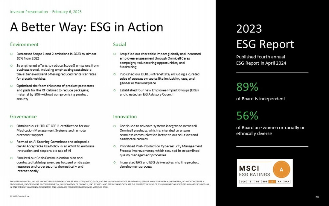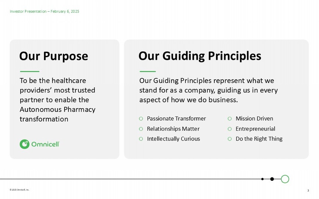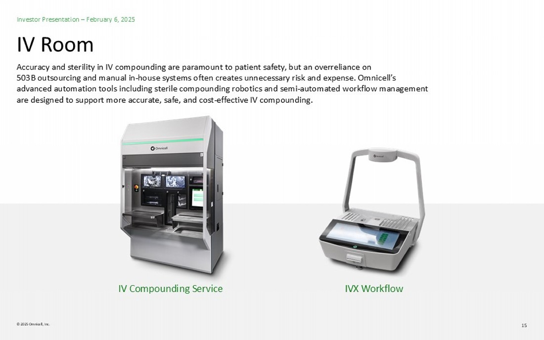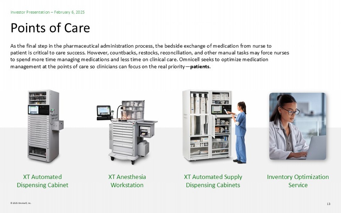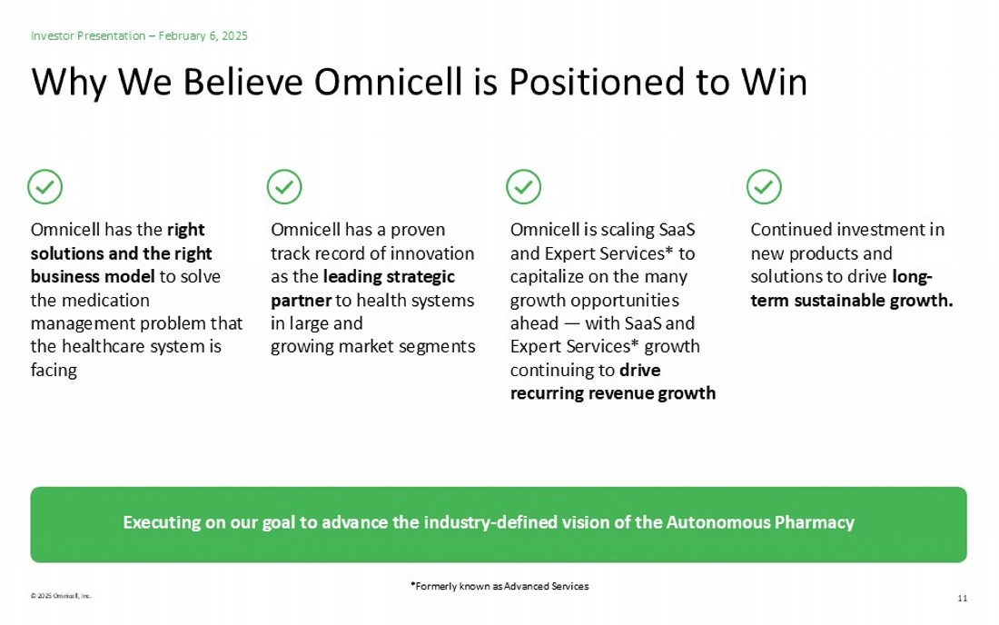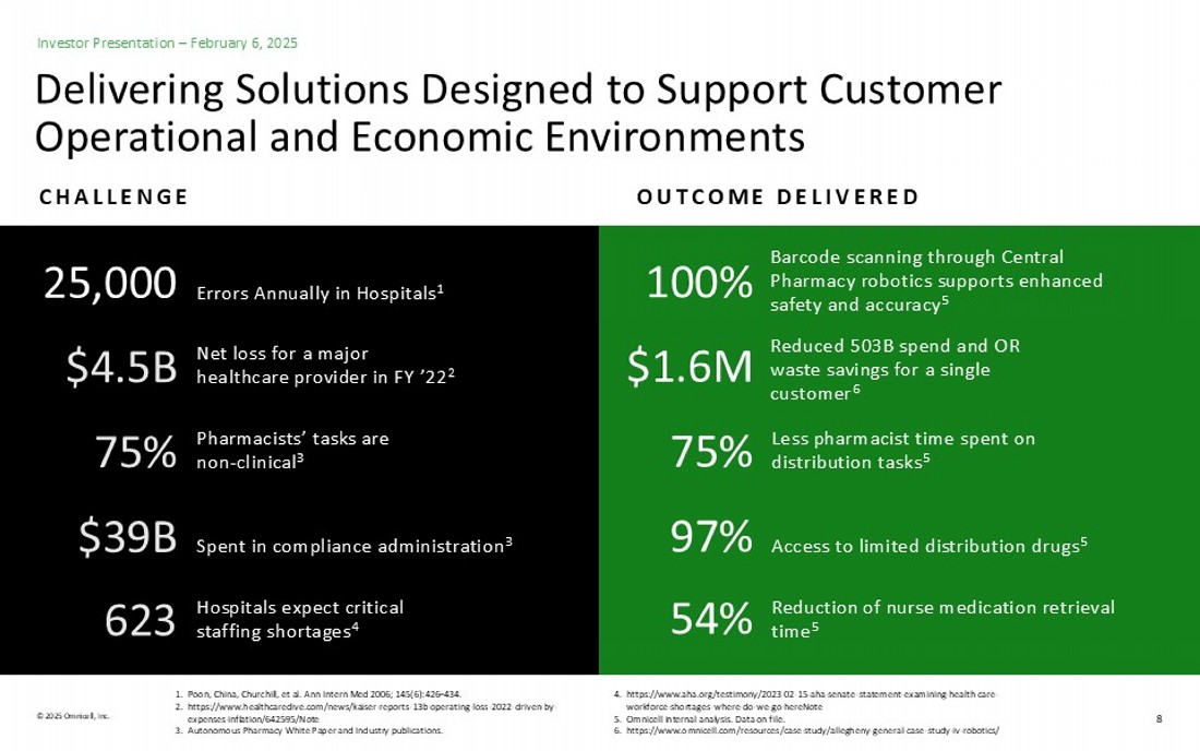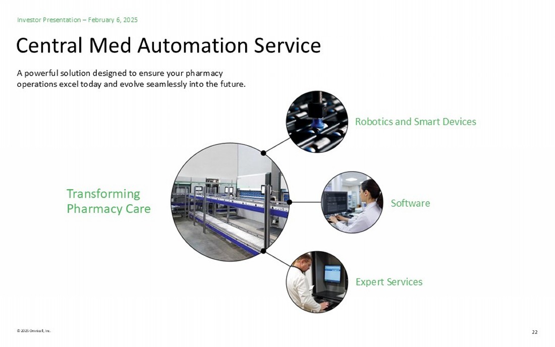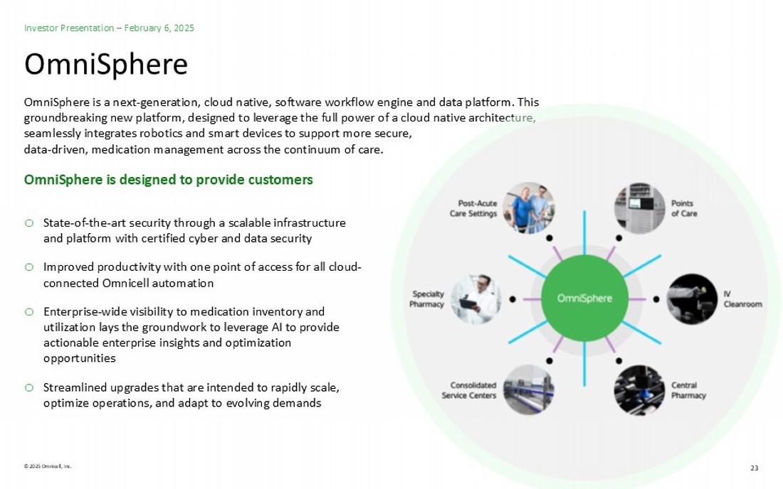 オムニセルは、本日2025年2月6日(木)午前8時30分(米国東部時間)より、2024年第4四半期および年末の業績に関する電話会議を開催いたします。カンファレンスコールは、米国内では(800) 715-9871、海外では(646) 307-1963にダイヤルしてモニターすることができます。カンファレンスIDは2515873。ライブおよびアーカイブのウェブキャストへのリンクは、オムニセルのウェブサイトの投資家向け情報セクション(https://ir.omnicell.com/events-and-presentations/)でもご覧いただけます。