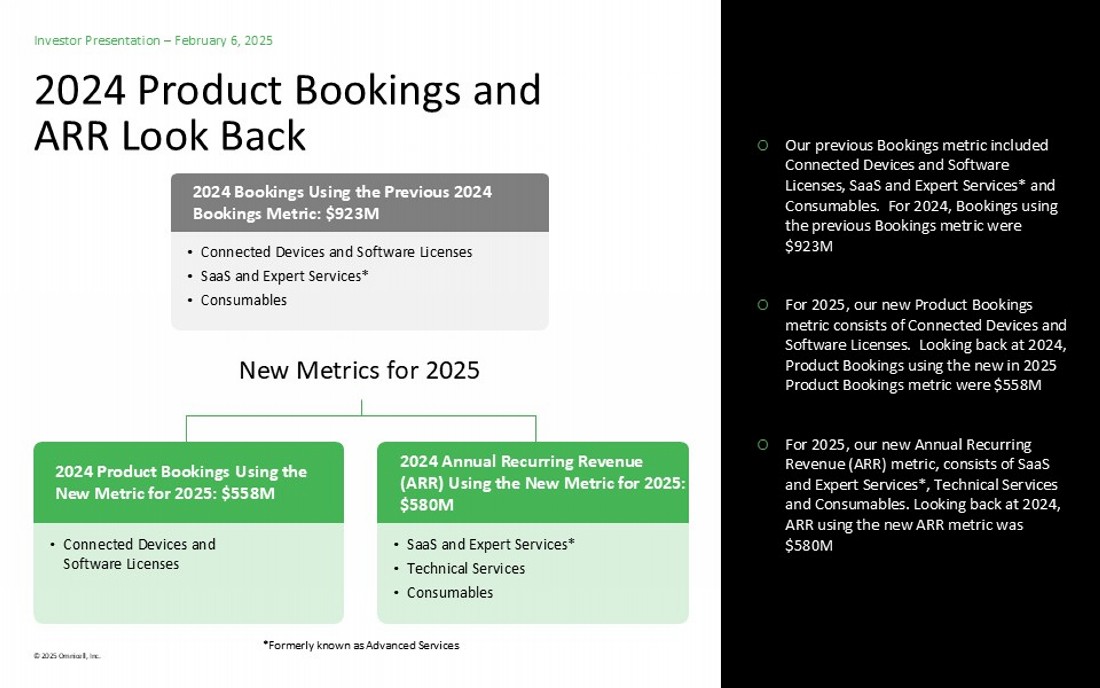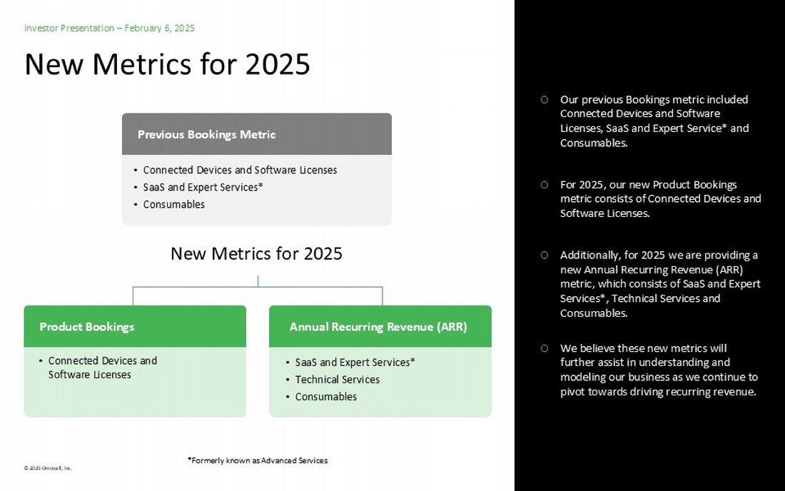 | (1) | 当社は、事業の成功を示す指標として予約実績を活用している。2024年中、当社は一般的に予約件数を次のように定義した:(i)当社のコネクテッドデバイス、ソフトウェア製品、SaaSおよびエキスパートサービスに関する解約不能な契約の価値(ただし、最低コミットメントを伴わないSaaSおよびエキスパートサービス契約については、サービスが提供された時点で認識された収益額のみを含む)、および(ii)当社の消耗品については、当社のオムニセル・ストアフロント・オンラインプラットフォームを通じて、または書面もしくは電話による注文の価値。当社は通常、技術サービスや、運賃収入など、当社の製品およびサービスに付随する重要性の低いものを計上から除外しています。また、契約締結時に評価される取引先や信用リスクに応じて、複数年のサブスクリプション契約について、ある時点で計上される契約上のコミットメントの一部を削減することがあります。接続機器およびソフトウェア・ライセンスの計上は、顧客が設置または商品を受領した時点で収益として計上される。SaaSおよびエキスパート・サービスの売上は、契約期間にわたって計上される。 |