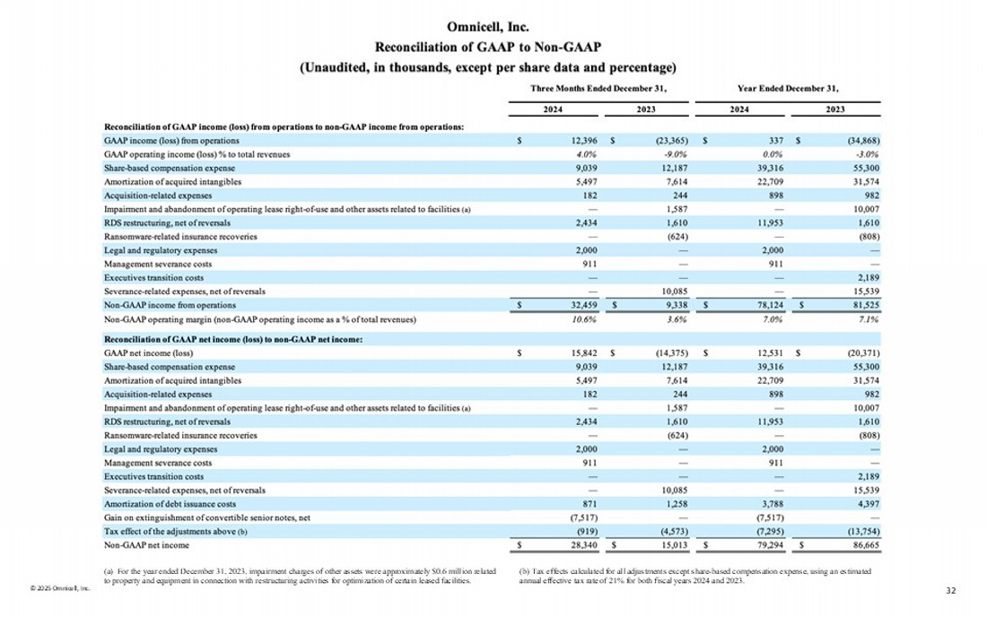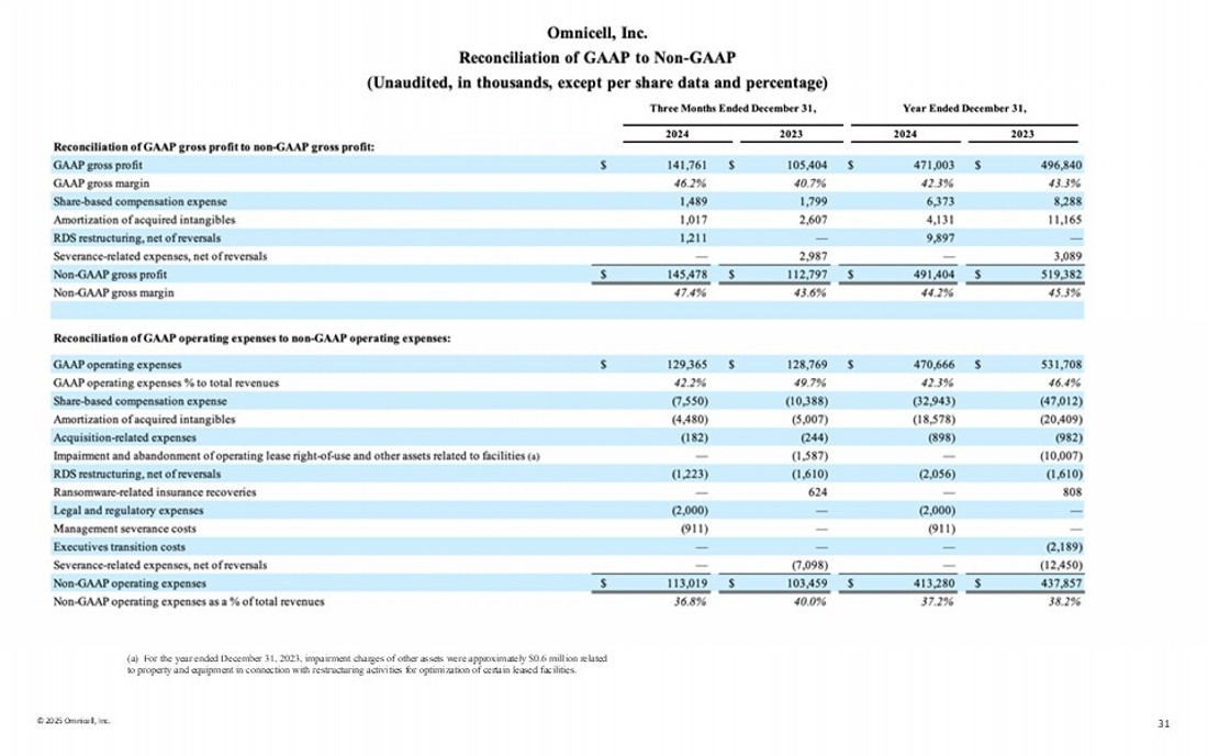 本プレスリリースには、米国で一般に認められた会計原則(GAAP)に準拠して算出されていない財務指標が含まれています。経営陣は、さまざまな業績指標を用いて評価し、経営上の意思決定を行っています。オムニセルのGAAP業績に加えて、当社は非GAAP売上総利益、非GAAP売上総利益率、非GAAP営業費用、非GAAP営業利益、非GAAP営業利益率、非GAAP純利益、非GAAP希薄化後1株当たり純利益、非GAAP希薄化後株式、非GAAP EBITDA、非GAAP EBITDAマージン、非GAAPフリーキャッシュフローも考慮しています。これらの非GAAPベースの業績および指標は、売上高、売上総利益、営業費用、営業利益、当期純利益、希薄化後1株当たり当期純利益、希薄化後株式、営業活動から得た純現金、またはGAAPに準拠して算出されたその他の業績指標の代替とみなされるべきではありません。当社がこれらの非GAAP業績および指標を提示するのは、経営陣がこれらをオムニセルの業績を補足する重要な指標とみなし、オムニセルの戦略および事業を分析する際にかかる指標を参照するためです。