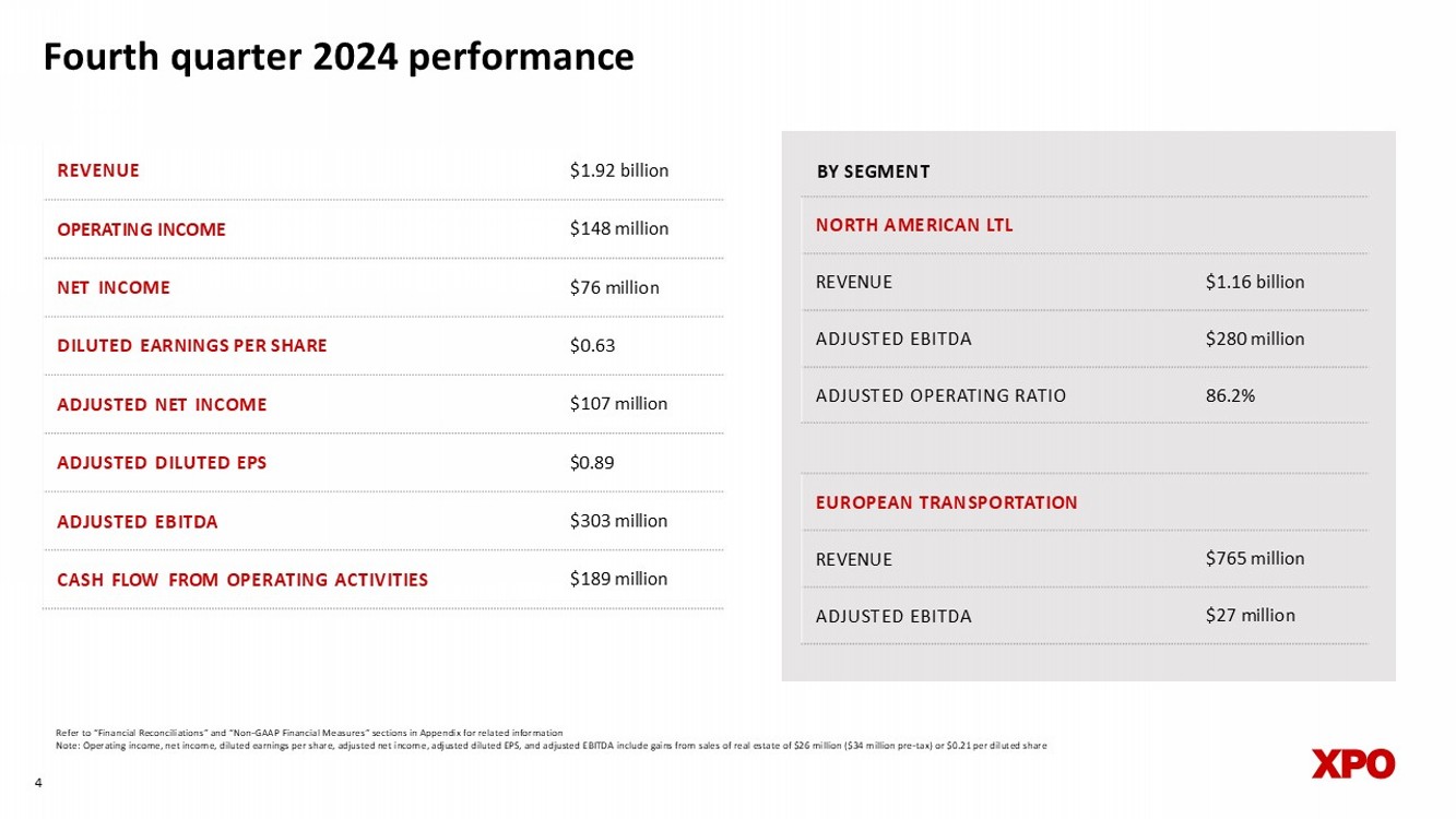 Fourth quarter 2024 highlights $148 million of operating income, up 24% YoY $303 million of adjusted EBITDA, up 15% YoY $0.89 of adjusted diluted EPS 1 , up 16% YoY LTL adjusted operating ratio of 86.2%, improved by 30 bps YoY LTL adjusted EBITDA of $280 million, up 20% YoY LTL purchased transportation expense reduced by 47% YoY LTL yield, excluding fuel, up 6.3% YoY LTL revenue per shipment, excluding fuel, up 5.8% YoY LTL damage claims ratio of 0.2% Improved full - year LTL adjusted OR by 260 bps, better than our target range 1 Diluted earnings from continuing operations per share Refer to “Financial Reconciliations” and “Non - GAAP Financial Measures” sections in Appendix for related information 3 4 Fourth quarter 2024 performance $1.92 billion REVENUE $148 million OPERATING INCOME $76 million NET INCOME $0.63 DILUTED EARNINGS PER SHARE $107 million ADJUSTED NET INCOME $ 0.89 ADJUSTED DILUTED EPS $ 303 million ADJUSTED EBITDA $189 million CASH FLOW FROM OPERATING ACTIVITIES NORTH AMERICAN LTL $1.16 billion REVENUE $280 million ADJUSTED EBITDA 86.2% ADJUSTED OPERATING RATIO Refer to “Financial Reconciliations” and “Non - GAAP Financial Measures” sections in Appendix for related information Note: Operating income, net income, diluted earnings per share, adjusted net income, adjusted diluted EPS, and adjusted EBITD A i nclude gains from sales of real estate of $26 million ($34 million pre - tax) or $0.21 per diluted share EUROPEAN TRANSPORTATION $765 million REVENUE $27 million ADJUSTED EBITDA BY SEGMENT