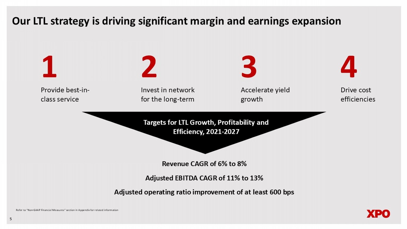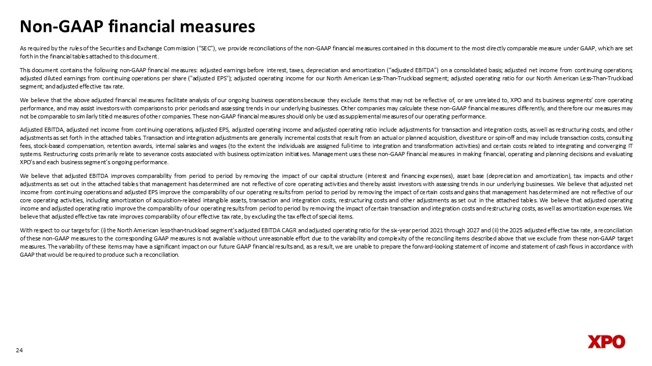 dNon - GAAP financial measures As required by the rules of the Securities and Exchange Commission (“SEC”), we provide reconciliations of the non - GAAP financial measures contained in this document to the most directly comparable measure under GAAP, which are set forth in the financial tables attached to this document . This document contains the following non - GAAP financial measures : adjusted earnings before interest, taxes, depreciation and amortization (“adjusted EBITDA”) on a consolidated basis ; adjusted net income from continuing operations ; adjusted diluted earnings from continuing operations per share ("adjusted EPS") ; adjusted operating income for our North American Less - Than - Truckload segment ; adjusted operating ratio for our North American Less - Than - Truckload segment ; and adjusted effective tax rate . We believe that the above adjusted financial measures facilitate analysis of our ongoing business operations because they exclude items that may not be reflective of, or are unrelated to, XPO and its business segments’ core operating performance, and may assist investors with comparisons to prior periods and assessing trends in our underlying businesses . Other companies may calculate these non - GAAP financial measures differently, and therefore our measures may not be comparable to similarly titled measures of other companies . These non - GAAP financial measures should only be used as supplemental measures of our operating performance . Adjusted EBITDA, adjusted net income from continuing operations, adjusted EPS, adjusted operating income and adjusted operating ratio include adjustments for transaction and integration costs, as well as restructuring costs, and other adjustments as set forth in the attached tables . Transaction and integration adjustments are generally incremental costs that result from an actual or planned acquisition, divestiture or spin - off and may include transaction costs, consulting fees, stock - based compensation, retention awards, internal salaries and wages (to the extent the individuals are assigned full - time to integration and transformation activities) and certain costs related to integrating and converging IT systems . Restructuring costs primarily relate to severance costs associated with business optimization initiatives . Management uses these non - GAAP financial measures in making financial, operating and planning decisions and evaluating XPO’s and each business segment’s ongoing performance . We believe that adjusted EBITDA improves comparability from period to period by removing the impact of our capital structure (interest and financing expenses), asset base (depreciation and amortization), tax impacts and other adjustments as set out in the attached tables that management has determined are not reflective of core operating activities and thereby assist investors with assessing trends in our underlying businesses . We believe that adjusted net income from continuing operations and adjusted EPS improve the comparability of our operating results from period to period by removing the impact of certain costs and gains that management has determined are not reflective of our core operating activities, including amortization of acquisition - related intangible assets, transaction and integration costs, restructuring costs and other adjustments as set out in the attached tables . We believe that adjusted operating income and adjusted operating ratio improve the comparability of our operating results from period to period by removing the impact of certain transaction and integration costs and restructuring costs, as well as amortization expenses . We believe that adjusted effective tax rate improves comparability of our effective tax rate, by excluding the tax effect of special items . With respect to our targets for : ( i ) the North American less - than - truckload segment’s adjusted EBITDA CAGR and adjusted operating ratio for the six - year period 2021 through 2027 and (ii) the 2025 adjusted effective tax rate, a reconciliation of these non - GAAP measures to the corresponding GAAP measures is not available without unreasonable effort due to the variability and complexity of the reconciling items described above that we exclude from these non - GAAP target measures . The variability of these items may have a significant impact on our future GAAP financial results and, as a result, we are unable to prepare the forward - looking statement of income and statement of cash flows in accordance with GAAP that would be required to produce such a reconciliation . 24