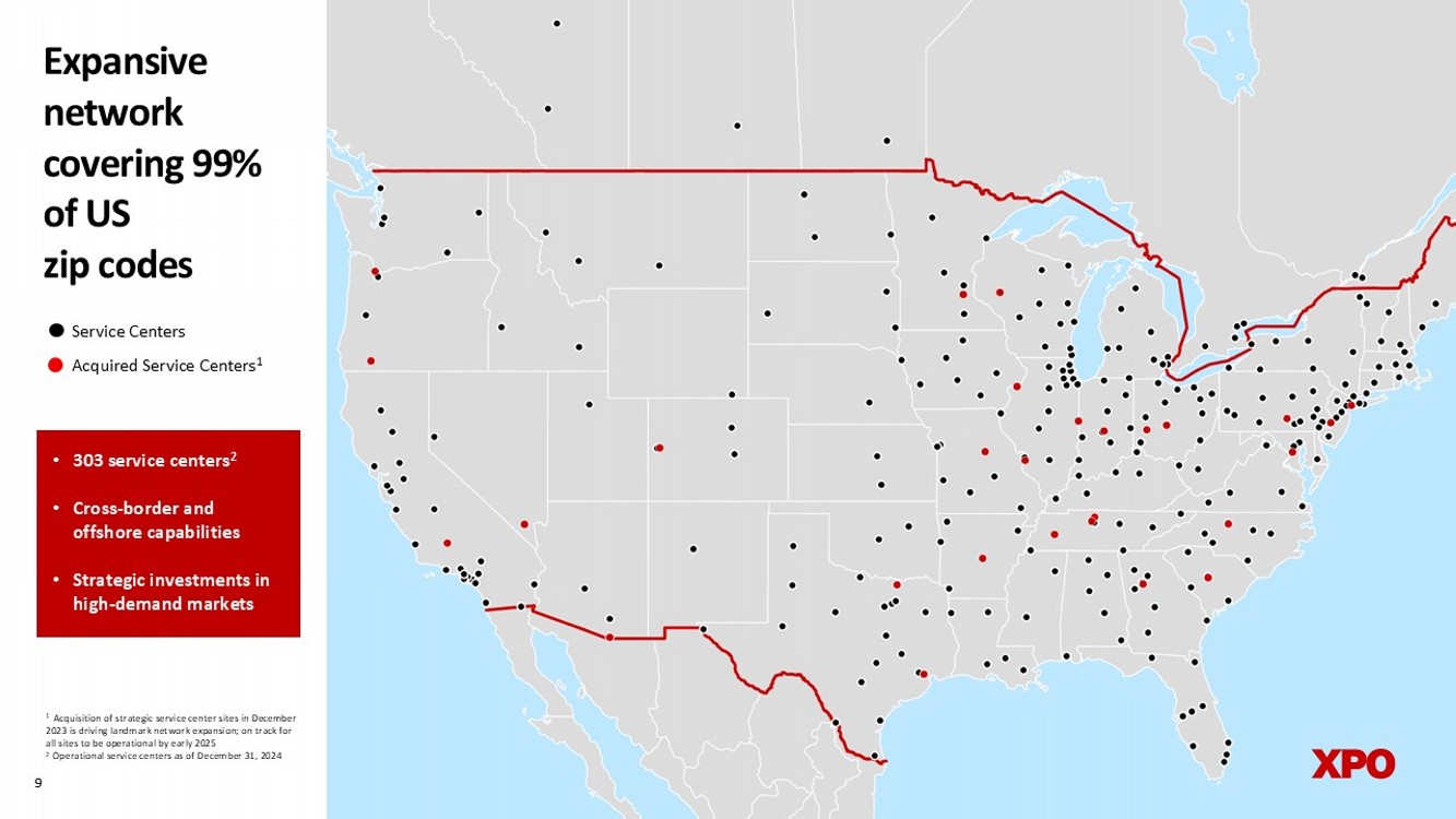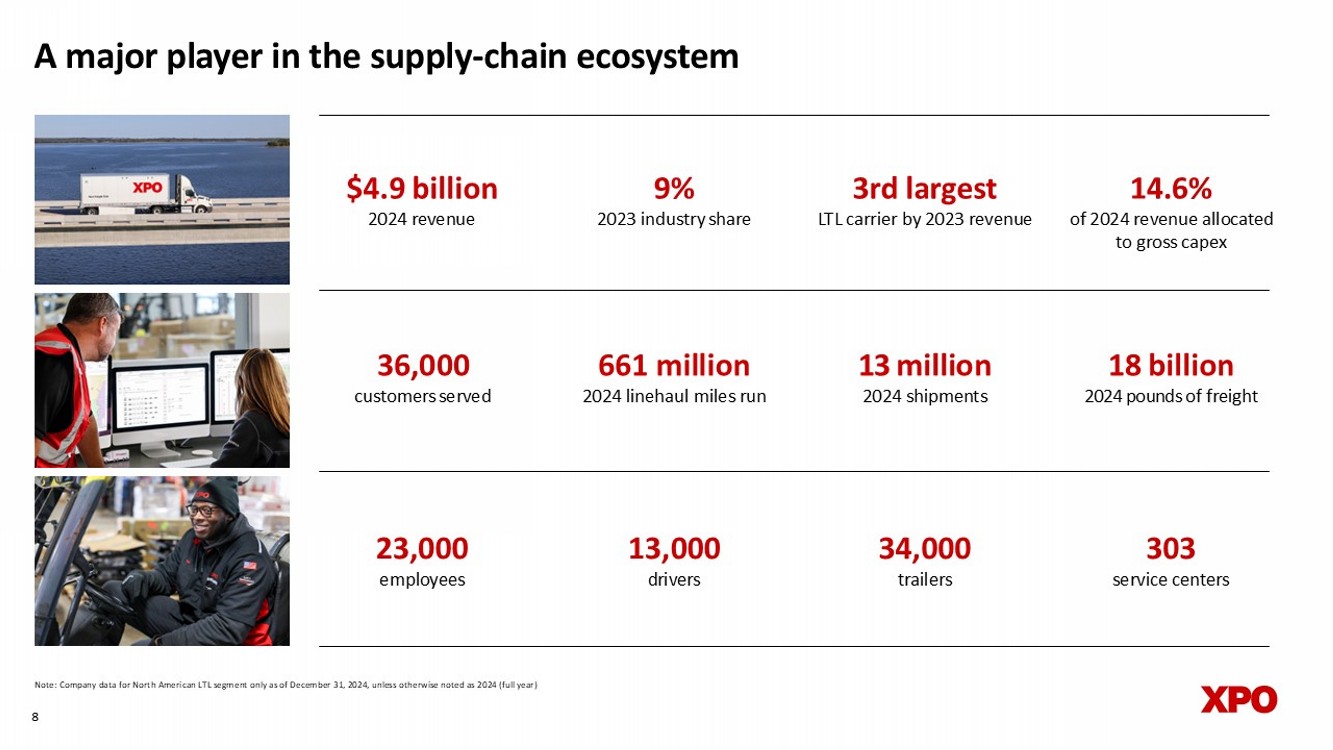 A leading carrier in a compelling industry • $52 billion bedrock industry for the US economy, with nearly 75% share held by top 10 LTL players • Diverse demand across verticals, with secular growth drivers • Attractive pricing environment for over a decade, with positive YoY industry pricing each year • Strong service quality is key gating factor for yield growth and margin expansion • Industry service center capacity stayed nearly flat for a decade 1 5% CAGR: North American LTL industry revenue Sources: Third - party research; company filings Note: Revenue CAGR for periods 2010 – 2023; industry size and market share data for 2023 1 US service centers, includes ARCB, FDX, ODFL, SAIA, XPO and YELL 7 A major player in the supply - chain ecosystem Note: Company data for North American LTL segment only as of December 31, 2024, unless otherwise noted as 2024 (full year) 3 rd largest LTL carrier by 2023 revenue 14.6% of 2024 revenue allocated to gross capex 13 million 2024 s hipments 36,000 customers served $4.9 billion 2024 revenue 9 % 2023 industry share 8 13,0 0 0 d rivers 34,0 0 0 t railers 18 billion 2024 pounds of freight 661 million 2024 l inehaul miles run 2 3 ,0 0 0 e mployees 303 service centers quarterly (bring back