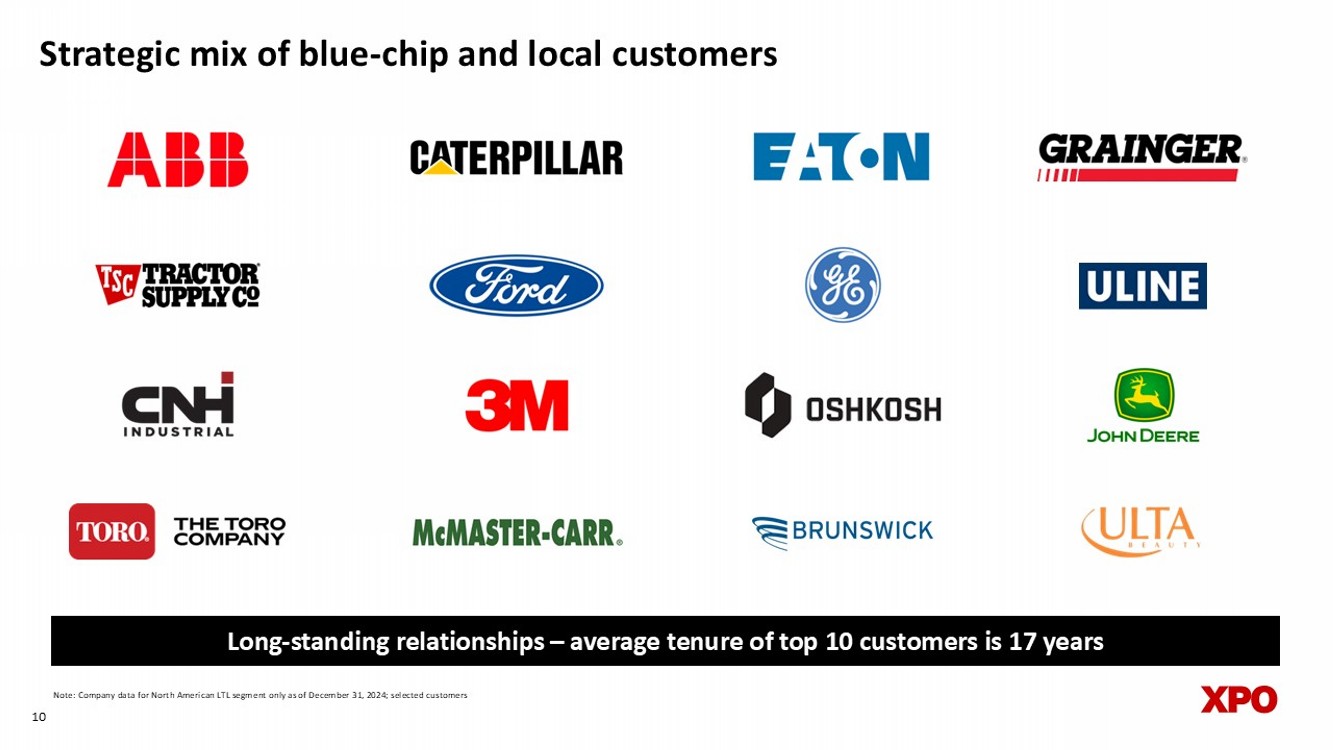 9 Expansive network covering 99% of US zip codes • 303 service centers 2 • Cross - border and offshore capabilities • Strategic investments in high - demand markets 1 Acquisition of strategic service center sites in December 2023 is driving landmark network expansion; on track for all sites to be operational by early 2025 2 Operational service centers as of December 31, 2024 Acquired Service Centers 1 Service Centers Strategic mix of blue - chip and local customers 10 Note: Company data for North American LTL segment only as of December 31, 2024; selected customers Long - standing relationships – average tenure of top 10 customers is 17 years