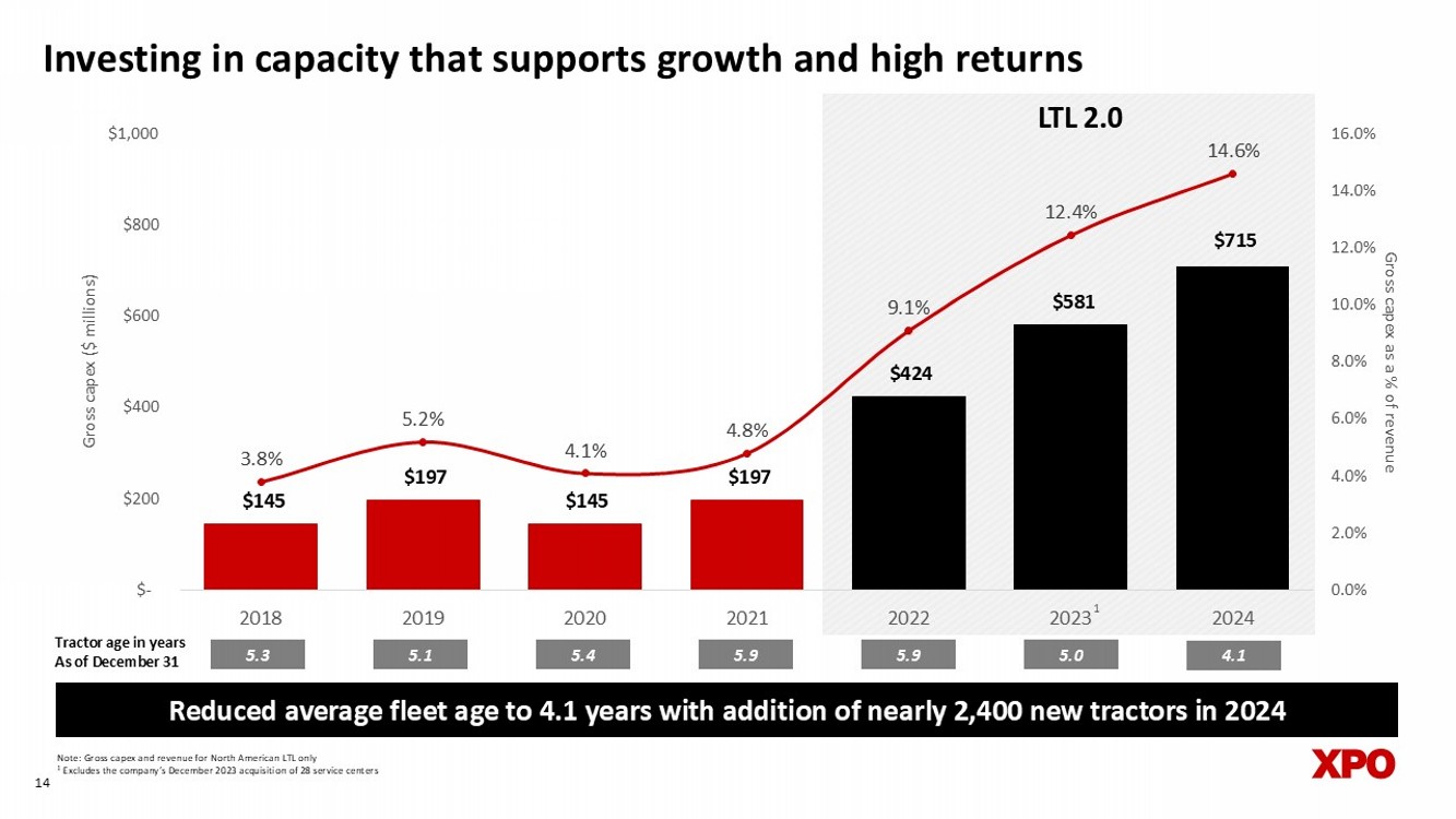 Provide best - in - class service Accelerate yield growth Drive cost efficiencies • Aligning price earned with increasing service excellence • Expanding accessorial revenue from value - add services • Growing share of higher - yielding local channel with scaled - up local salesforce • Insourcing linehaul miles to enhance service quality, network density and fluidity at lower cost • Using proprietary technology with predictive AI to improve labor productivity • Rationalizing corporate cost structure 12 Executing on four key levers • Strengthening the value we offer our customers through world - class service • Incentivizing employees to deliver outstanding service quality • Investing in new tools for field operations and enhancing training programs Invest in network for the long - term • Targeting capex of 8% to 12% of revenue on average through 2027 • Expanding linehaul fleet with tractors and in - house trailer manufacturing • Investing in capacity to further improve service and drive network efficiencies 1.1% 1.2% 1.1% 0.9% 0.9% 1.0% 1.0% 1.2% 1.1% 0.9% 0.9% 0.6% 0.7% 0.7% 0.4% 0.3% 0.3% 0.2% 0.2% 0.2% Q1 2020 Q2 2020 Q3 2020 Q4 2020 Q1 2021 Q2 2021 Q3 2021 Q4 2021 Q1 2022 Q2 2022 Q3 2022 Q4 2022 Q1 2023 Q2 2023 Q3 2023 Q4 2023 Q1 2024 Q2 2024 Q3 2024 Q4 2024 1 Based on claims payment data 2 Based on damage frequency data 13 Service initiatives have driven over 80% improvement in damages 2 since Q4’21 Delivering meaningful service improvements Damage claims declining as a % of LTL revenue 1 LTL 2.0