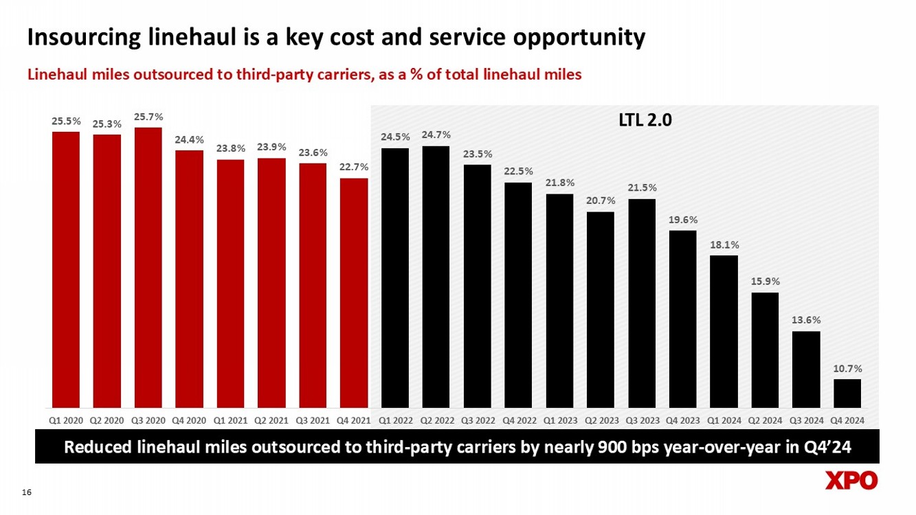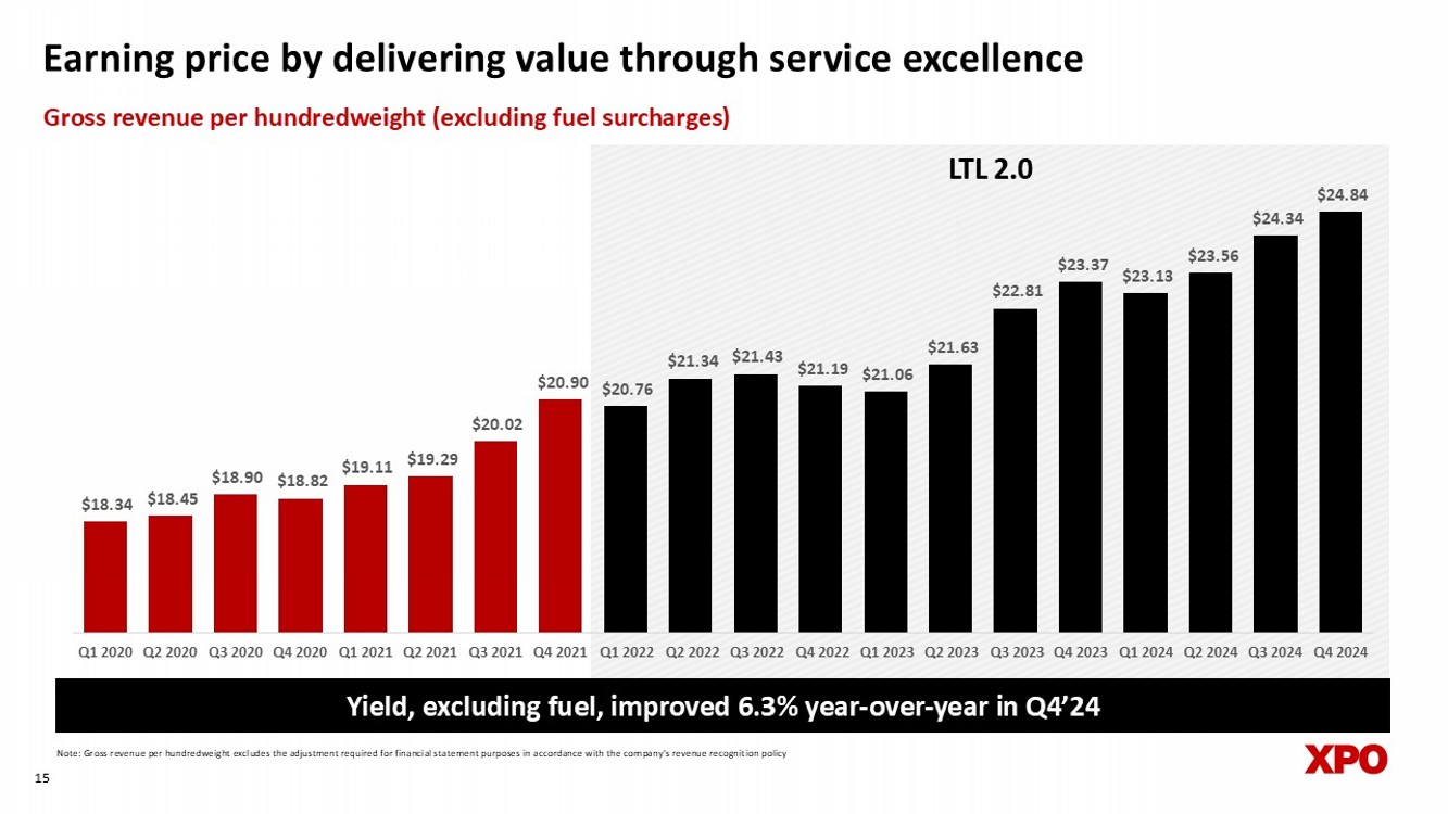 $145 $197 $145 $197 $424 $581 $715 3.8% 5.2% 4.1% 4.8% 9.1% 12.4% 14.6% 0.0% 2.0% 4.0% 6.0% 8.0% 10.0% 12.0% 14.0% 16.0% $- $200 $400 $600 $800 $1,000 2018 2019 2020 2021 2022 2023 2024 Gross capex as a % of revenue Gross capex ($ millions) Investing in capacity that supports growth and high returns 14 Tractor age in years As of December 31 5.3 5.1 5.4 5.9 5.9 Note: Gross capex and revenue for North American LTL only 1 Excludes the company’s December 2023 acquisition of 28 service centers 5.0 1 Reduced average fleet age to 4.1 years with addition of nearly 2,400 new tractors in 2024 4.1 LTL 2.0 $18.34 $18.45 $18.90 $18.82 $19.11 $19.29 $20.02 $20.90 $20.76 $21.34 $21.43 $21.19 $21.06 $21.63 $22.81 $23.37 $23.13 $23.56 $24.34 $24.84 Q1 2020 Q2 2020 Q3 2020 Q4 2020 Q1 2021 Q2 2021 Q3 2021 Q4 2021 Q1 2022 Q2 2022 Q3 2022 Q4 2022 Q1 2023 Q2 2023 Q3 2023 Q4 2023 Q1 2024 Q2 2024 Q3 2024 Q4 2024 Earning price by delivering value through service excellence 15 Note: Gross revenue per hundredweight excludes the adjustment required for financial statement purposes in accordance with th e c ompany's revenue recognition policy Yield, excluding fuel, improved 6.3% year - over - year in Q4’24 Gross revenue per hundredweight (excluding fuel surcharges) LTL 2.0