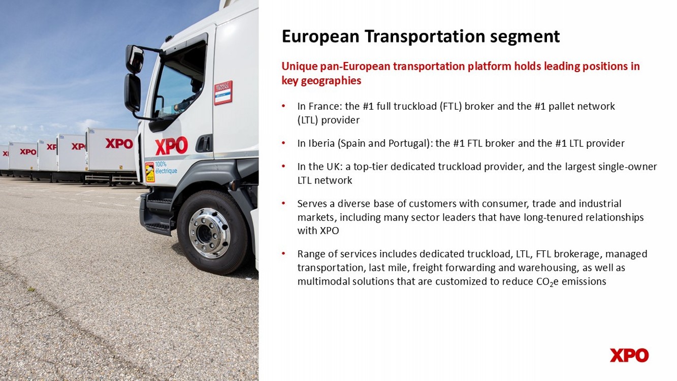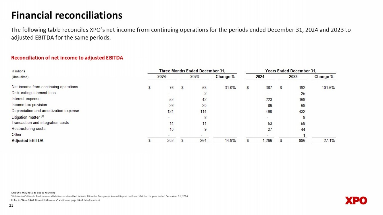 European Transportation segment • In France: the #1 full truckload (FTL) broker and the #1 pallet network (LTL) provider • In Iberia (Spain and Portugal): the #1 FTL broker and the #1 LTL provider • In the UK: a top - tier dedicated truckload provider, and the largest single - owner LTL network • Serves a diverse base of customers with consumer, trade and industrial markets, including many sector leaders that have long - tenured relationships with XPO • Range of services includes dedicated truckload, LTL, FTL brokerage, managed transportation, last mile, freight forwarding and warehousing, as well as multimodal solutions that are customized to reduce CO 2 e emissions Unique pan - European transportation platform holds leading positions in key geographies 19 19 Financial reconciliations The following table reconciles XPO’s net income from continuing operations for the periods ended December 31, 2024 and 2023 t o adjusted EBITDA for the same periods.