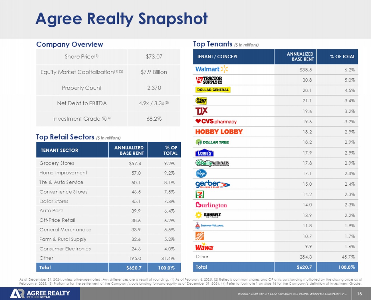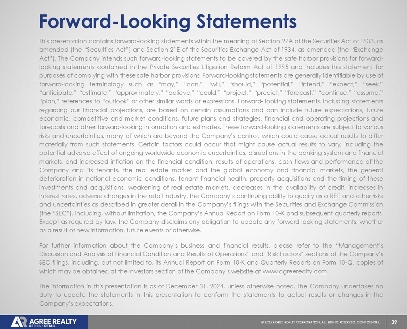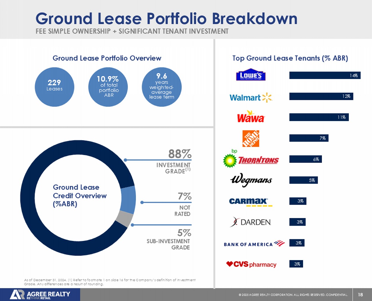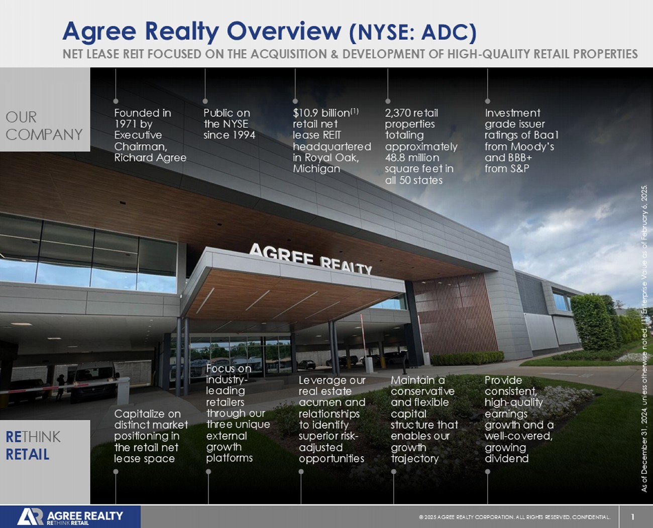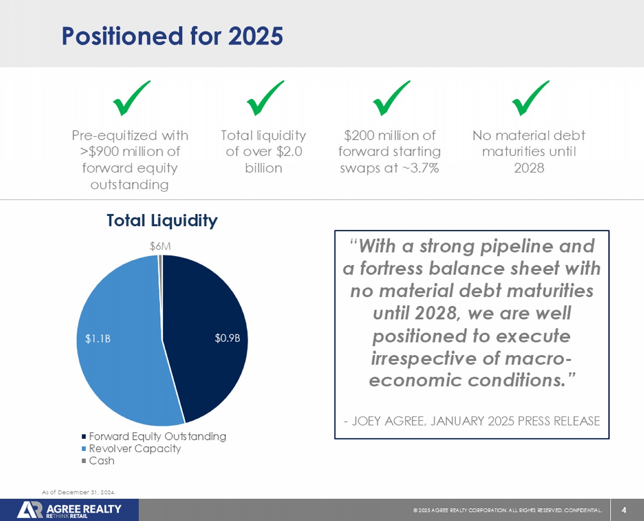 ミシガン州ロイヤルオーク、2025年2月11日 -- アグリー・リアルティ・コーポレーション(NYSE: ADC)(以下「当社」)は本日、2024年12月31日に終了した四半期および通期の業績を発表しました。ここに記載されている一株当たりの金額は、特に断りのない限り、すべて希薄化後の普通株式一株当たりの金額です。