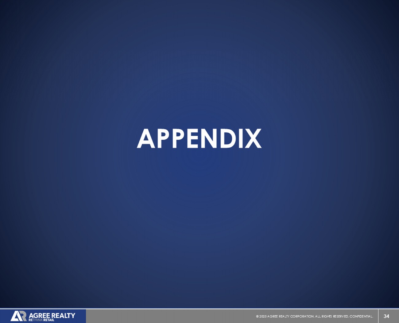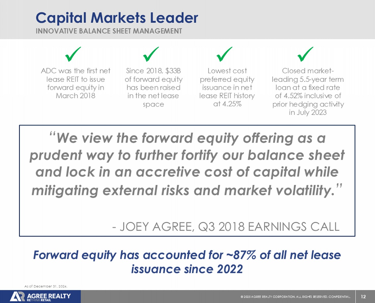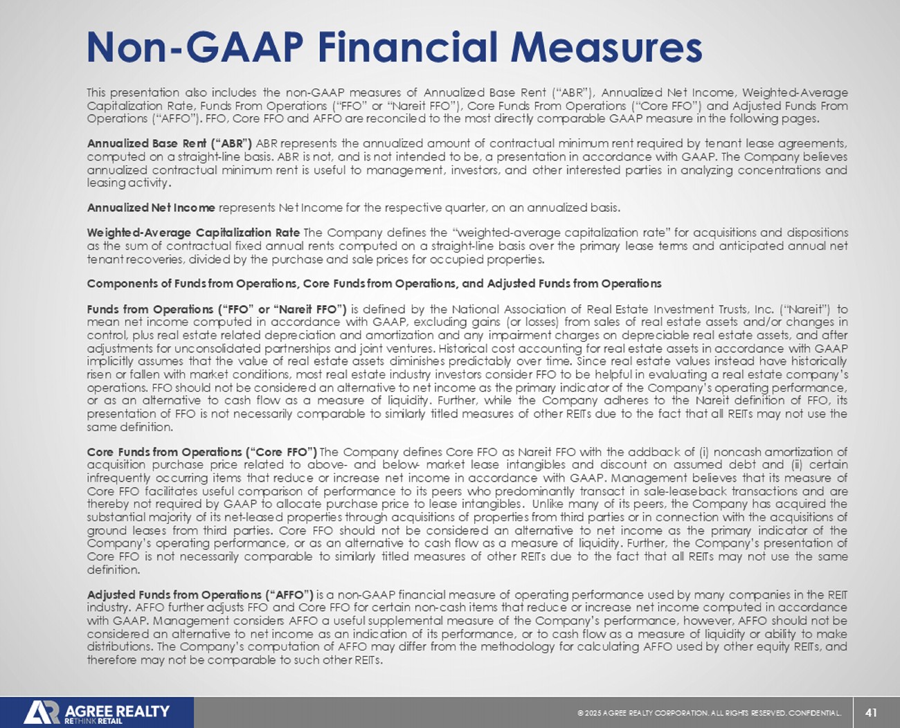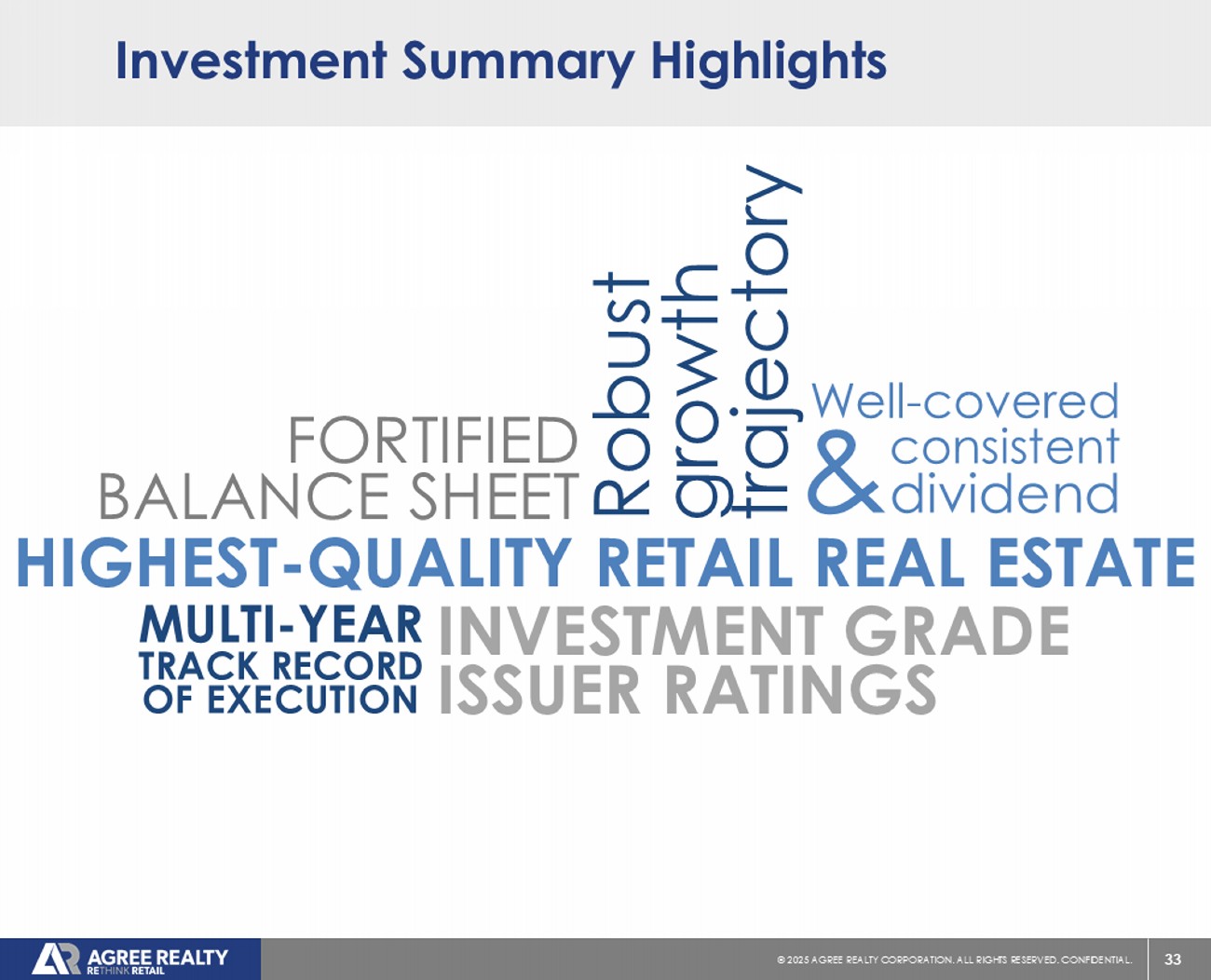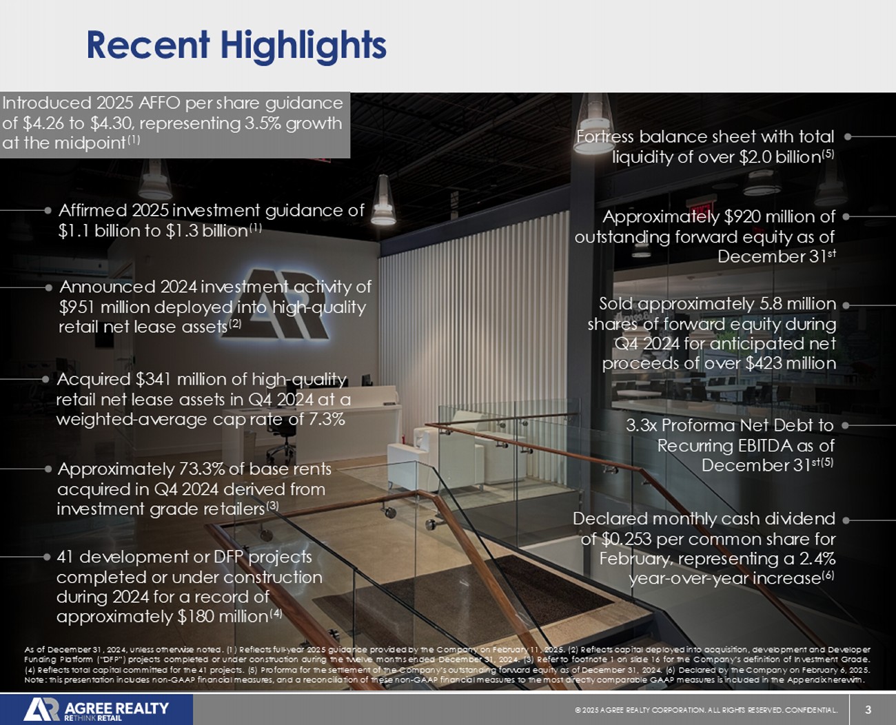 ミシガン州ロイヤルオーク、2025年2月11日 -- アグリー・リアルティ・コーポレーション(NYSE: ADC)(以下「当社」)は本日、2024年12月31日に終了した四半期および通期の業績を発表しました。ここに記載されている一株当たりの金額は、特に断りのない限り、すべて希薄化後の普通株式一株当たりの金額です。