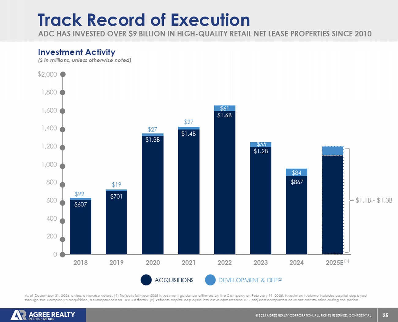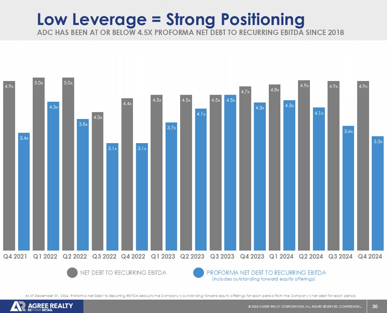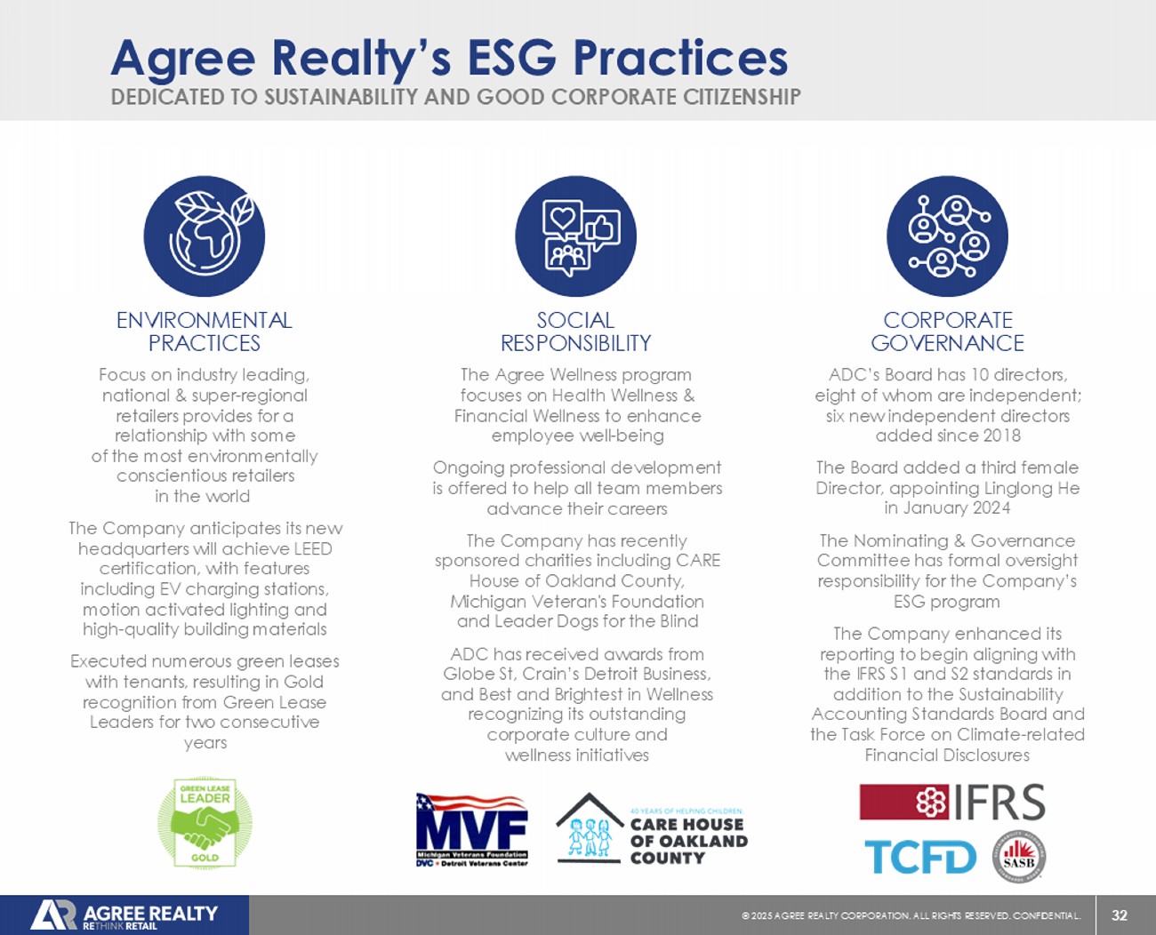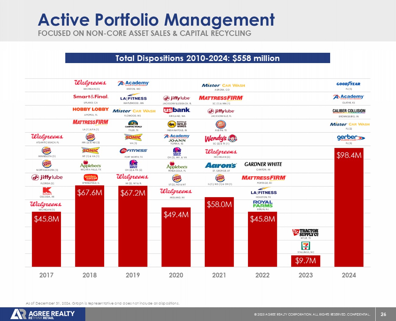 ミシガン州ロイヤルオーク、2025年2月11日 -- アグリー・リアルティ・コーポレーション(NYSE: ADC)(以下「当社」)は本日、2024年12月31日に終了した四半期および通期の業績を発表しました。ここに記載されている一株当たりの金額は、特に断りのない限り、すべて希薄化後の普通株式一株当たりの金額です。