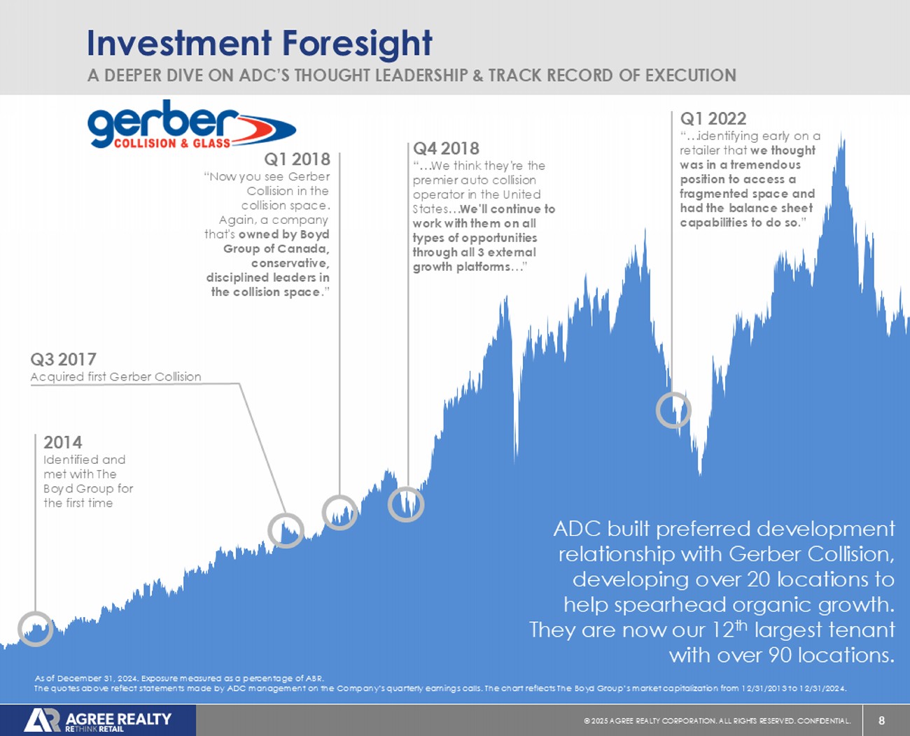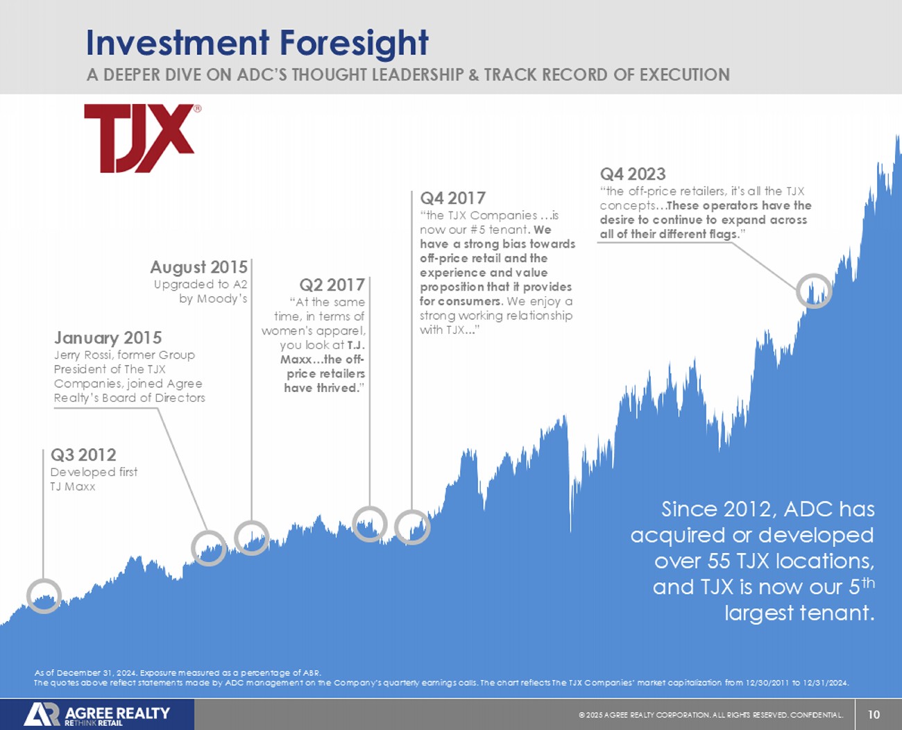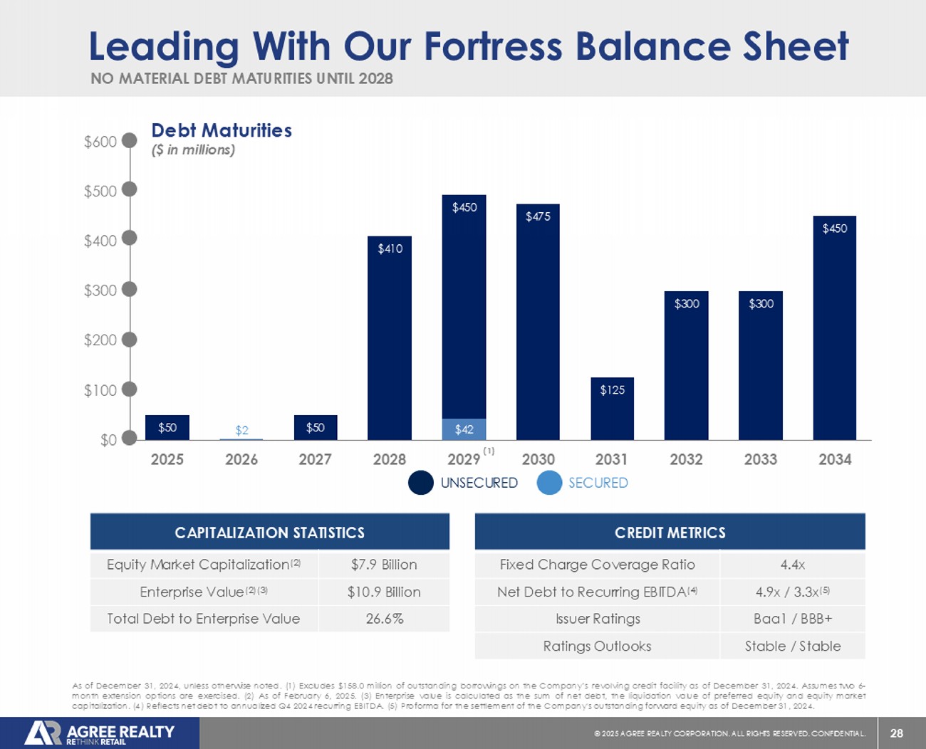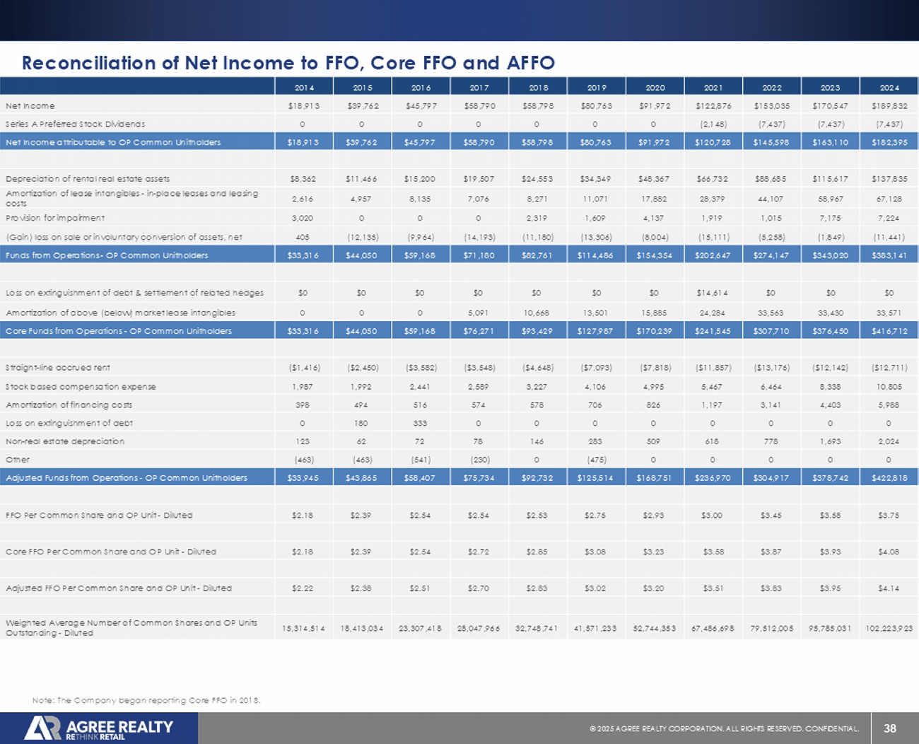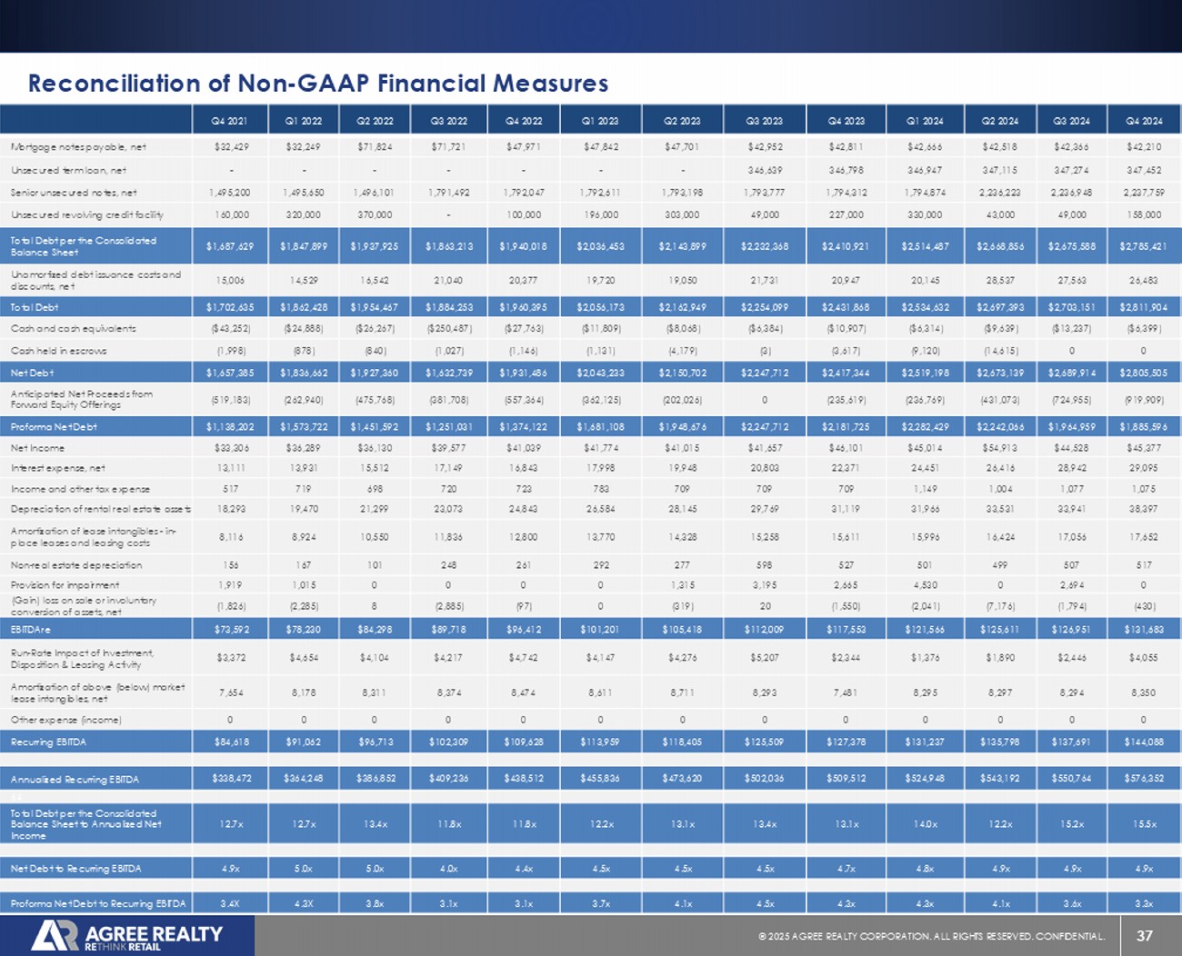 ミシガン州ロイヤルオーク、2025年2月11日 -- アグリー・リアルティ・コーポレーション(NYSE: ADC)(以下「当社」)は本日、2024年12月31日に終了した四半期および通期の業績を発表しました。ここに記載されている一株当たりの金額は、特に断りのない限り、すべて希薄化後の普通株式一株当たりの金額です。