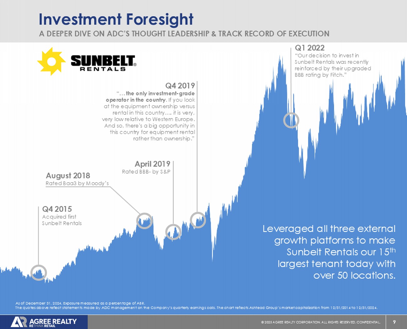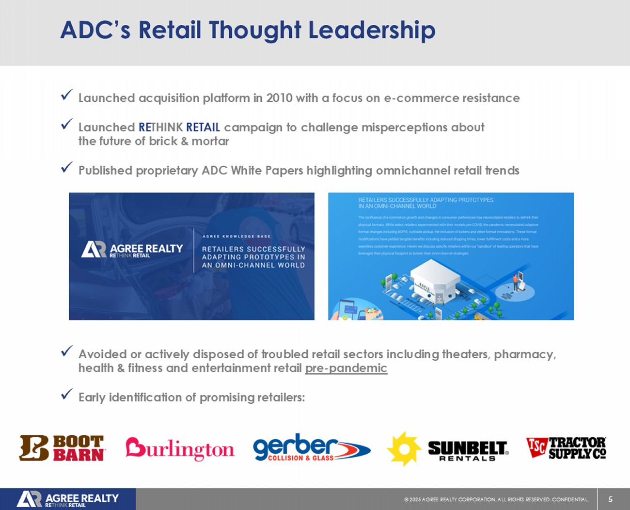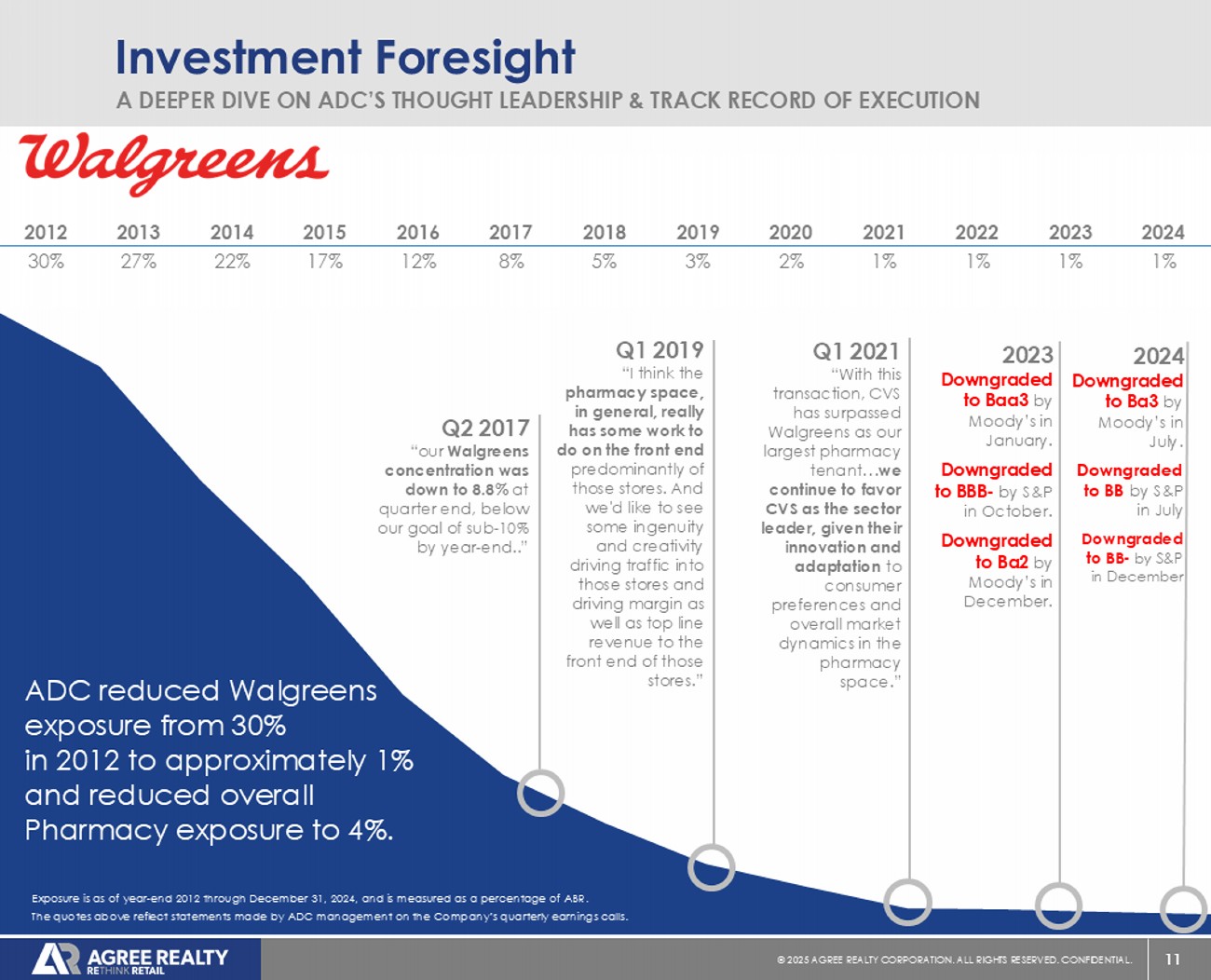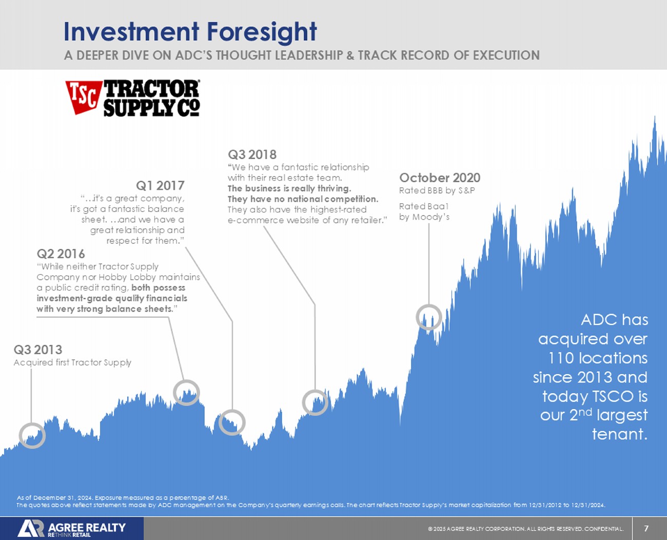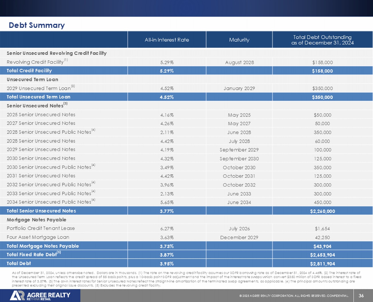 ミシガン州ロイヤルオーク、2025年2月11日 -- アグリー・リアルティ・コーポレーション(NYSE: ADC)(以下「当社」)は本日、2024年12月31日に終了した四半期および通期の業績を発表しました。ここに記載されている一株当たりの金額は、特に断りのない限り、すべて希薄化後の普通株式一株当たりの金額です。
